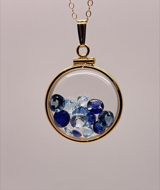 14k Solid Gold 22 mm Handmade Shaker Locket Filled with 6cttw. Sappire, London Blue Topaz, Sky Blue Topaz.