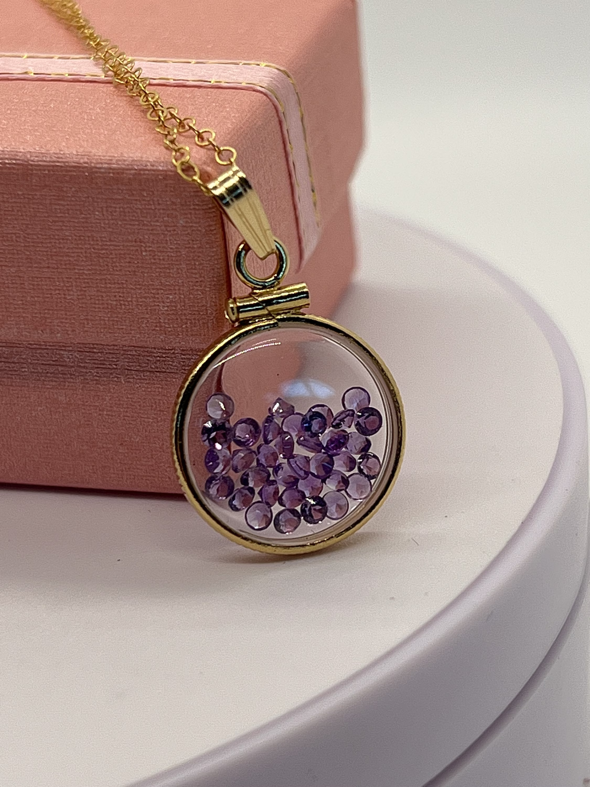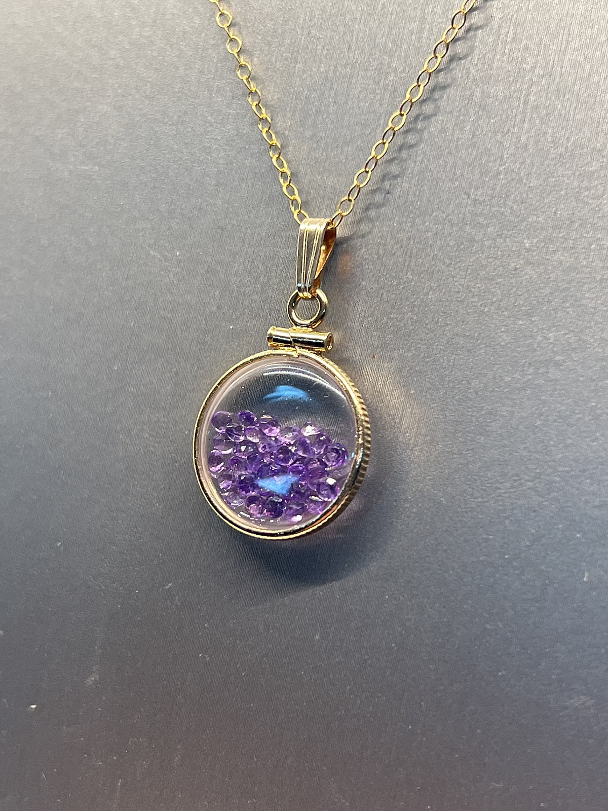 Up for sale: A 16 mm diminutive sized Handmade 14k SOLID gold shaker locket with 1.15 Carats TW of beautiful 2 mm genuine purple faceted amethyst. If your birthstone is Amethyst born in February or you just like eye catching jewelry, then this locket is for you. These lockets can be opened with a small screwdriver. These are new and comprised of a solid 14k gold bezel and two lucite (acrylic) covers and a 8mm gold filled snap bail. Add a new 18-24 inch 14k gold filled cable chain at checkout. You can also order with a solid 14k gold snap bail. This shaker locket can be viewed from both sides. I can also custom create and build a locket of your design. Choose custom create at check out and let me know what gem mix you would like in the locket. Custom created price will include 2 free rebuilds to make sure you love your creation before we ship.