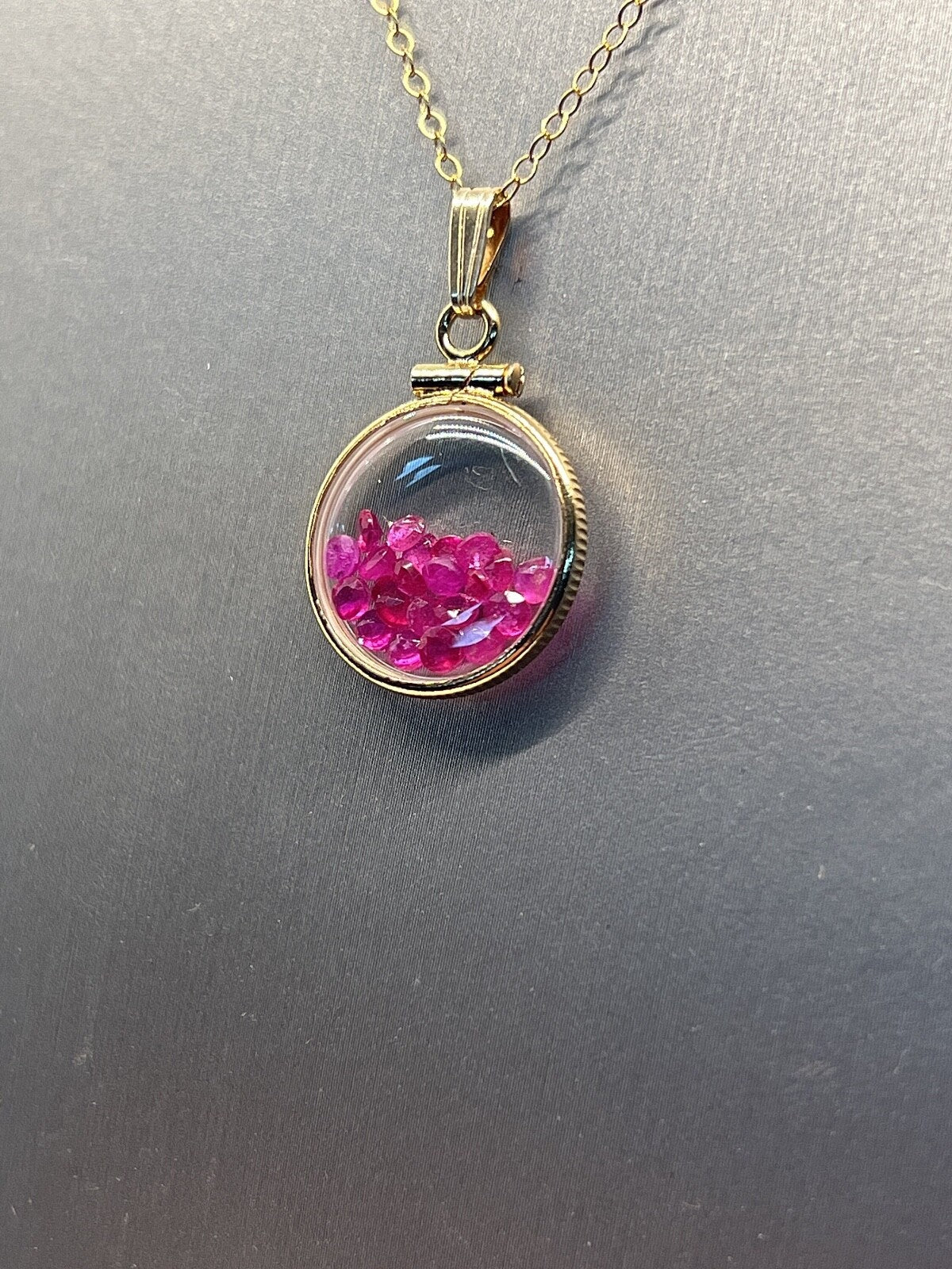 Up for sale: A 16 mm diminitive sized solid 14k gold shaker locket glowing red with July's birthstone gems inside. If your birthstone is Ruby (birthstone for July) or you just like cool eye catching jewelry, then this locket is for you. These are new and comprised of a solid 14k gold bezel and two lucite (acrylic) covers and a 8mm gold filled snap bail. Add a new 18-24 inch 14k gold filled cable chain at checkout. You can also order with a solid 14k gold snap bail. This shaker locket can be viewed from both sides. I can also custom create and build a locket of your design. Let me know.