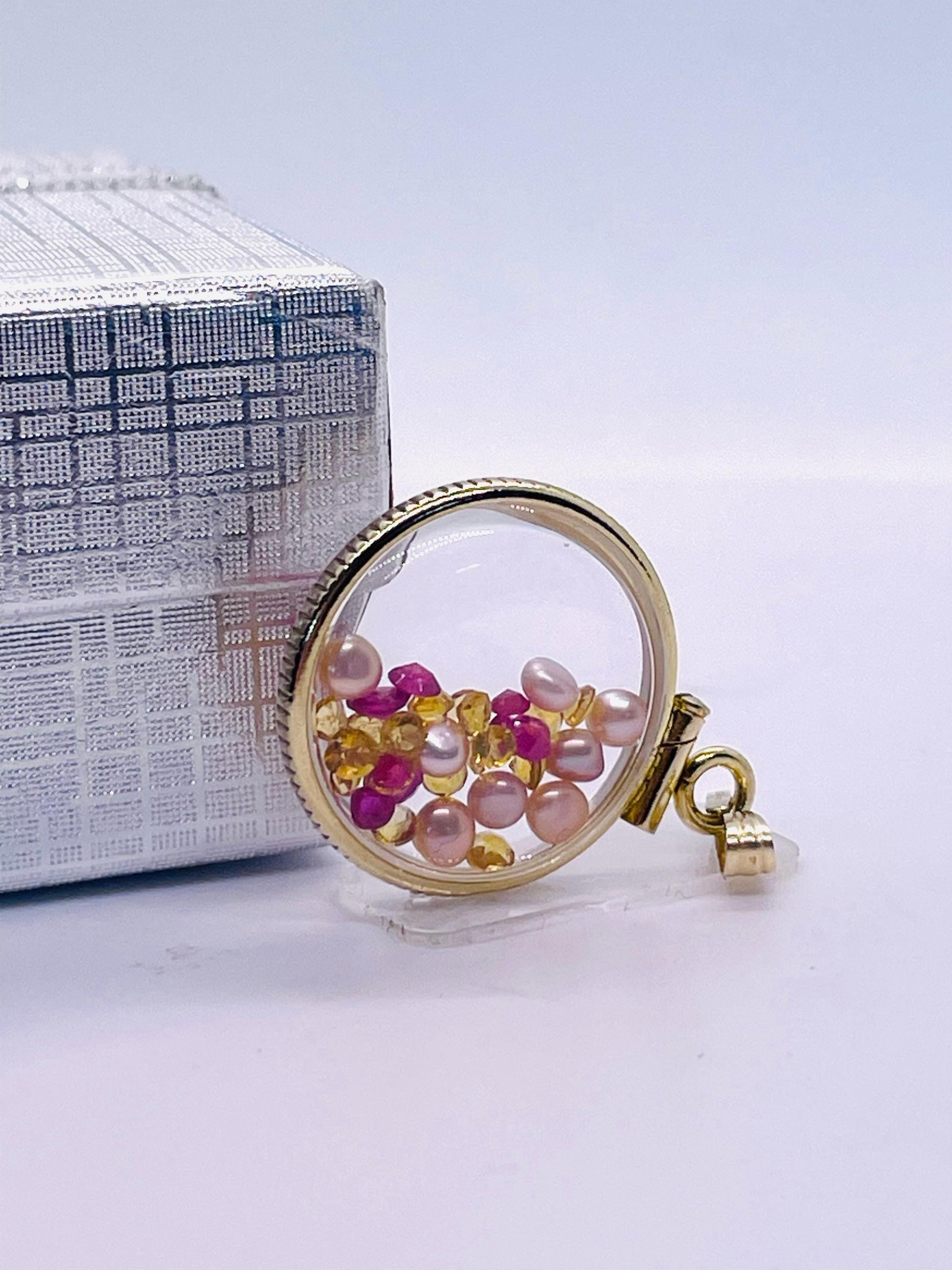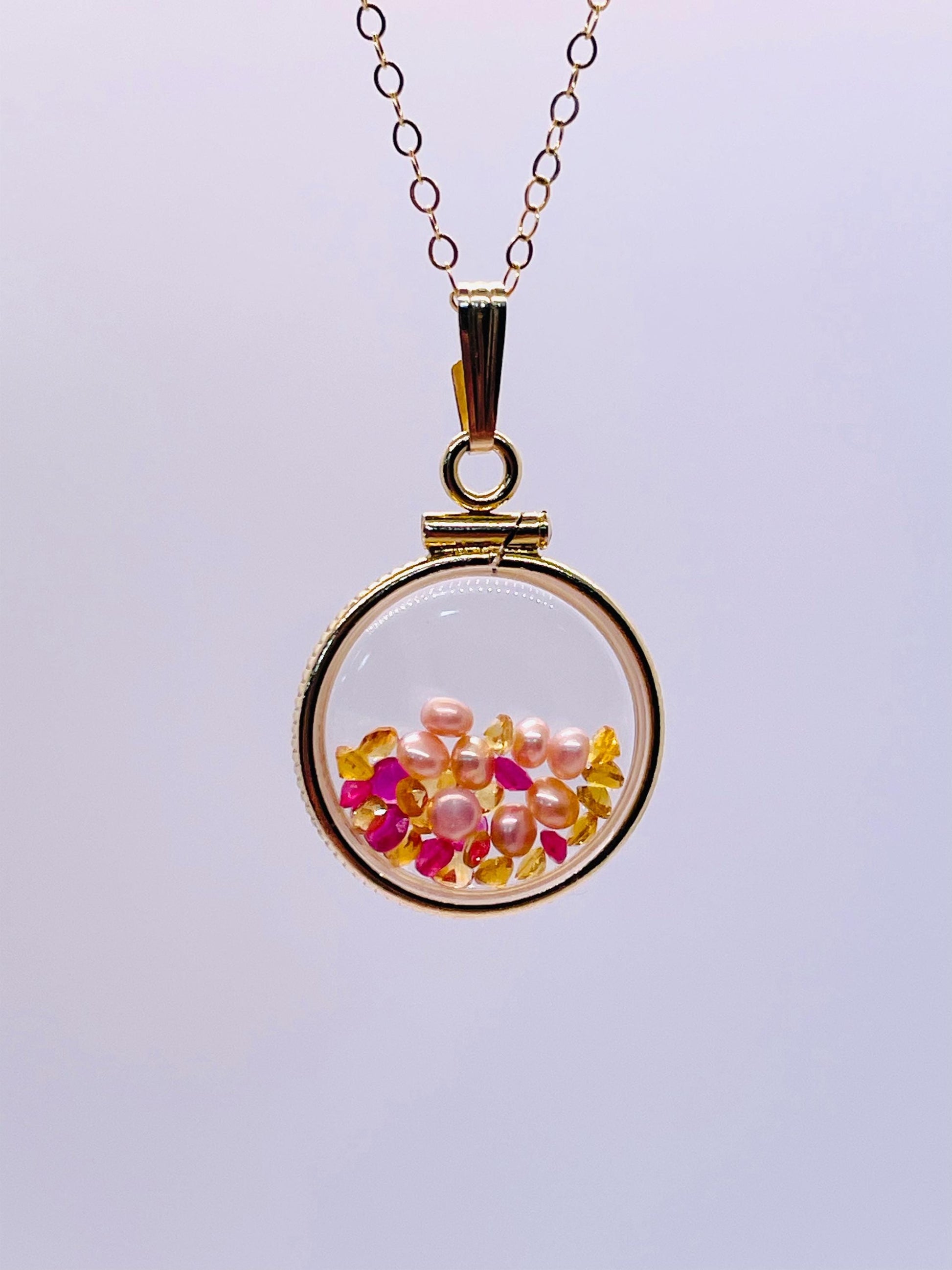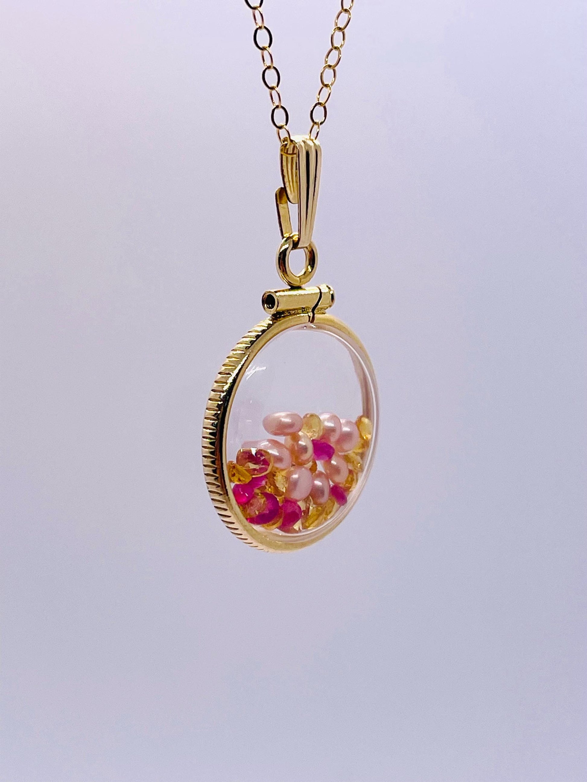 14k Solid Gold Handmade Dime size ruby, citrine, pearl shaker locket artistic series, beautiful mix