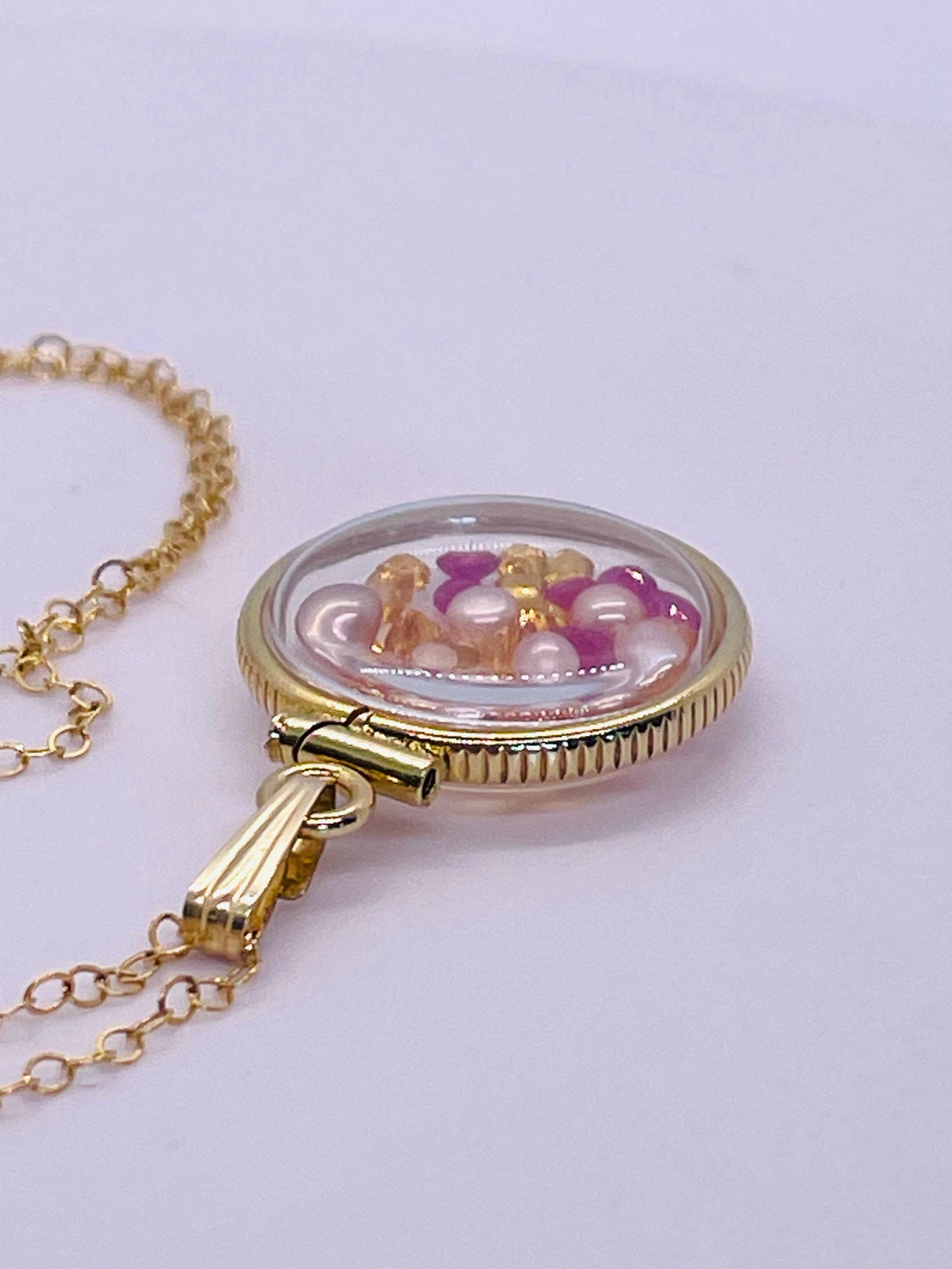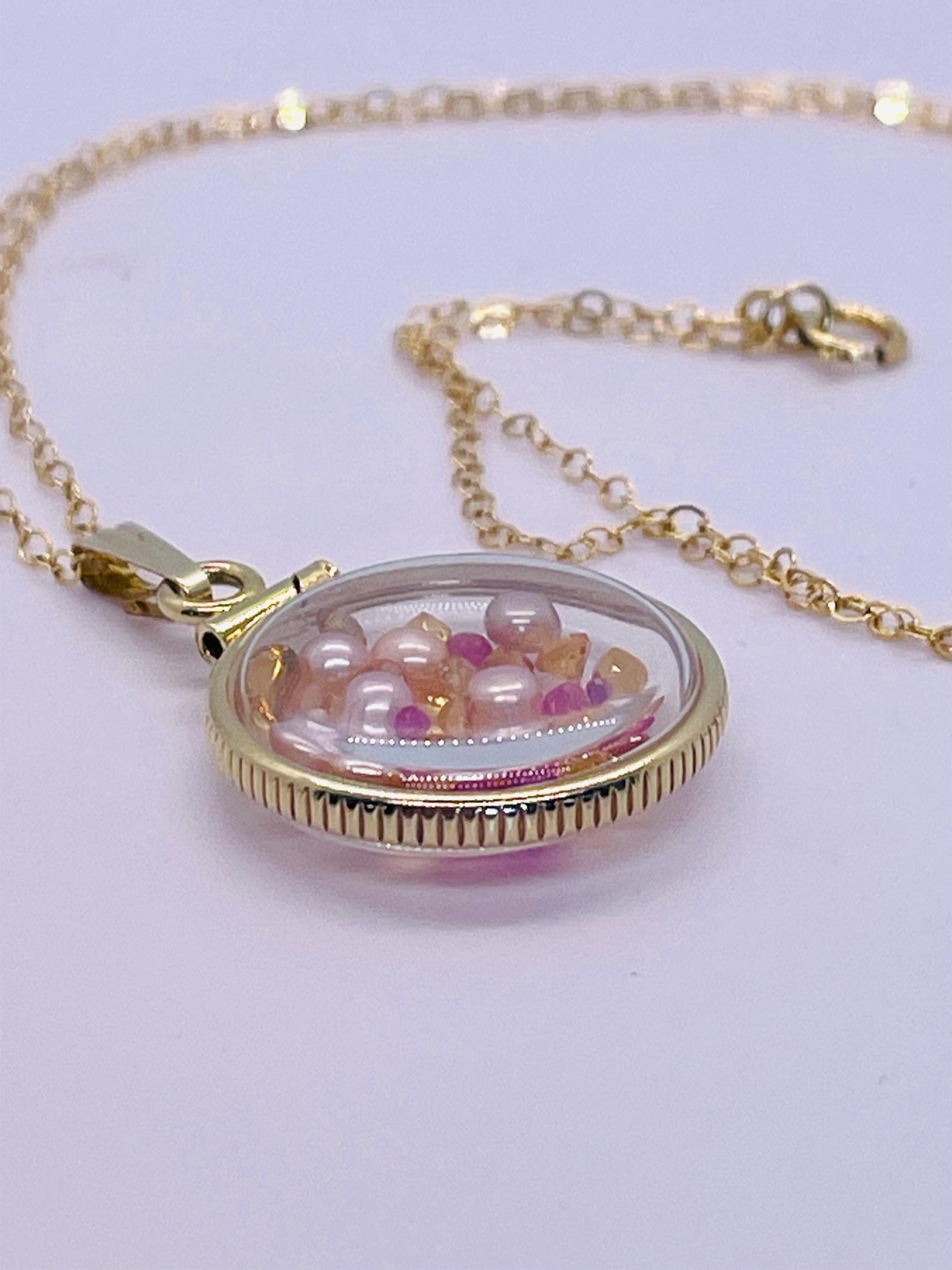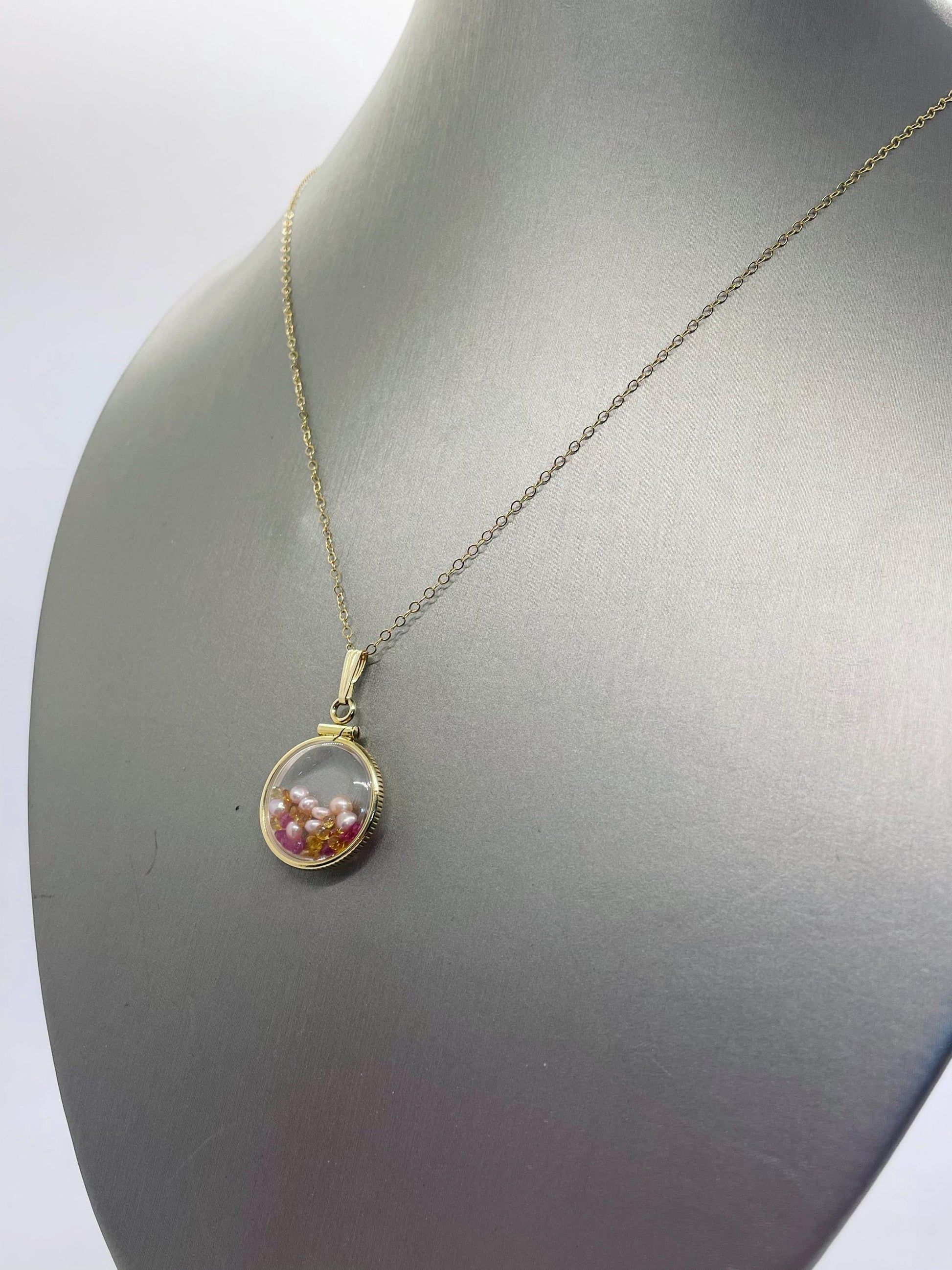 14k Solid Gold Handmade Dime size ruby, citrine, pearl shaker locket artistic series, beautiful mix