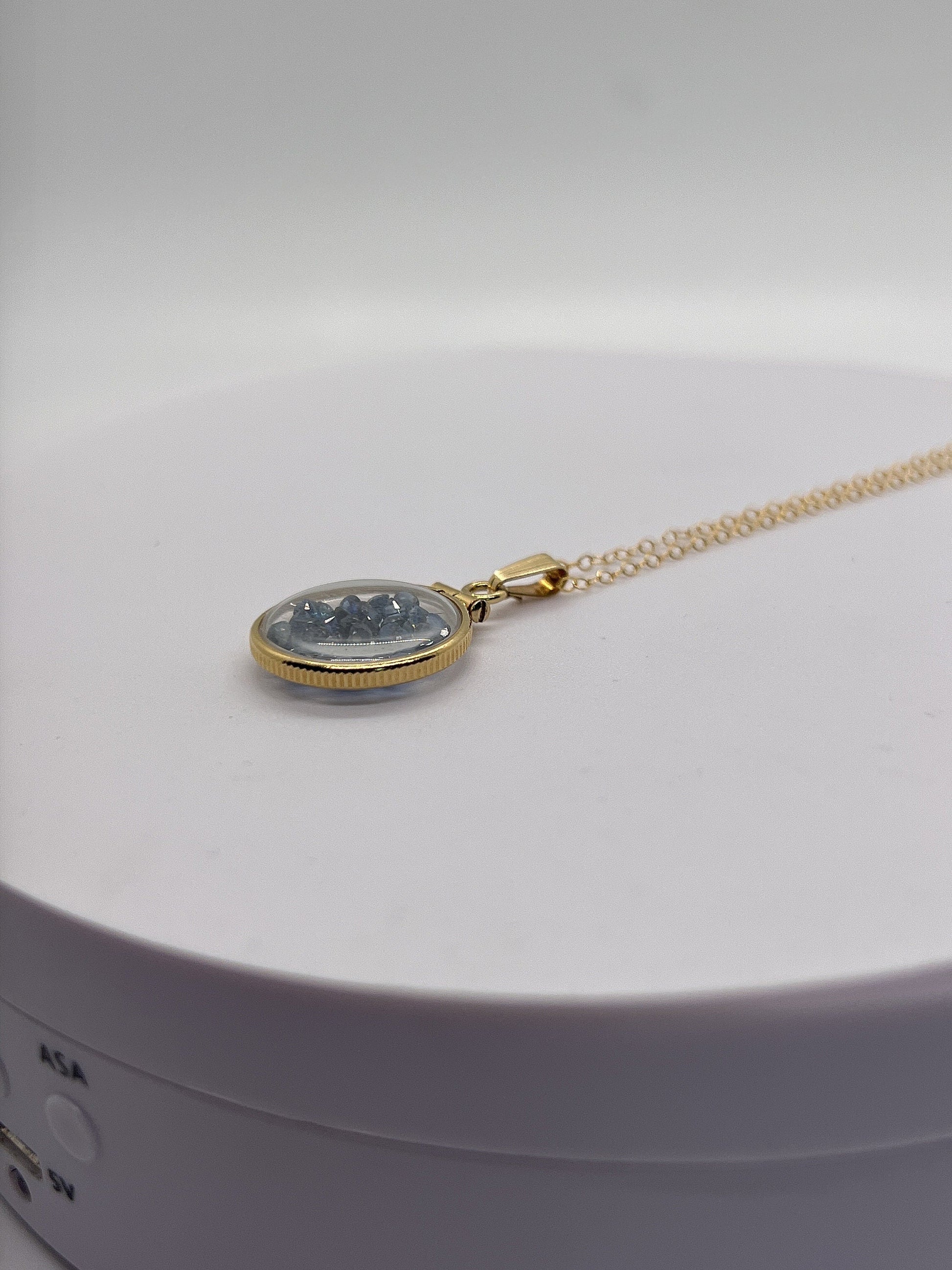 Up for sale: A 16 mm diminutive sized Handmade 14k gold shaker locket glowing blue with September's birthstone gems inside. If your birthstone is Sapphire (birthstone for September) or you just like cool eye catching jewelry, then this locket is for you. These lockets can be opened with a small screwdriver. These are new and comprised of a solid 14k gold bezel and two lucite (acrylic) covers and a 8mm gold filled snap bail. Add a new 18-24 inch 14k gold filled cable chain at checkout. You can also order with a solid 14k gold snap bail. This shaker locket can be viewed from both sides. I can also custom create and build a locket of your design. Please inquire.