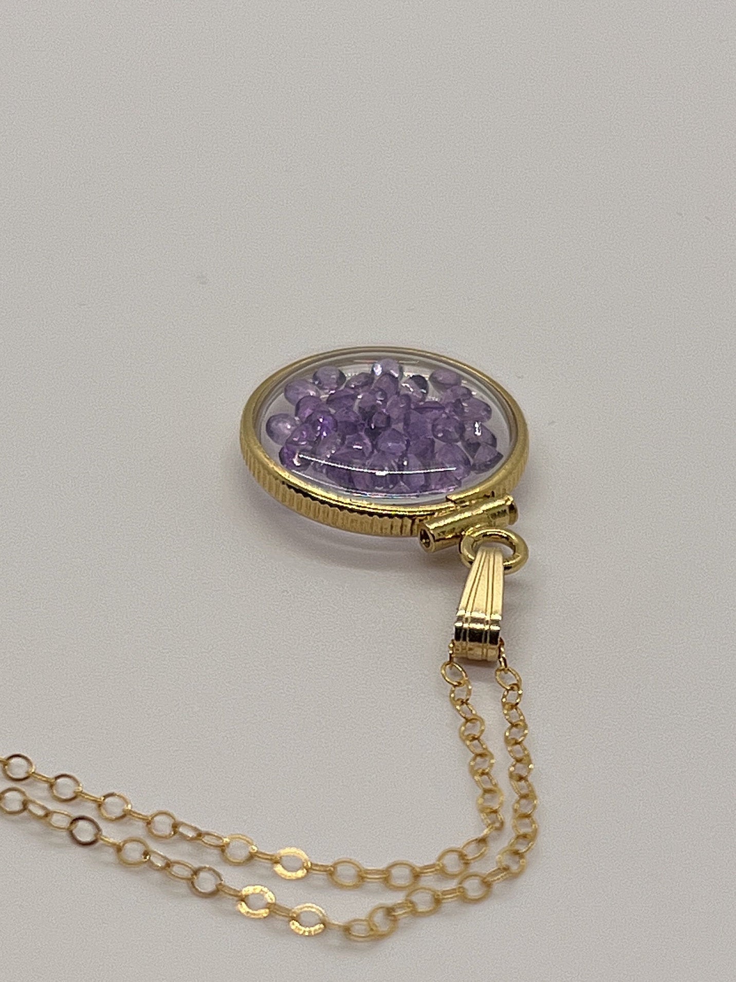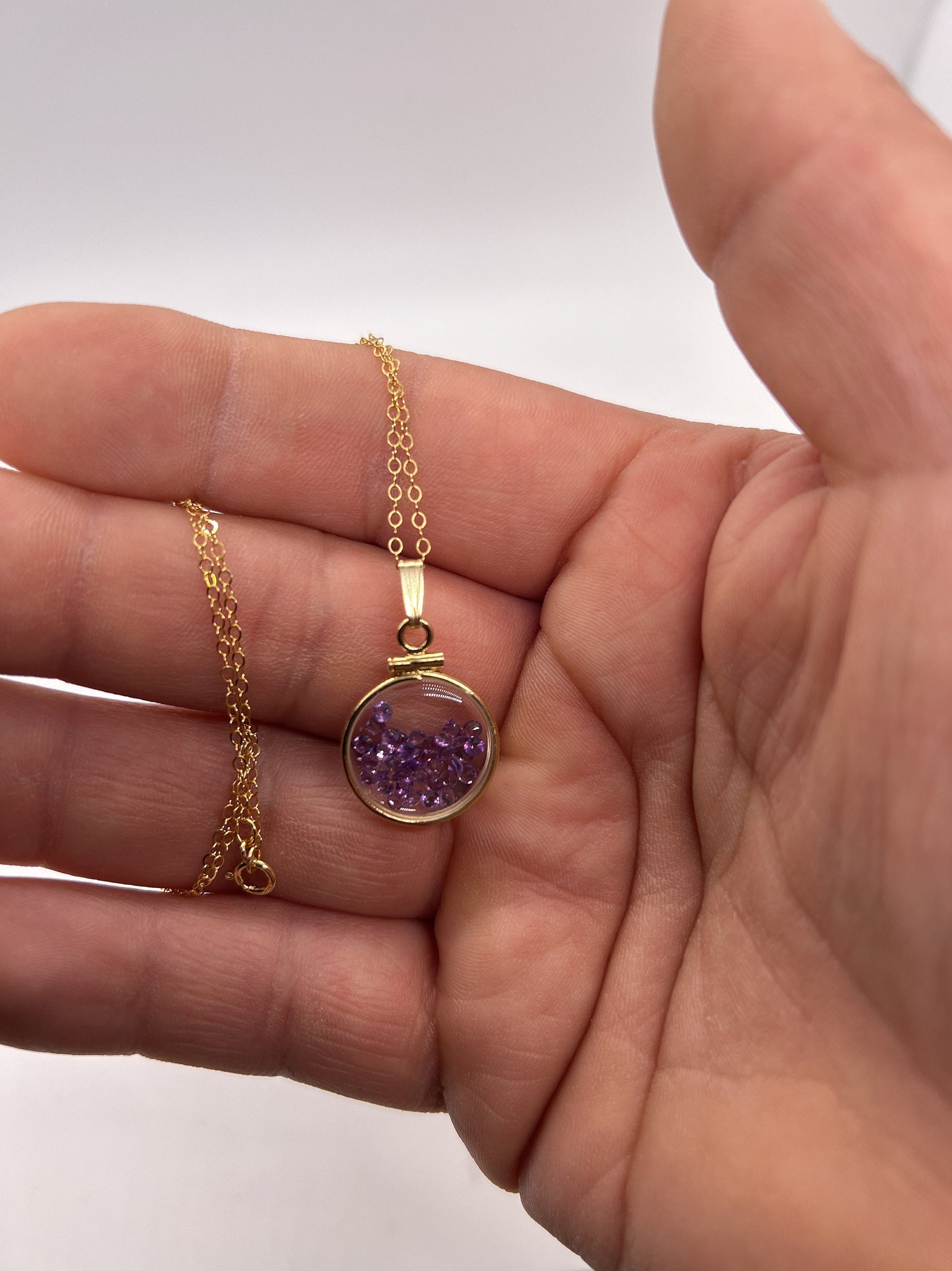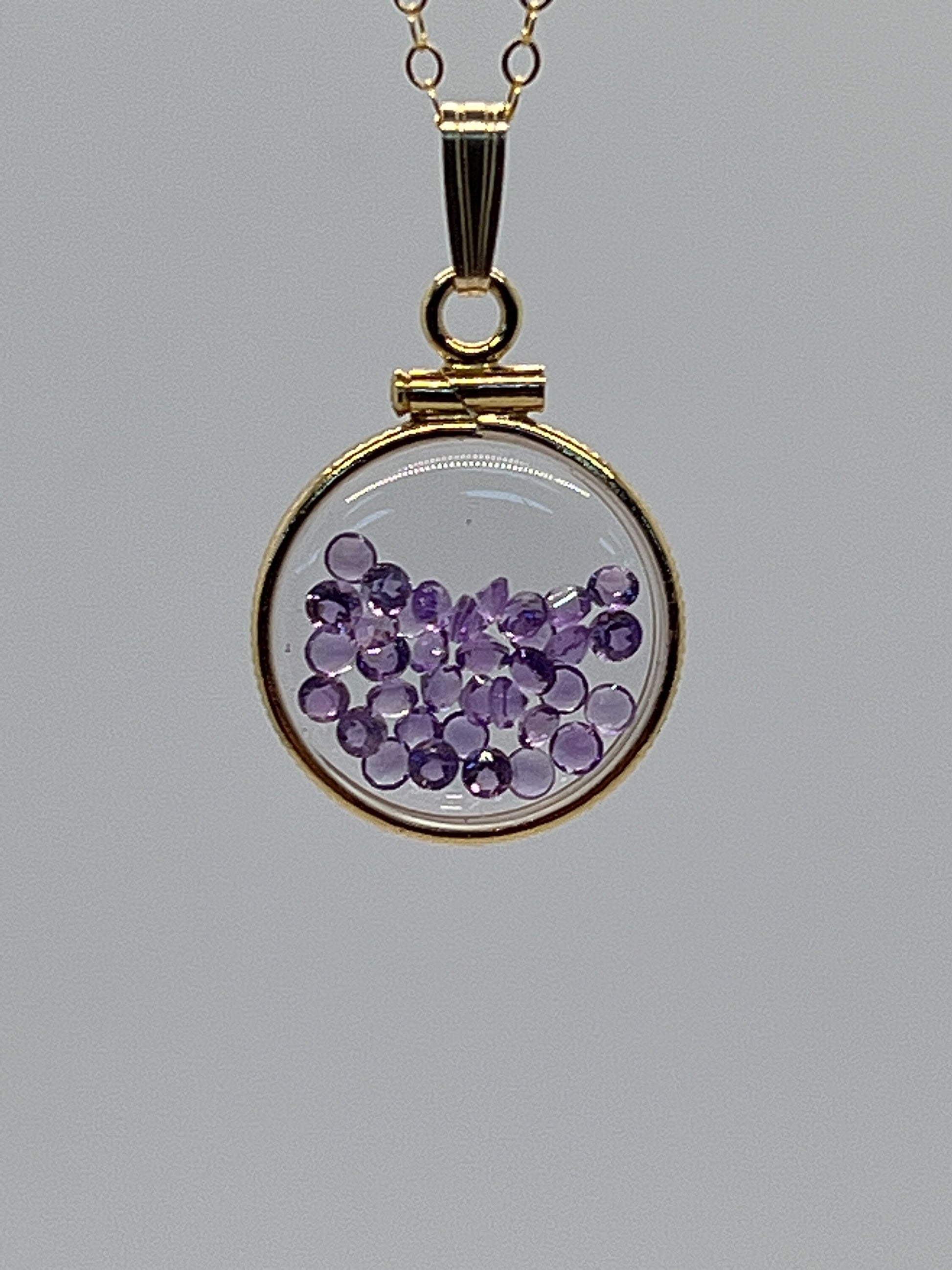 Up for sale: A 16 mm diminutive sized Handmade 14k SOLID gold shaker locket with 1.15 Carats TW of beautiful 2 mm genuine purple faceted amethyst. If your birthstone is Amethyst born in February or you just like eye catching jewelry, then this locket is for you. These lockets can be opened with a small screwdriver. These are new and comprised of a solid 14k gold bezel and two lucite (acrylic) covers and a 8mm gold filled snap bail. Add a new 18-24 inch 14k gold filled cable chain at checkout. You can also order with a solid 14k gold snap bail. This shaker locket can be viewed from both sides. I can also custom create and build a locket of your design. Choose custom create at check out and let me know what gem mix you would like in the locket. Custom created price will include 2 free rebuilds to make sure you love your creation before we ship.