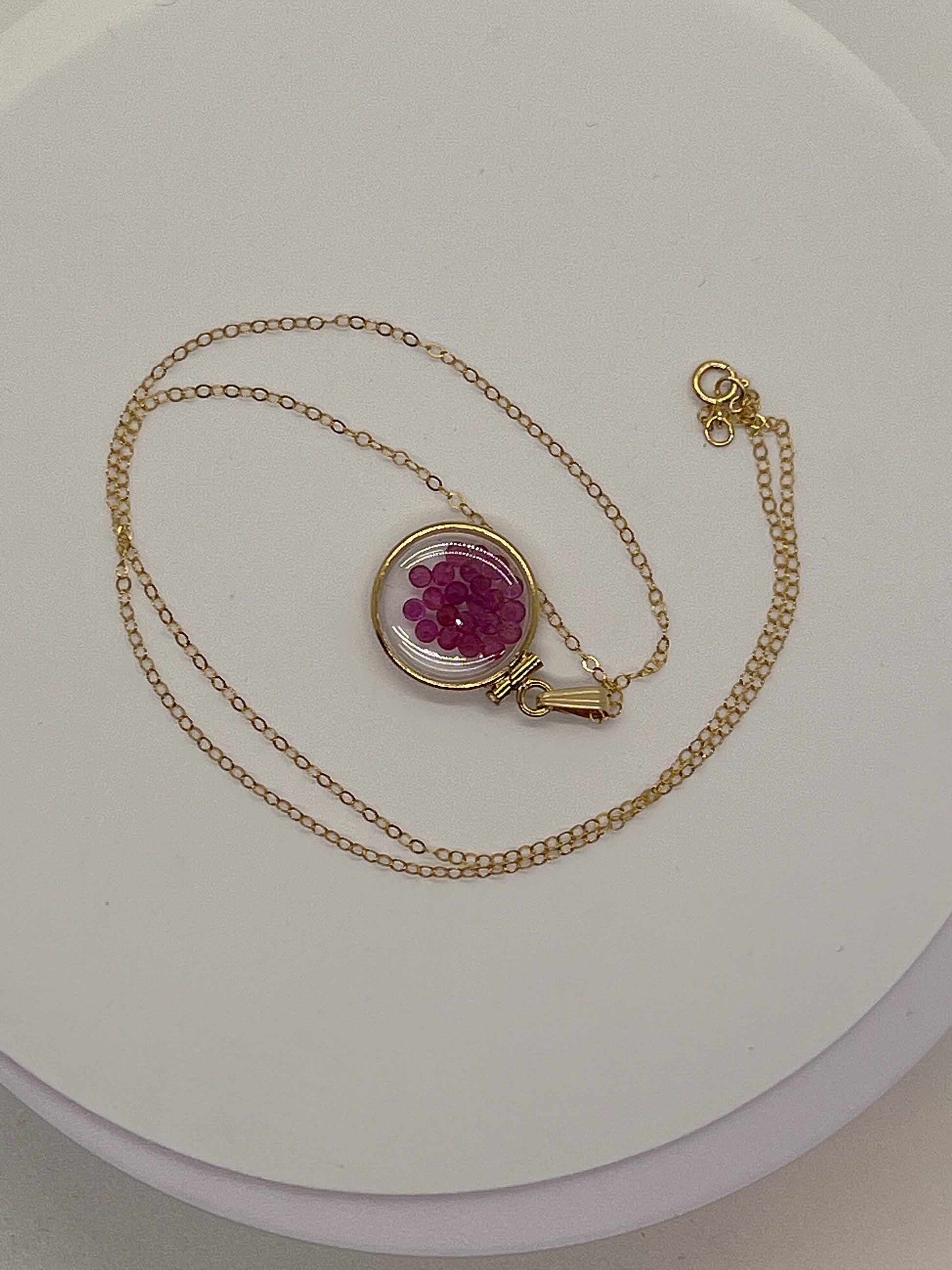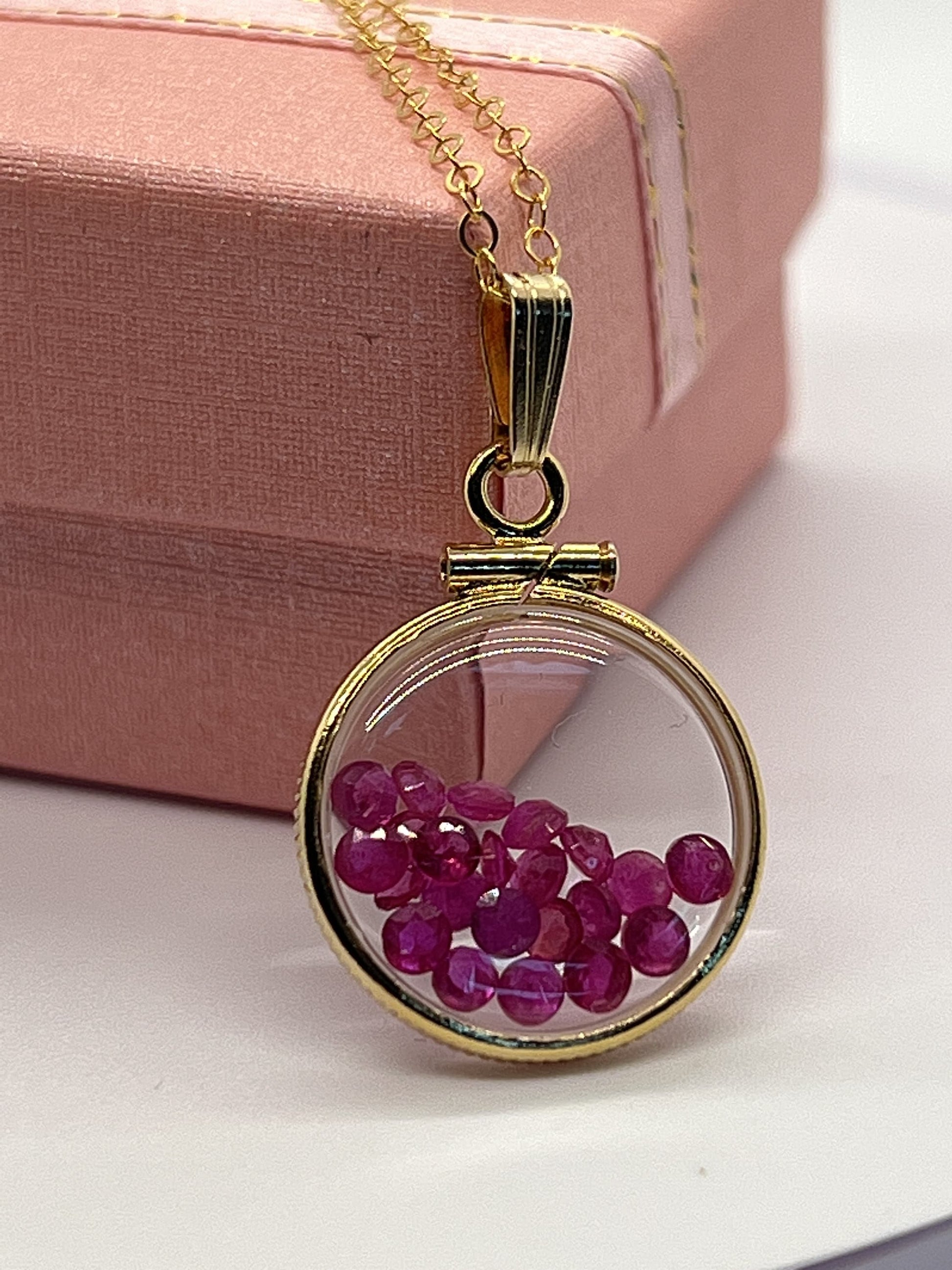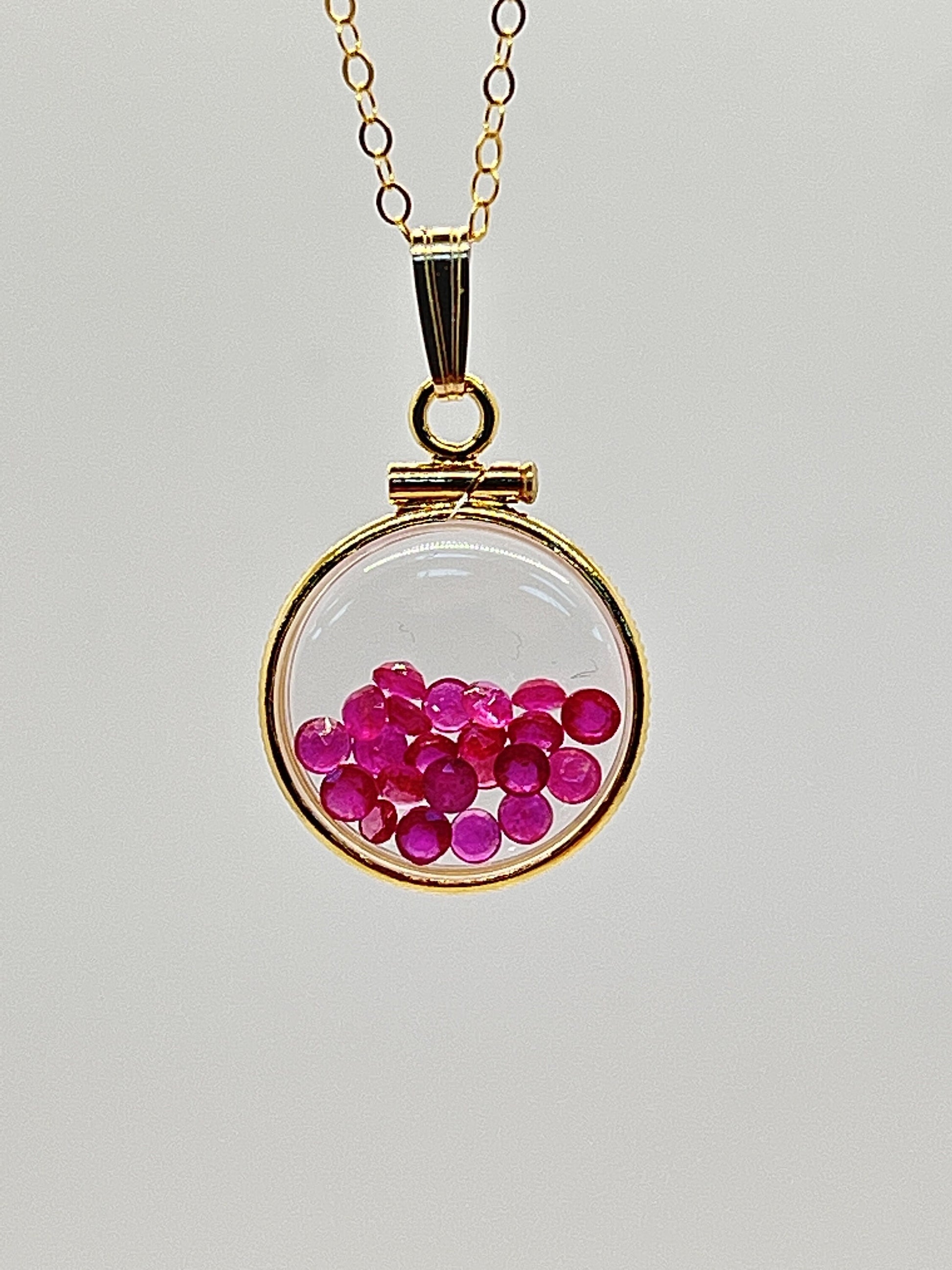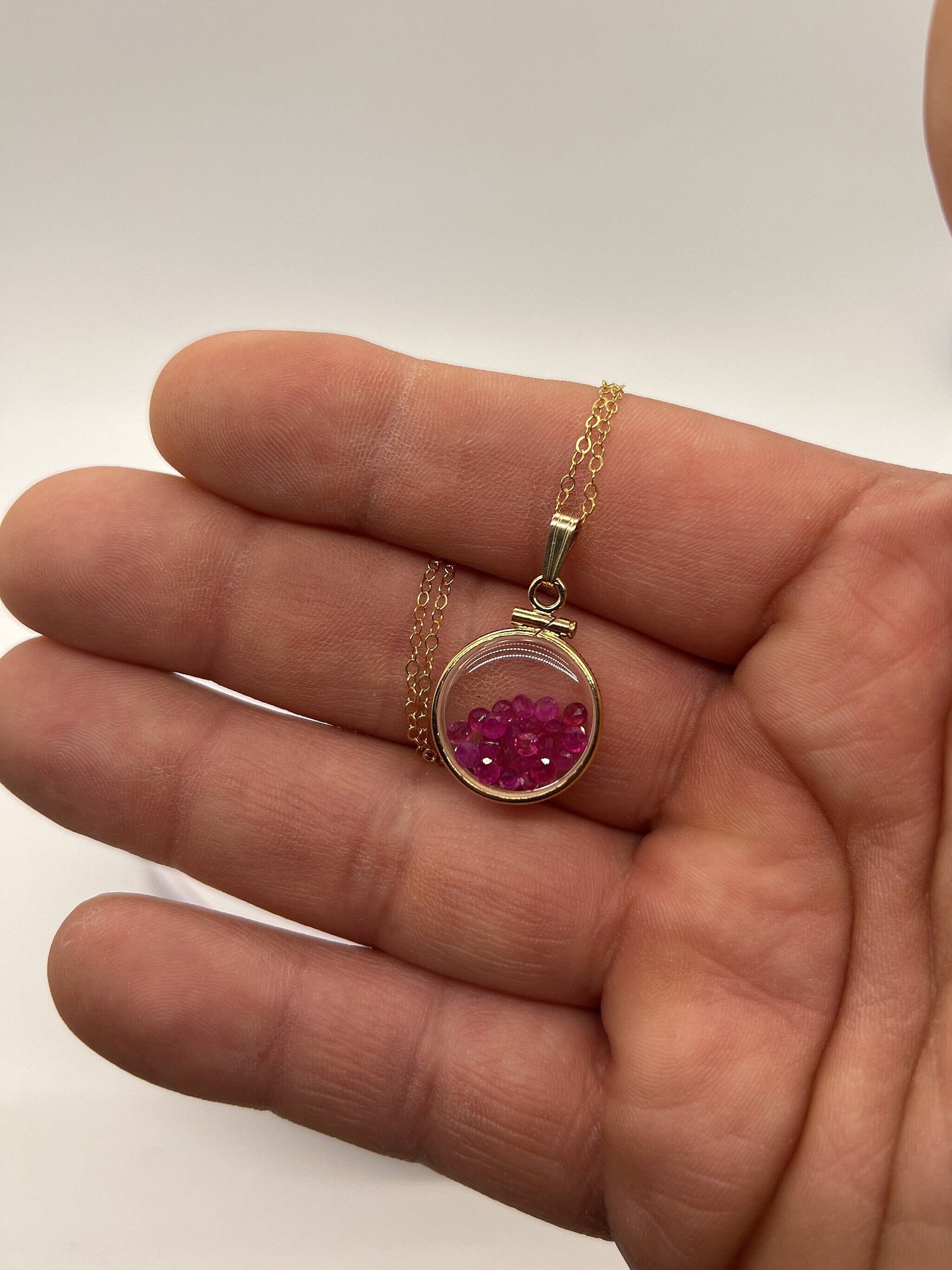 Up for sale: A 16 mm diminitive sized solid 14k gold shaker locket glowing red with July's birthstone gems inside. If your birthstone is Ruby (birthstone for July) or you just like cool eye catching jewelry, then this locket is for you. These are new and comprised of a solid 14k gold bezel and two lucite (acrylic) covers and a 8mm gold filled snap bail. Add a new 18-24 inch 14k gold filled cable chain at checkout. You can also order with a solid 14k gold snap bail. This shaker locket can be viewed from both sides. I can also custom create and build a locket of your design. Let me know.