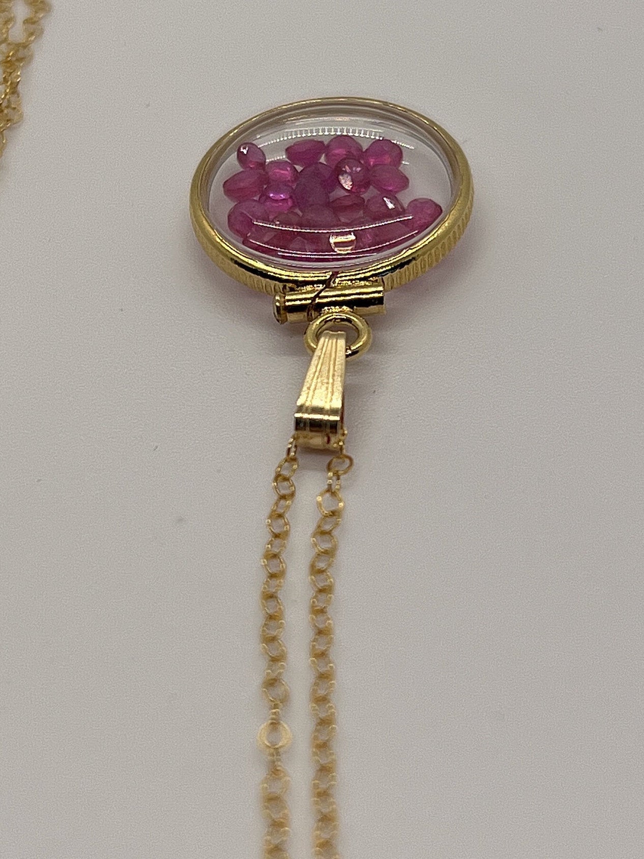 I have : Rubies Emeralds Amethyst Tourmaline Peridot White Topaz Tanzanite Garnet Citrine Dark Blue Sapphire Let me know I can put your choice of gems together for you in SOLID GOLDHallmarks. Gold bezel and snap bail, 14k. Gold filled snap bail and Chains or 14/20 gold filled. These are hand made so some small difference may be seen in any duplicate lockets This wonderful locket comes apart easily with a small eyeglass screwdriver so you can add or subtract tiny keepsakes.The picture with the pretty model is the same locket with different stones just to show beauty and size as worn.This Locket contains:1.95 TCW Natural round cut 2mm Red/pink Ruby Gem Stones. I also have similar, 50 year old vintage lockets for sale that can also me incorporated into your creation.I can make a second locket like this made to orderShipped free with USPS First Class Package and comes with a nice gift box, colors vary To see other wonderful items click the links below: Click this link to see Vintage Shaker Lockets https://www.etsy.com/shop/TimeTalentNTreasures?ref=seller-platform-mcnav§ion_id=28856113Click this link to see Handmade Crafted Shaker Lockets https://www.etsy.com/shop/TimeTalentNTreasures?ref=seller-platform-mcnav§ion_id=32189637Click this link to see Handmade Bullet Shaker Lockets https://www.etsy.com/shop/TimeTalentNTreasures?ref=seller-platform-mcnav§ion_id=29685070Click this link to see Handmade Vintage Bullet Shaker Lockets https://www.etsy.com/shop/TimeTalentNTreasures?ref=seller-platform-mcnav§ion_id=32738269Click this link to see Vintage Silver Earring https://www.etsy.com/shop/TimeTalentNTreasures?ref=seller-platform-mcnav§ion_id=29685074