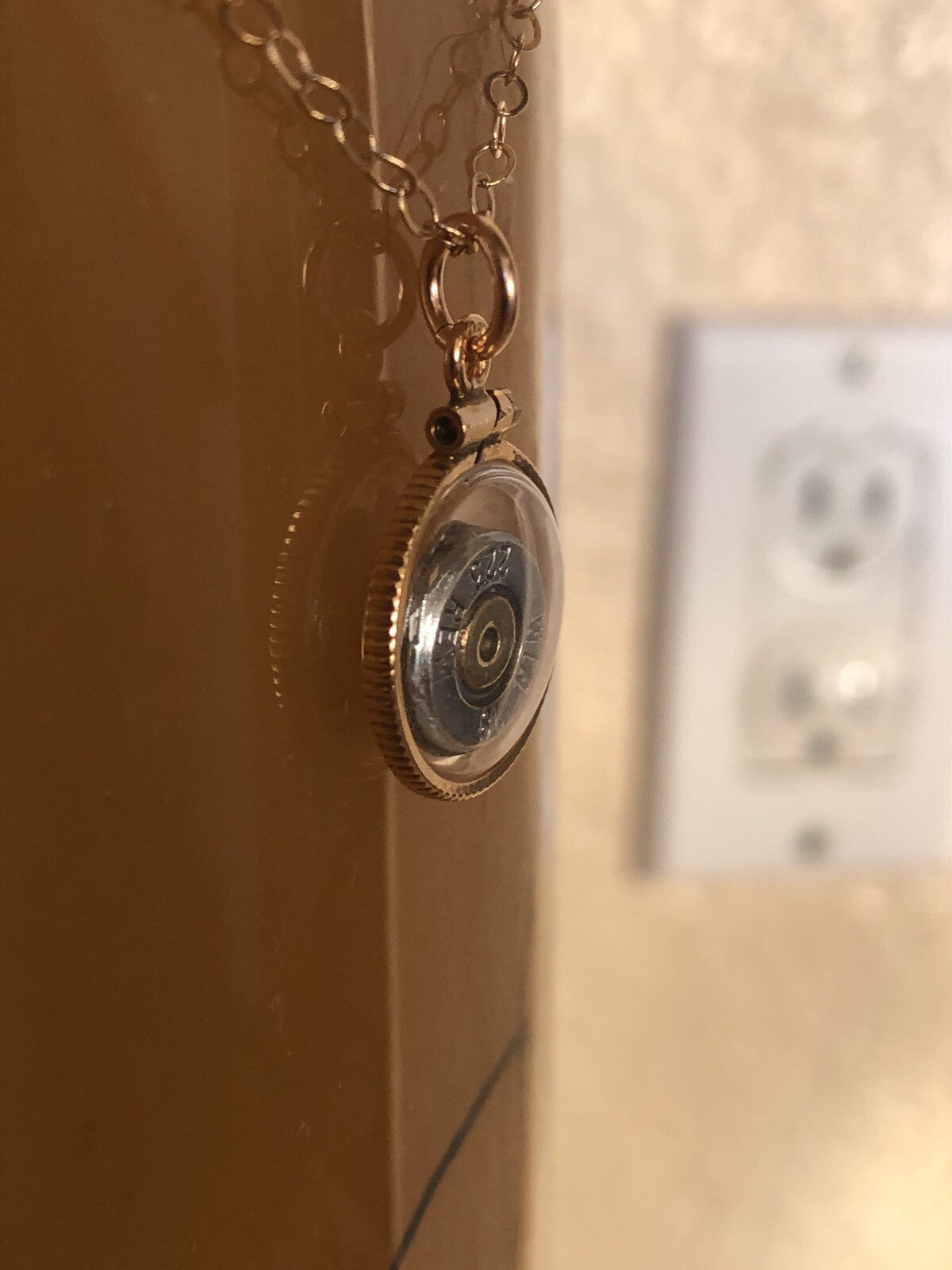 This Auction is for a gold filled necklace and a aprox 15 mm locket with a fired, polished, machined .223 bullet: The locket itself is a Vintage 12k gold filled locket, custom made