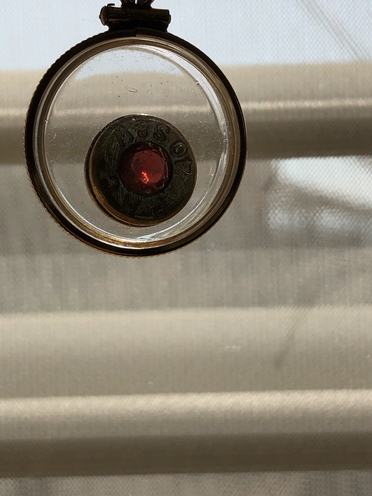 Inside this locket I've placed a cut and machined fired 40 cal. bullet. I spent some time cutting, soldering and polishing this item and I think it looks quite nice inside this locket. I've added a natural and genuine 5 mm garnetb that is secured inside the space where the fired primer was removed. The bullet itself floats inside the locket. The garnet adds a nice color to this very eye catching piece. I think that this "bullet" jewelry is a step above and is a great example of fine jewelry. The locket can be opened with a small screwdriver.