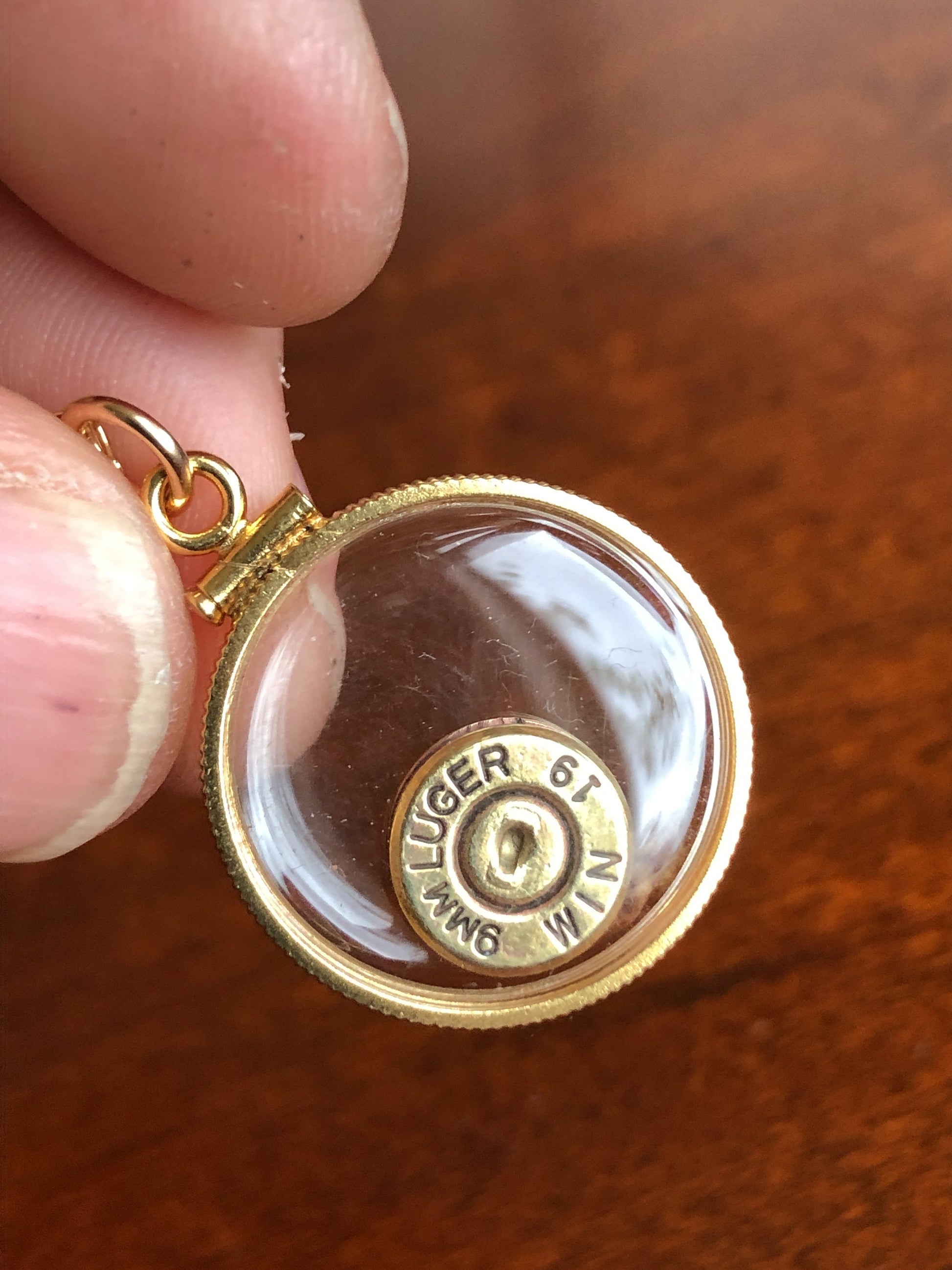 This Auction is for a 14k gold filled necklace and a 20mm locket containing two cut portions of fired, machined 9mm bullets,joined back to back and polished. This locket is a view locket and can show the highly polished joined bullet from either side. This locket is made with two 9mm bullets slices. These are hand made so each may differ slightly. Each locket will come with a 9mm, 2 sided bullet slice, however, bullet manufacturers may vary.