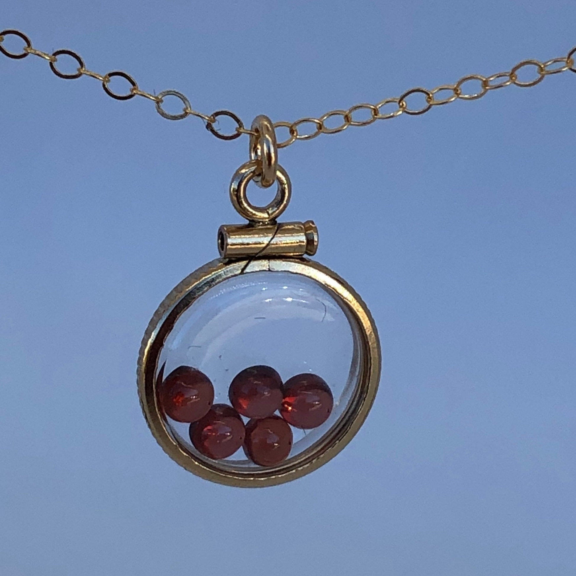 Up for sale: A 12.5 mm Handmade 14k gold filled shaker locket with .91 Carat TW of beautiful 3 mm genuine red garnet cabochons. If your birthstone is Garnet, born in January or you just like eye catching jewelry, then this locket is for you. This one is my new design with diminutive locket that contains some colorful quality genuine garnets. These lockets can be opened with a small screwdriver. They are new and comprised of a gold filled bezel and two plastic covers. I've added a new 18 inch 14k gold filled cable chain. This shaker locket can be viewed from both sides. I can also custom create and build a locket of your creation. Let me know.