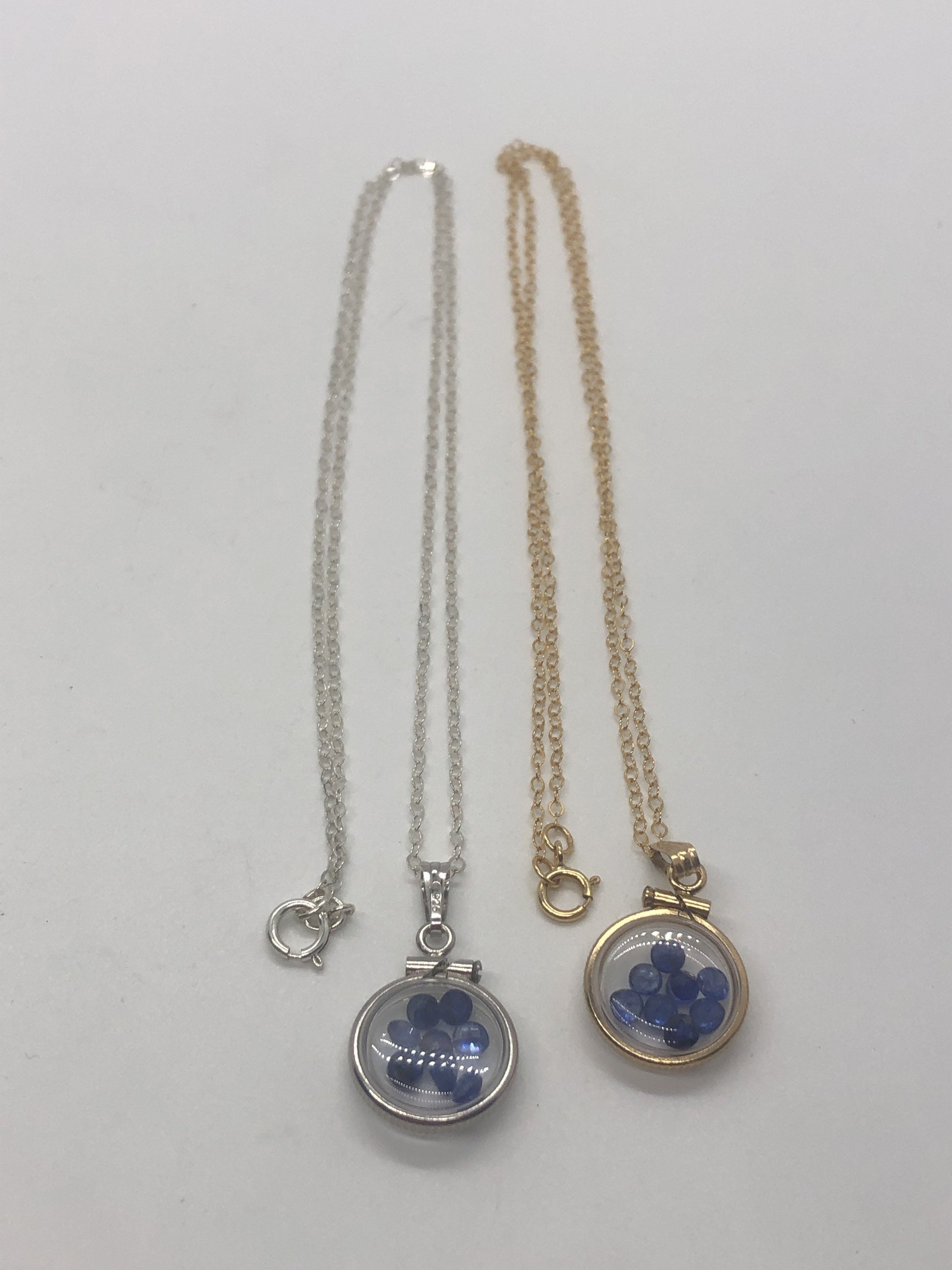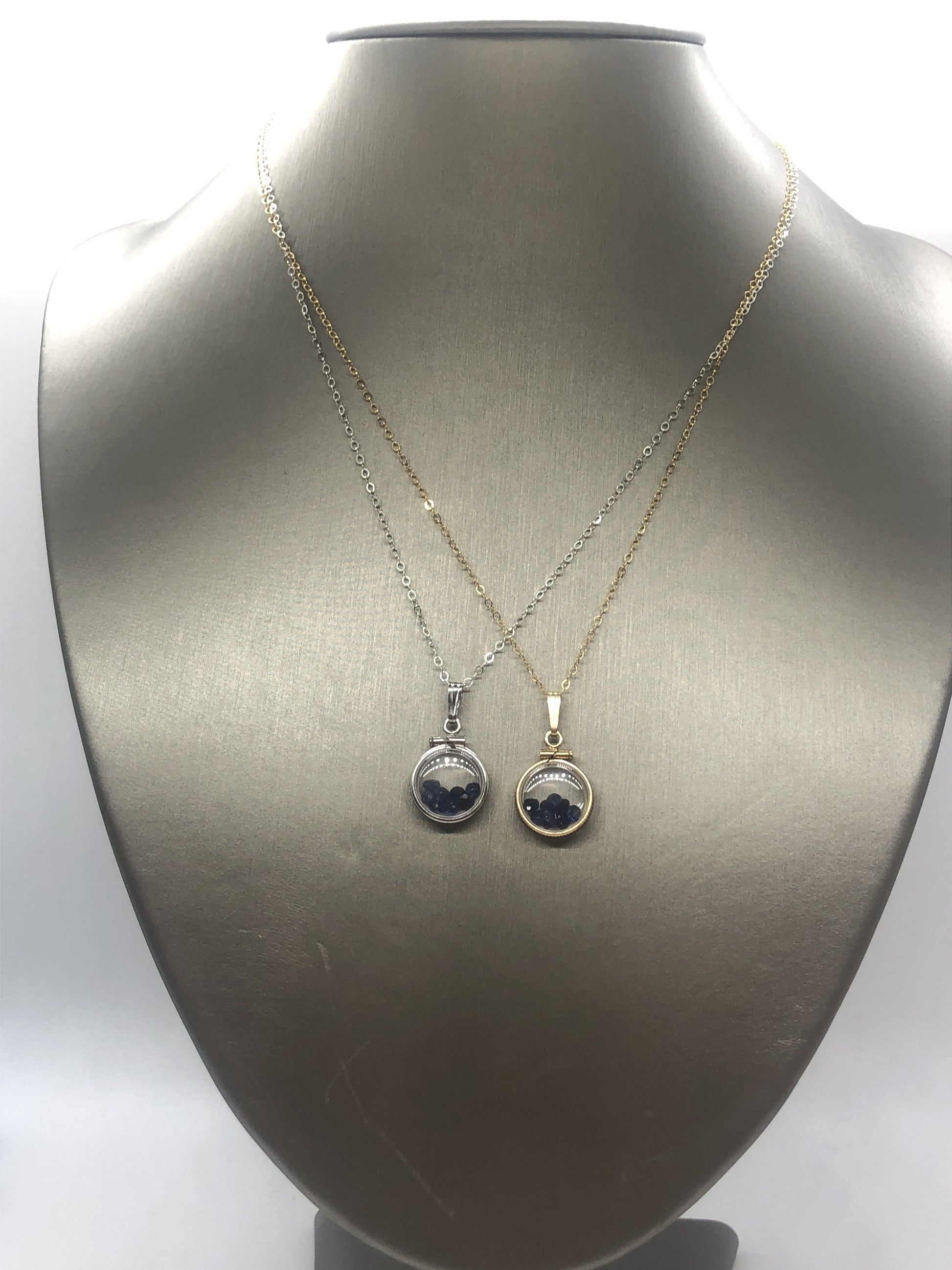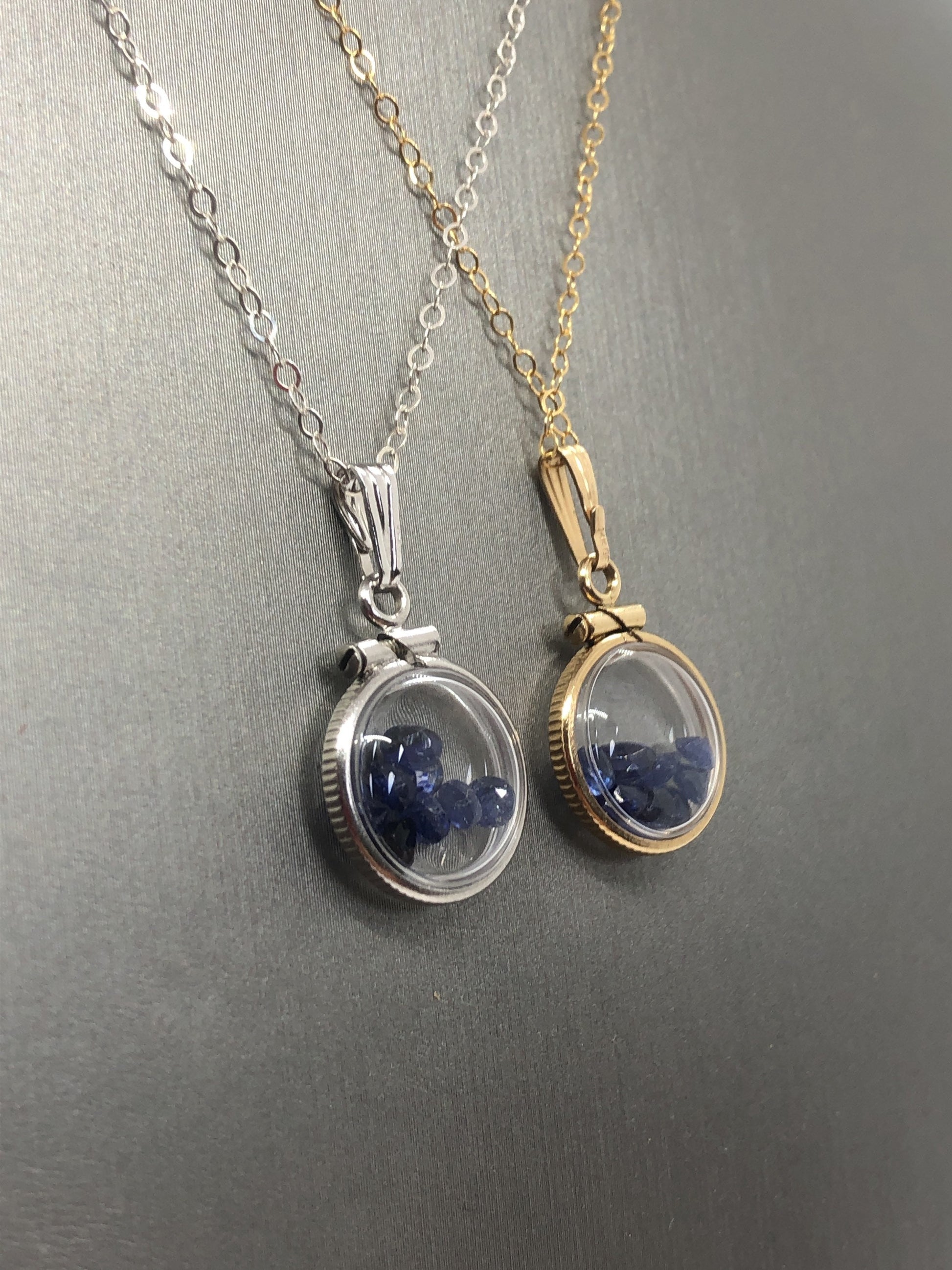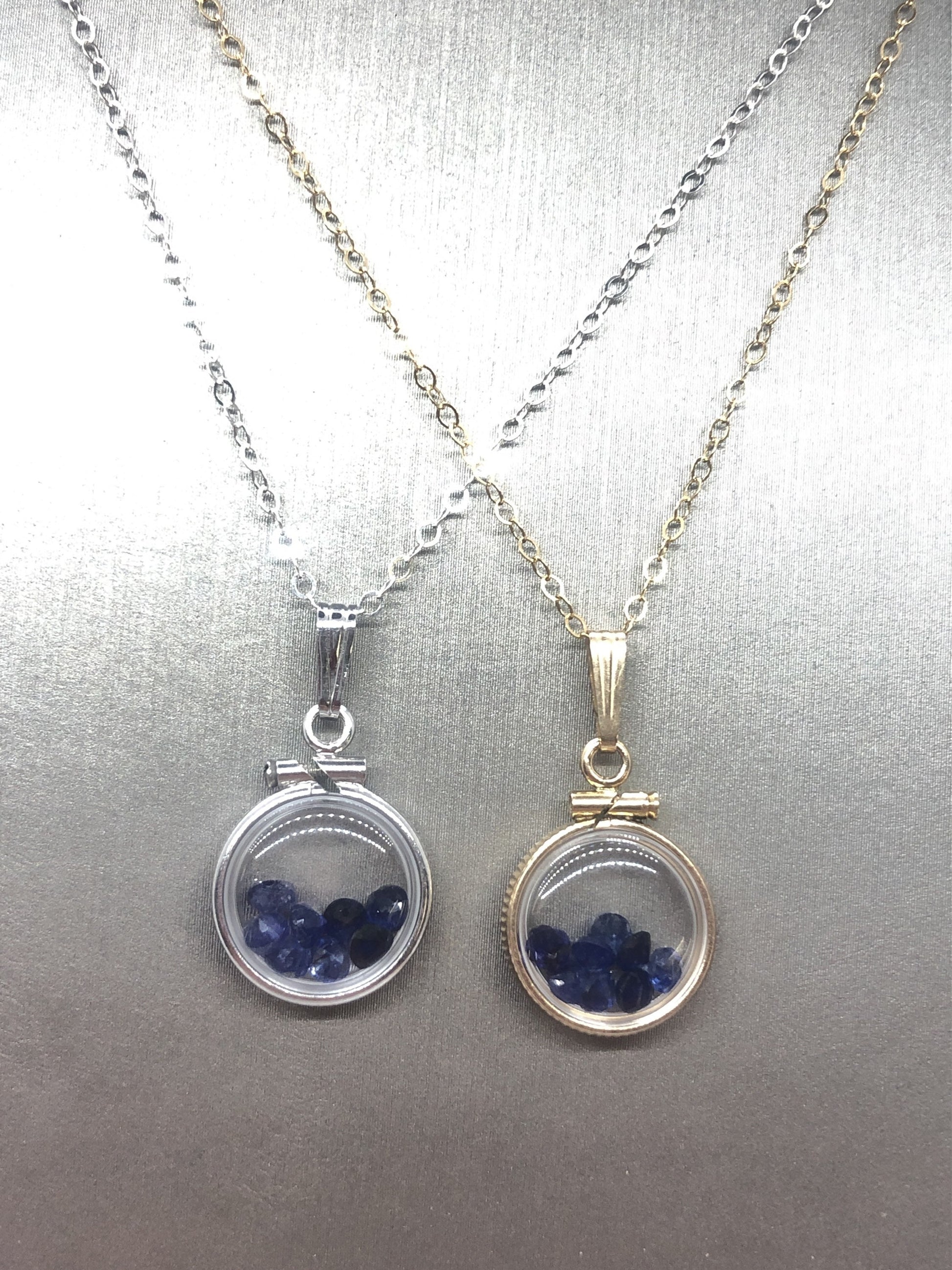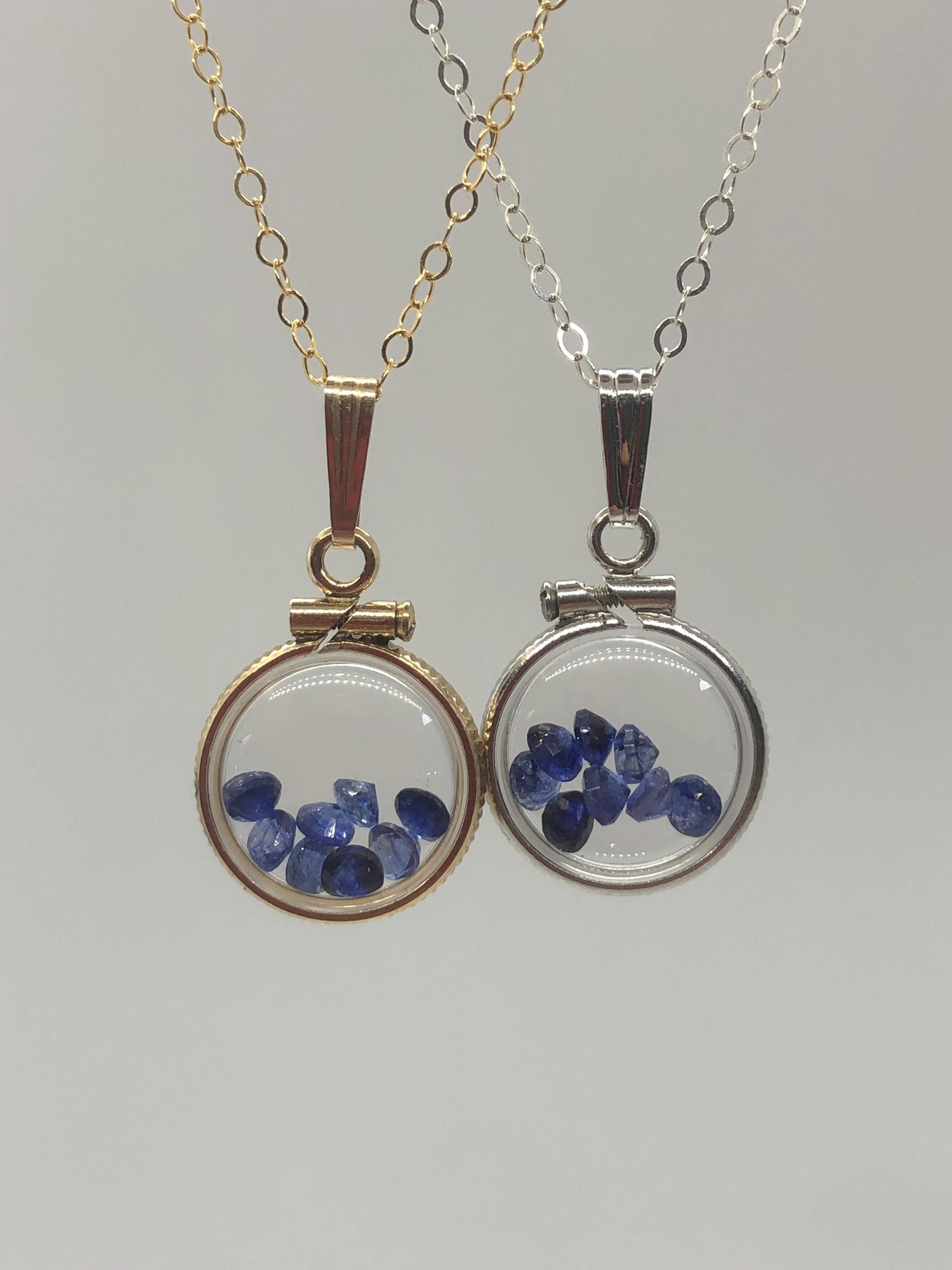 Up for sale: A 12.5mm 14k gold filled ( or sterling silver) Shaker locket glowing beautiful blue with September's birthstone gems inside. If your birthstone is sapphire (birthstone for September) or you just like cool eye catching jewelry, then this locket is for you. I've added a new 18 inch 14k gold filled cable chain and a few new gemstones to create an eye catching creation. Please see my other auctions for additional creations with these lockets. This locket is dainty in size for those tiny treasures.