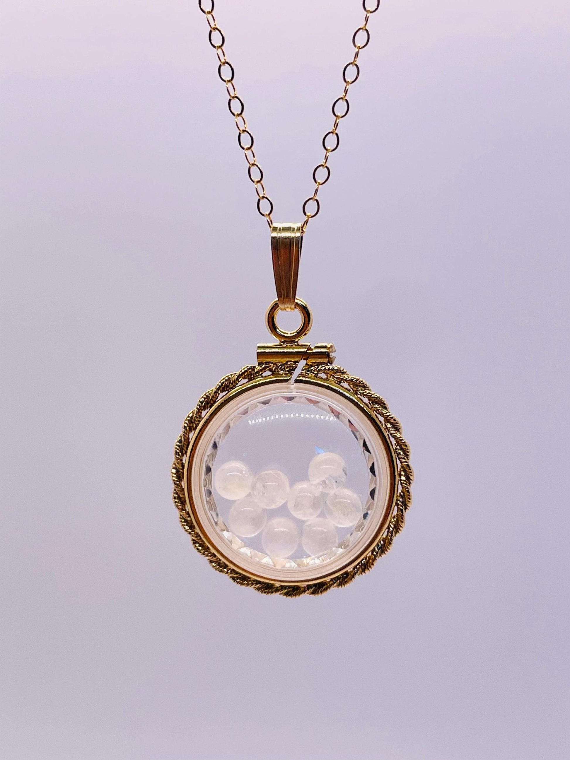 Up for sale: NEW 18 mm Handmade 14k gold filled rope edge shaker locket. These lockets can be opened with a small screwdriver. They are new and comprised of a gold filled bezel and two lucite covers and a gold filled jump ring. One of the lucite covers has a beautiful diamond cut edge. You can buy the locket only w/o 16"-24" GF chain. Locket only option comes with a 14k GF snap bail so you can add your own chain. This shaker locket can be viewed from both sides and will store and display your little treasures. You can put gems, gold, hair, anything you can imagine. The picture within this listing displays 4mm moonstone gemstones. See all of my listing for examples and ideas. What will you put in yours?