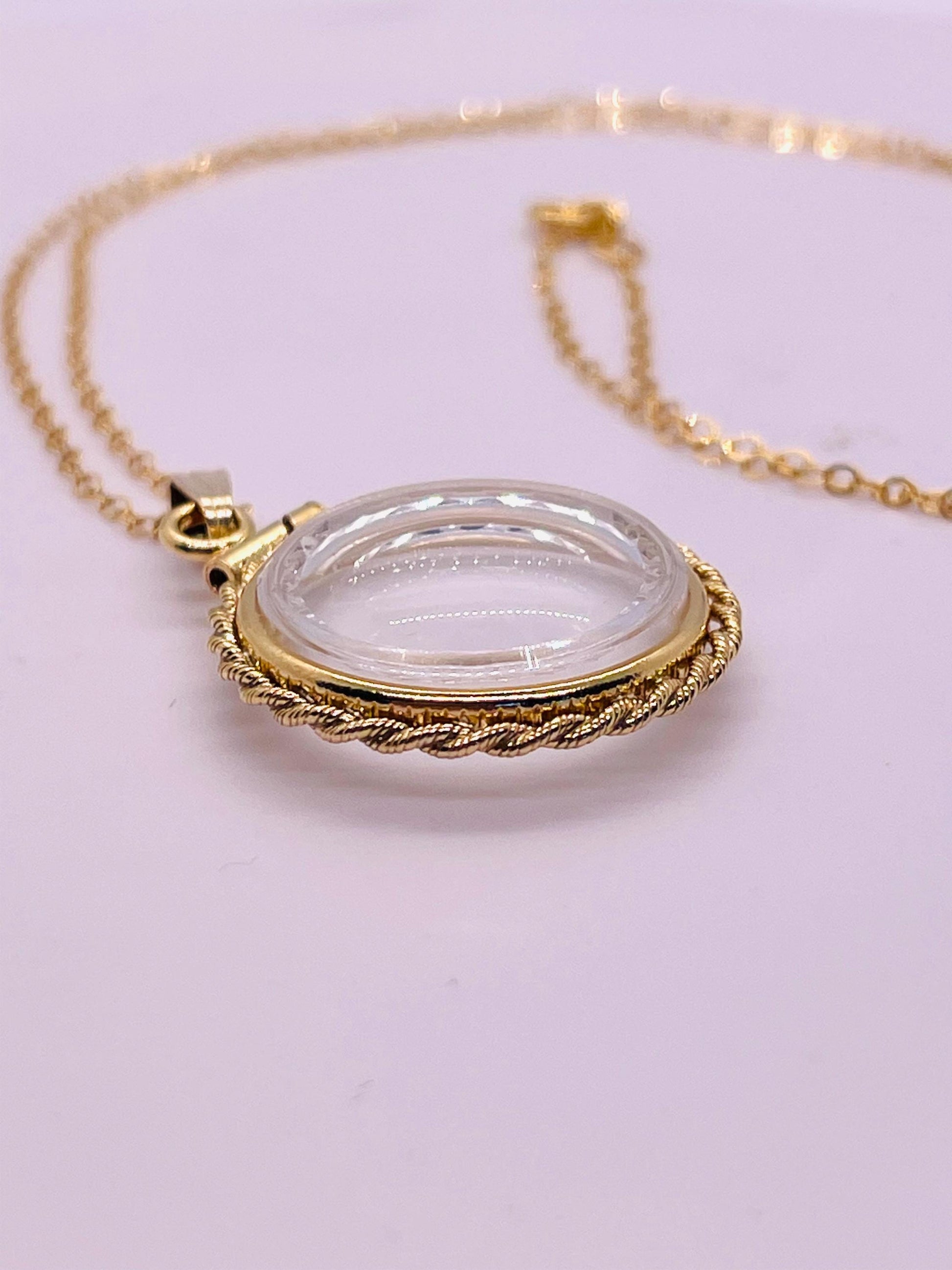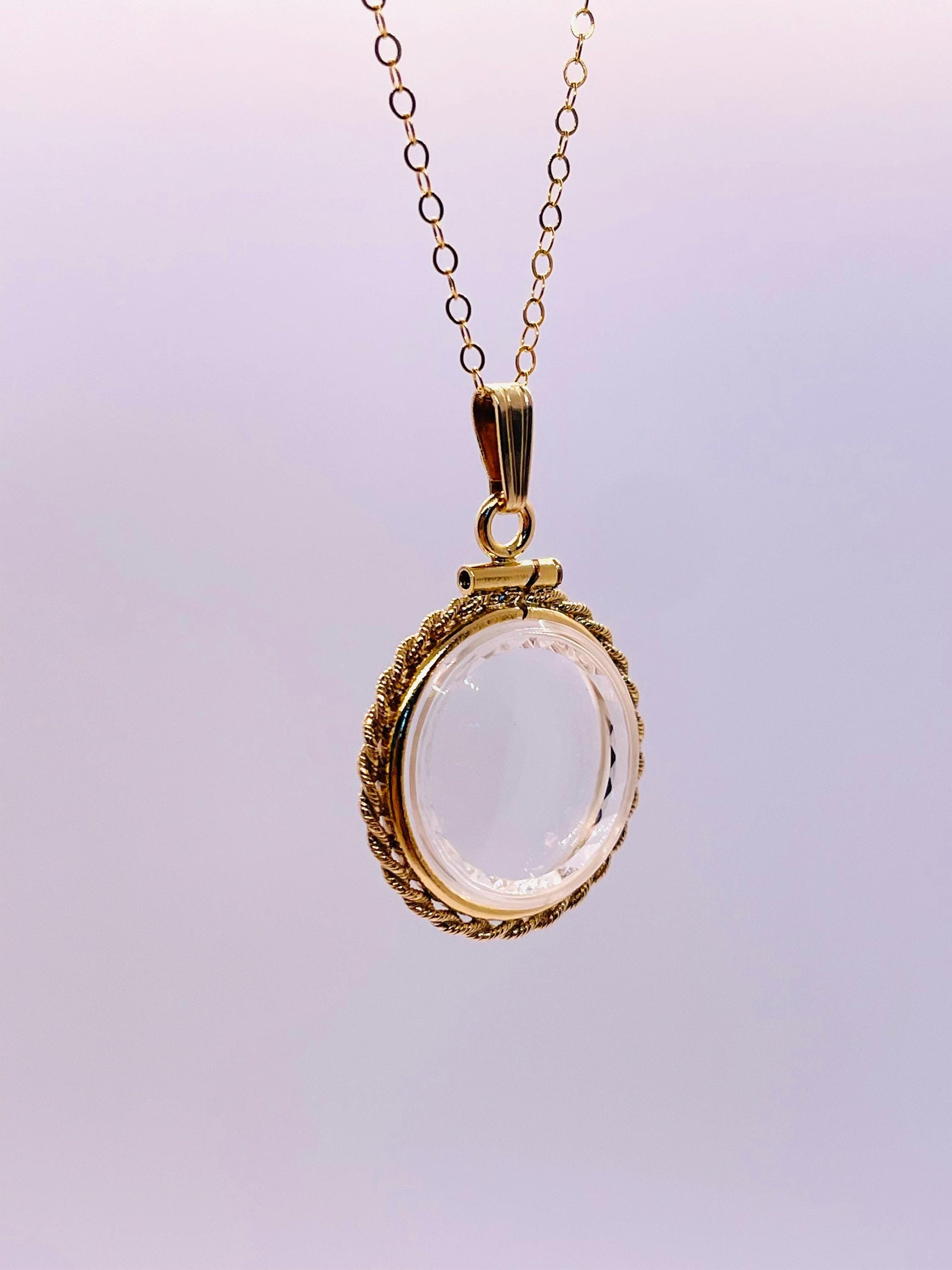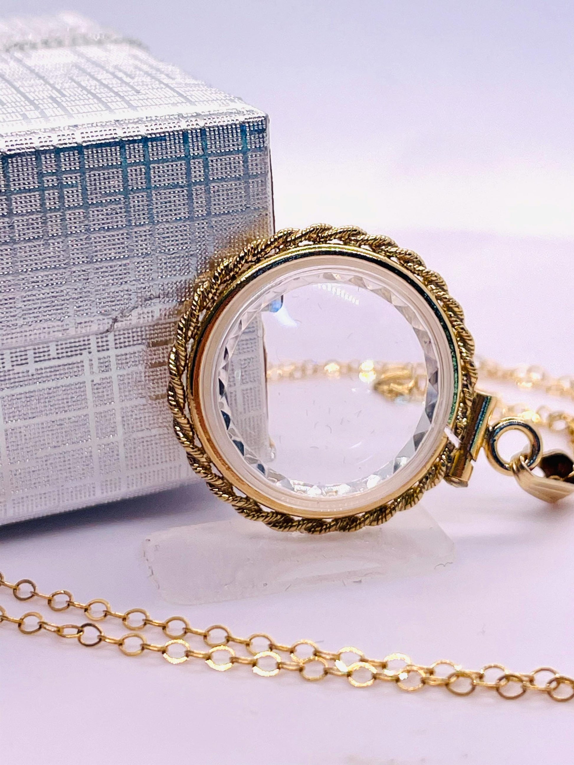 Up for sale: NEW 18 mm Handmade 14k gold filled rope edge shaker locket. These lockets can be opened with a small screwdriver. They are new and comprised of a gold filled bezel and two lucite covers and a gold filled jump ring. One of the lucite covers has a beautiful diamond cut edge. You can buy the locket only w/o 16"-24" GF chain. Locket only option comes with a 14k GF snap bail so you can add your own chain. This shaker locket can be viewed from both sides and will store and display your little treasures. You can put gems, gold, hair, anything you can imagine. The picture within this listing displays 4mm moonstone gemstones. See all of my listing for examples and ideas. What will you put in yours?