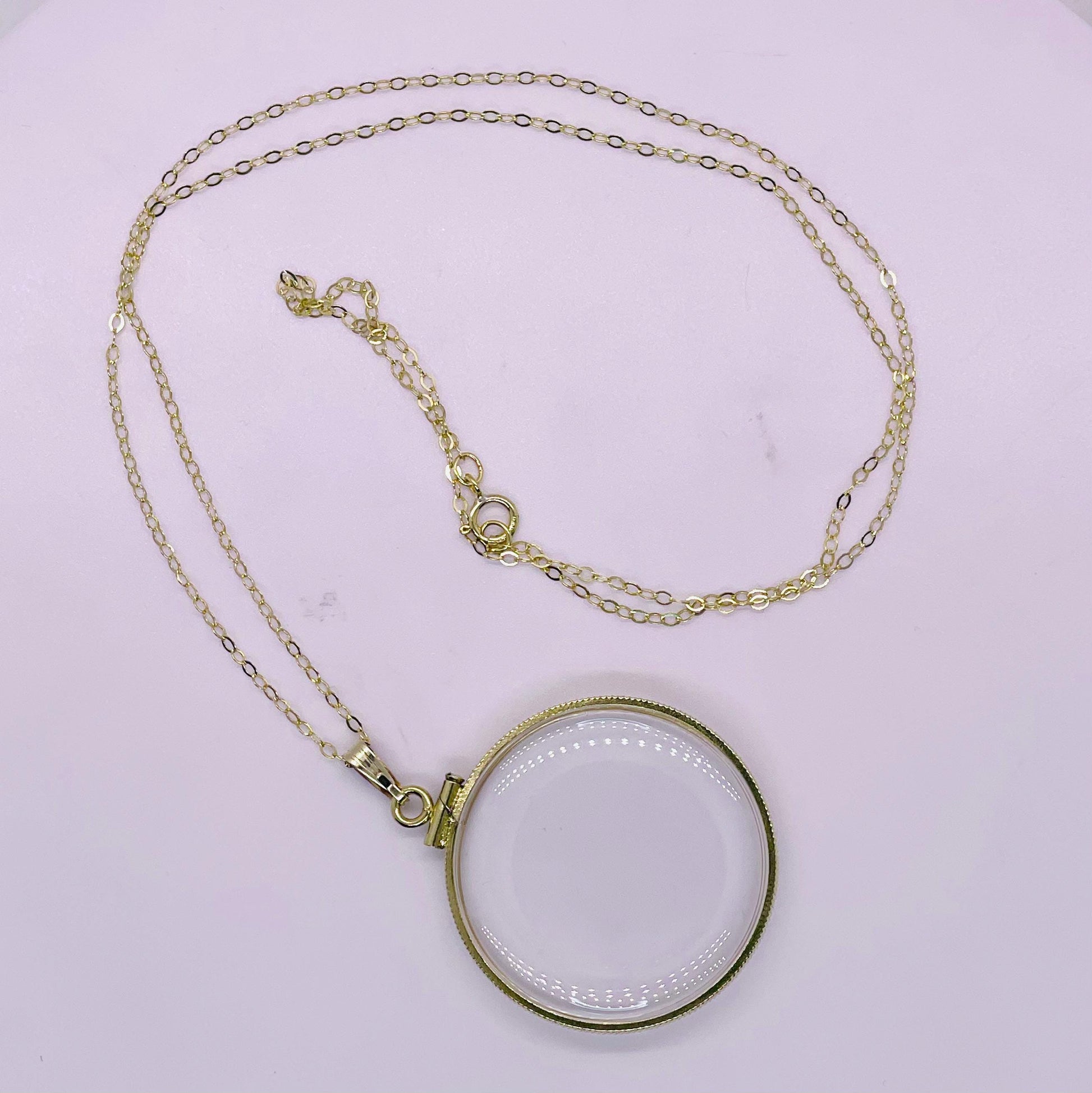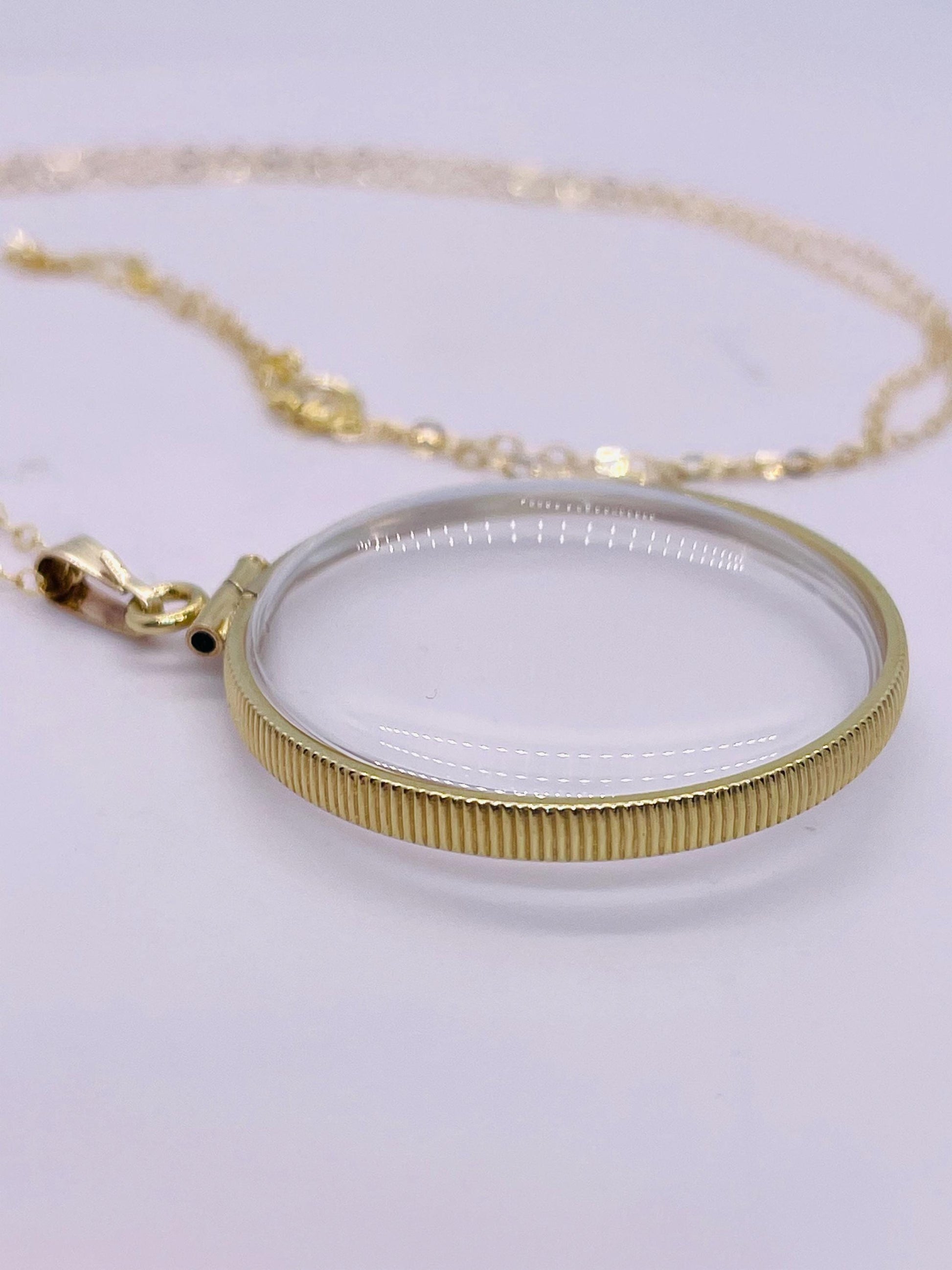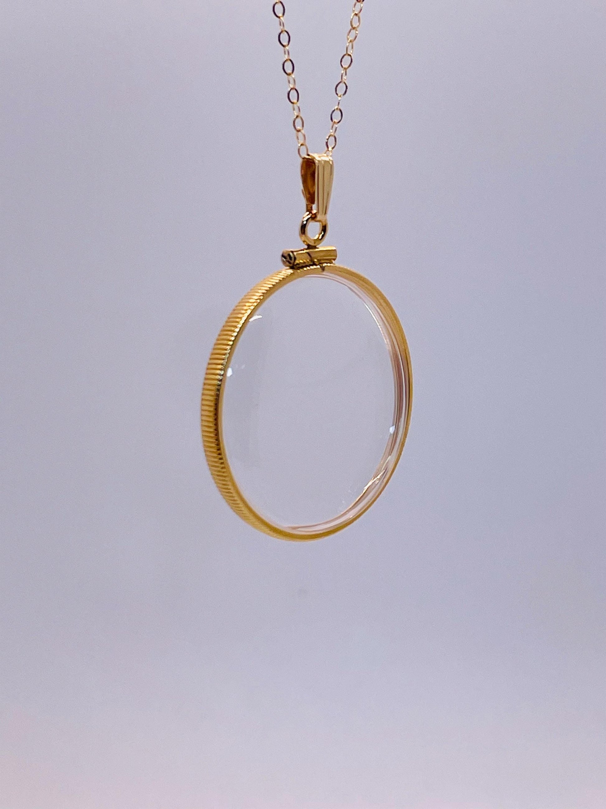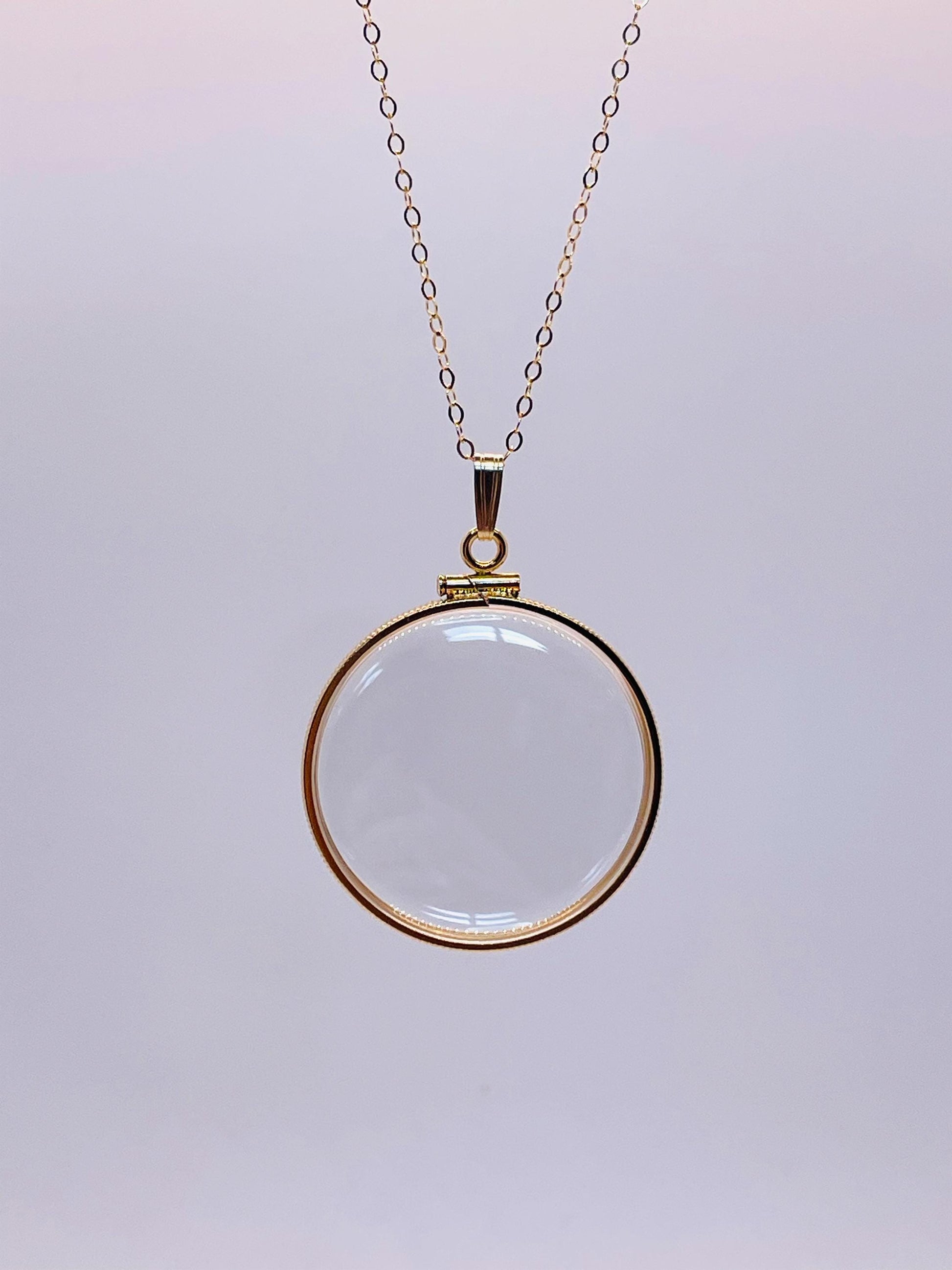 Up for sale: NEW 32mm Handmade 14k gold filled shaker locket. These lockets can be opened with a small screwdriver. They are new and comprised of a gold-filled bezel, two Lucite covers and a gold-filled snap bail. You can buy the locket only without a chain or choose a 16-24” gold-filled cable chain at checkout. Locket only option comes with a 14k golf-filled beautiful, ribbed snap bail so you can add your own chain. This shaker locket can be viewed from both sides and will store and display your little treasures. This locket can fit anything from gemstones and beads to quarters and small coins.