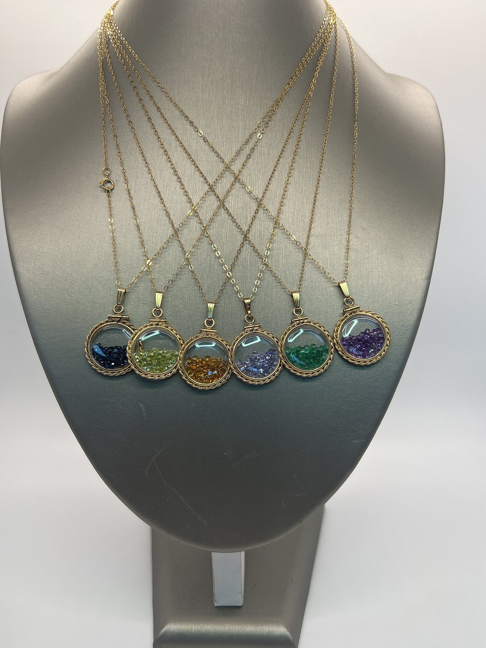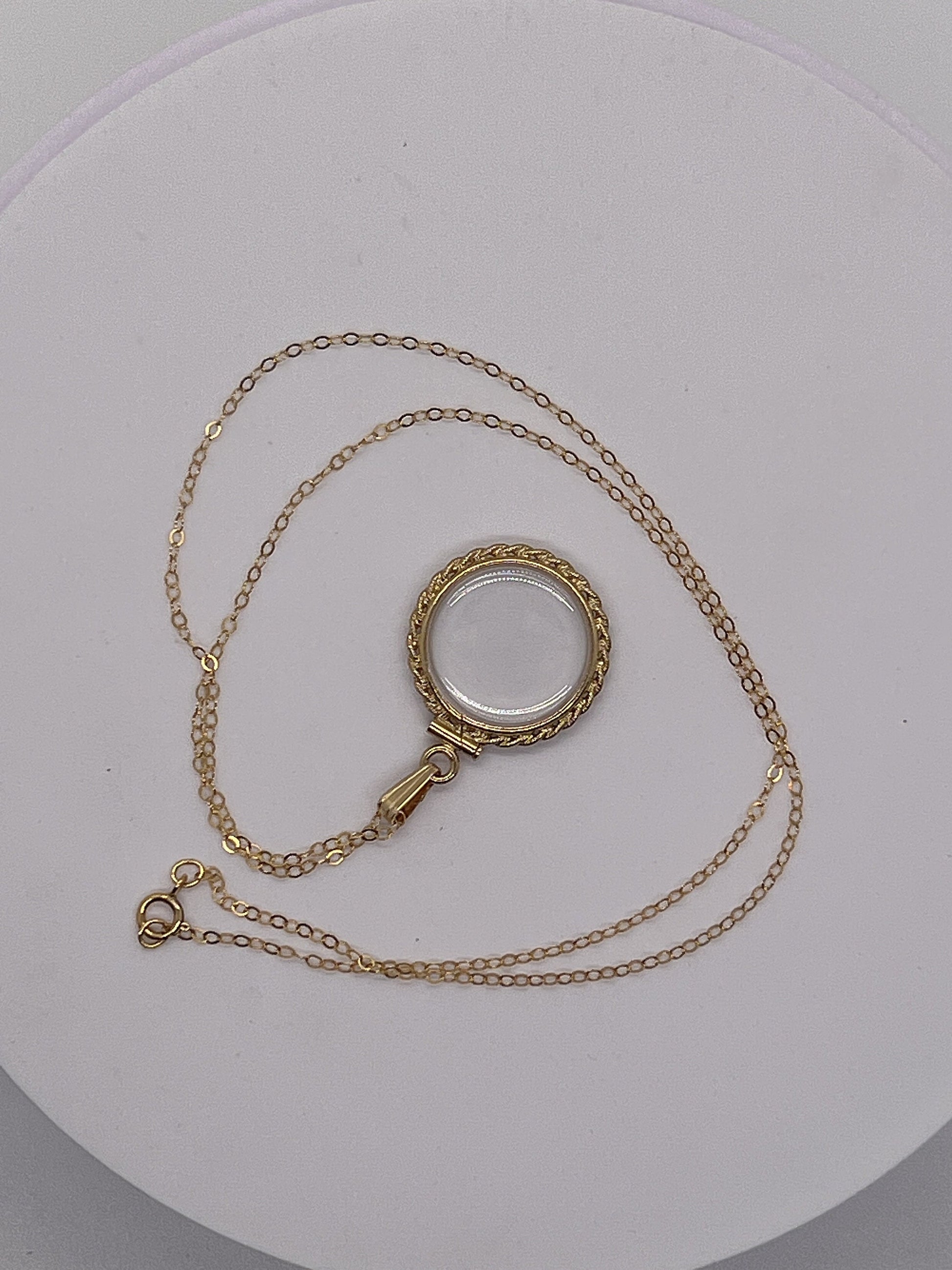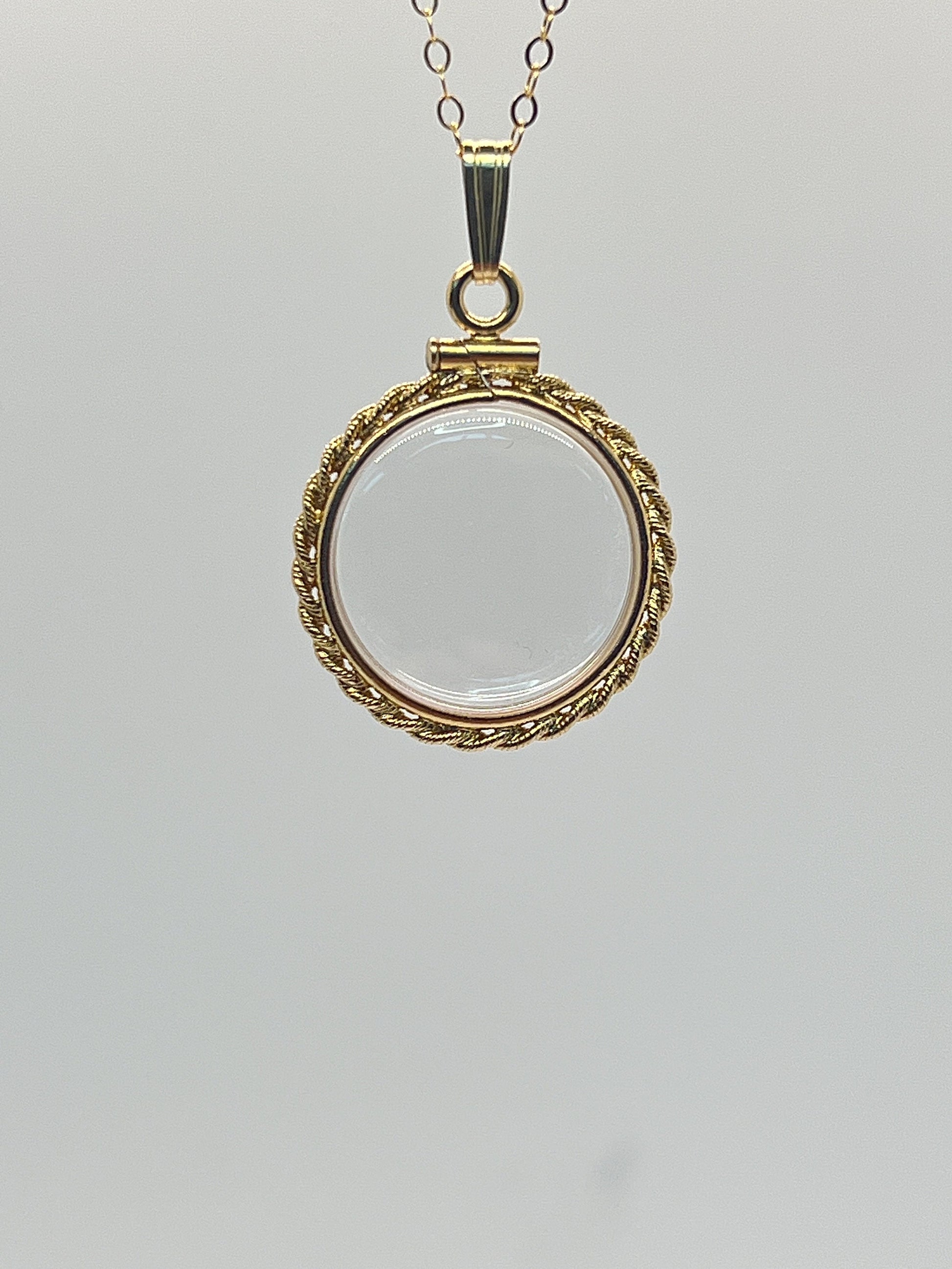 Up for sale: NEW Nickel sized 21 mm Handmade 14k gold filled shaker locket with a wonderful ROPE Edge feature. These lockets can be opened with a small screwdriver. They are new and comprised of a gold-filled bezel, two Lucite covers and a gold-filled snap bail. You can buy the locket only without a chain or choose a 16-24” gold-filled cable chain at checkout. Locket only option comes with a 14k gold-filled beautiful, ribbed snap bail so you can add your own chain. This shaker locket can be viewed from both sides and will store and display your little treasures. You can put small gems, gold, hair, anything you can imagine. Pictured is this locket with 1.75 CTW of many different gems like tanzanite, amethyst, citrine, emeralds, sapphires and peridot. These lockets are diminutive designed for small treasures. I really like this locket with 2mm gems. All of them gems pictured in the examples are 2mm. It allows for a thin layer of gems that fill the locket well and allow light to highlight the beautiful colors of the gems. This is a small creation designed for little treasures.