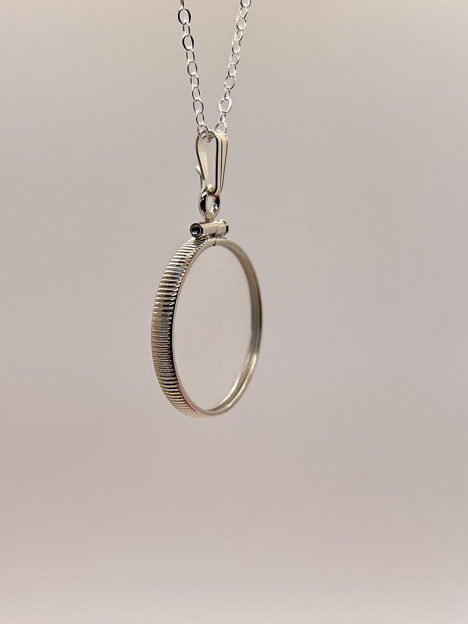 Up for sale: NEW 20 mm Handmade Sterling Silver empty shaker locket. These lockets can be opened with a small screwdriver. They are new and comprised of a sterling silver bezel and two mineral glass covers and an 8mm silver ribbed snap bail. You can choose your size of sterling silver chain at checkout. This shaker locket can be viewed from both sides and will store and display your little treasures. You can put gems, ashes, gold, hair, anything you can imagine. The pocket of space is small but works nicely for tiny items. Featured as examples are an empty locket, sand, a small, pressed flower, and 1.5 TCW- 2mm round cut emerald gems and a small printed photo.