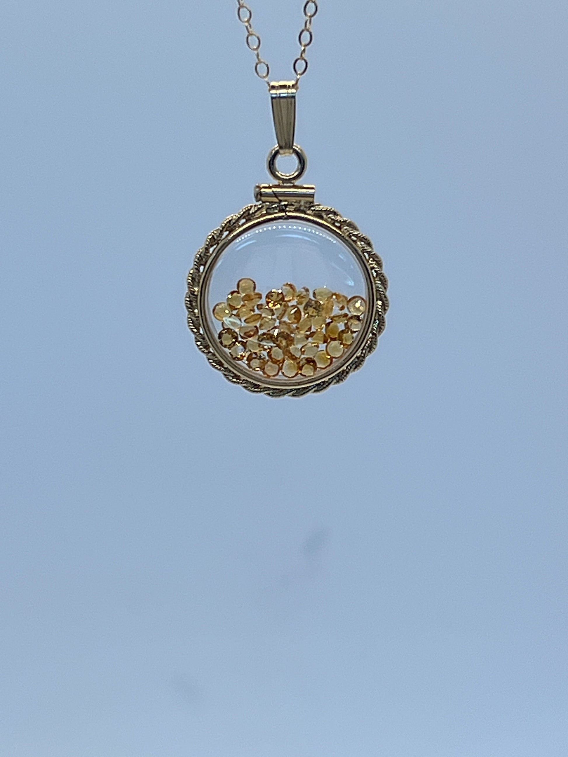 Hand Made 21 mm Nickel Size 14k Gold Filled Lucite Citrine Shaker Locket with ROPE EDGE, beautiful November Birthstone.