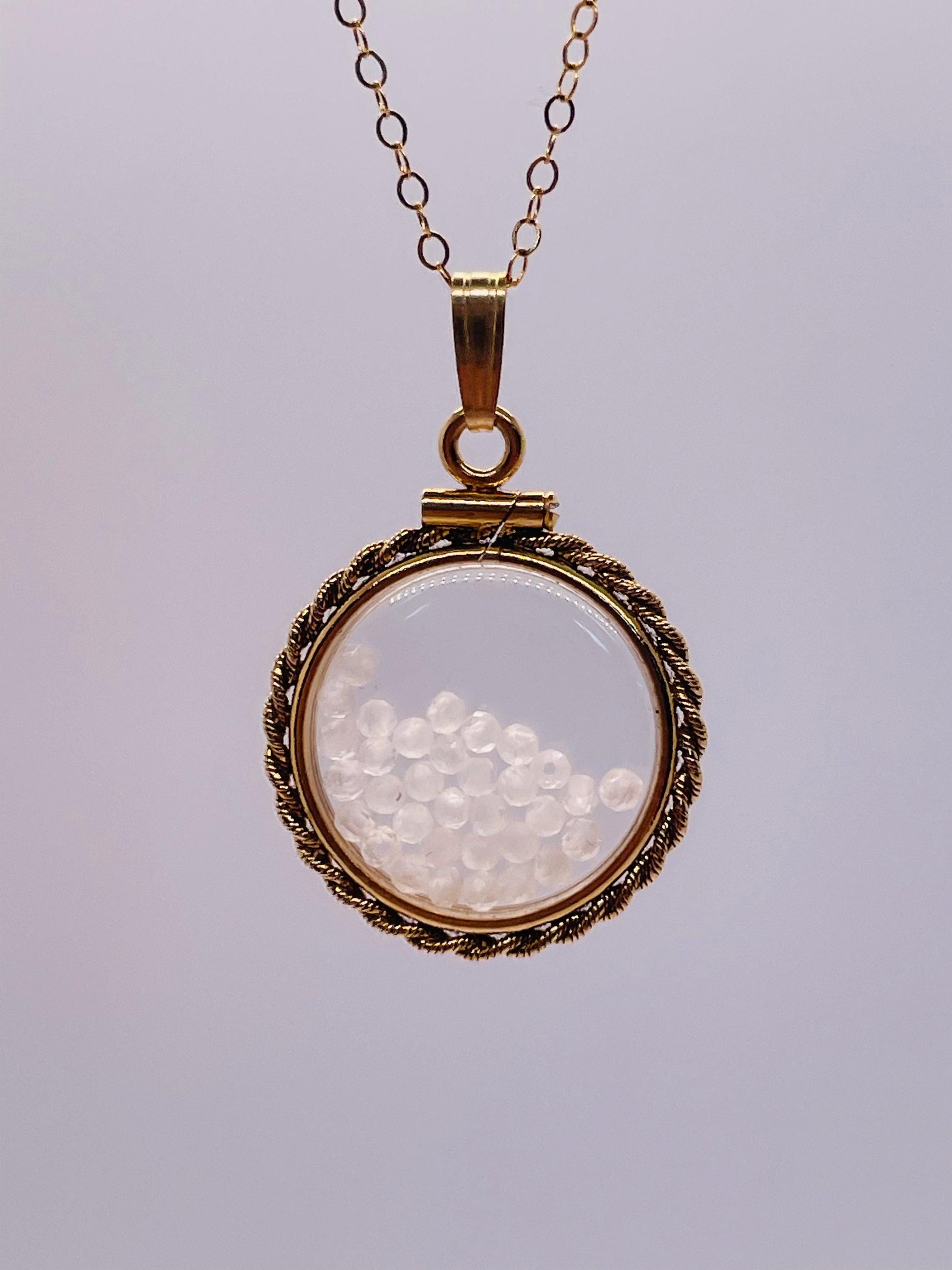Up for sale: A ROPE EDGE 21mm nickel size 14k gold filled Shaker Locket filled with natural genuine labradorite 2mm micro faceted beads. Each bead is fully faceted, cut, and has a small hole in it. These facets catch light and help show the myriad of different colors found in natural labradorite. If you have a particular affinity for labradorite or you just like cool eye catching jewelry, then this locket is for you. They are new, handmade and have never been worn. Add a new 14k gold filled cable chain or just buy the locket with a 14k gold filled snap bail. The locket portion is 18mm in diameter and the locket out to the rope edge is 21 mm in diameter.