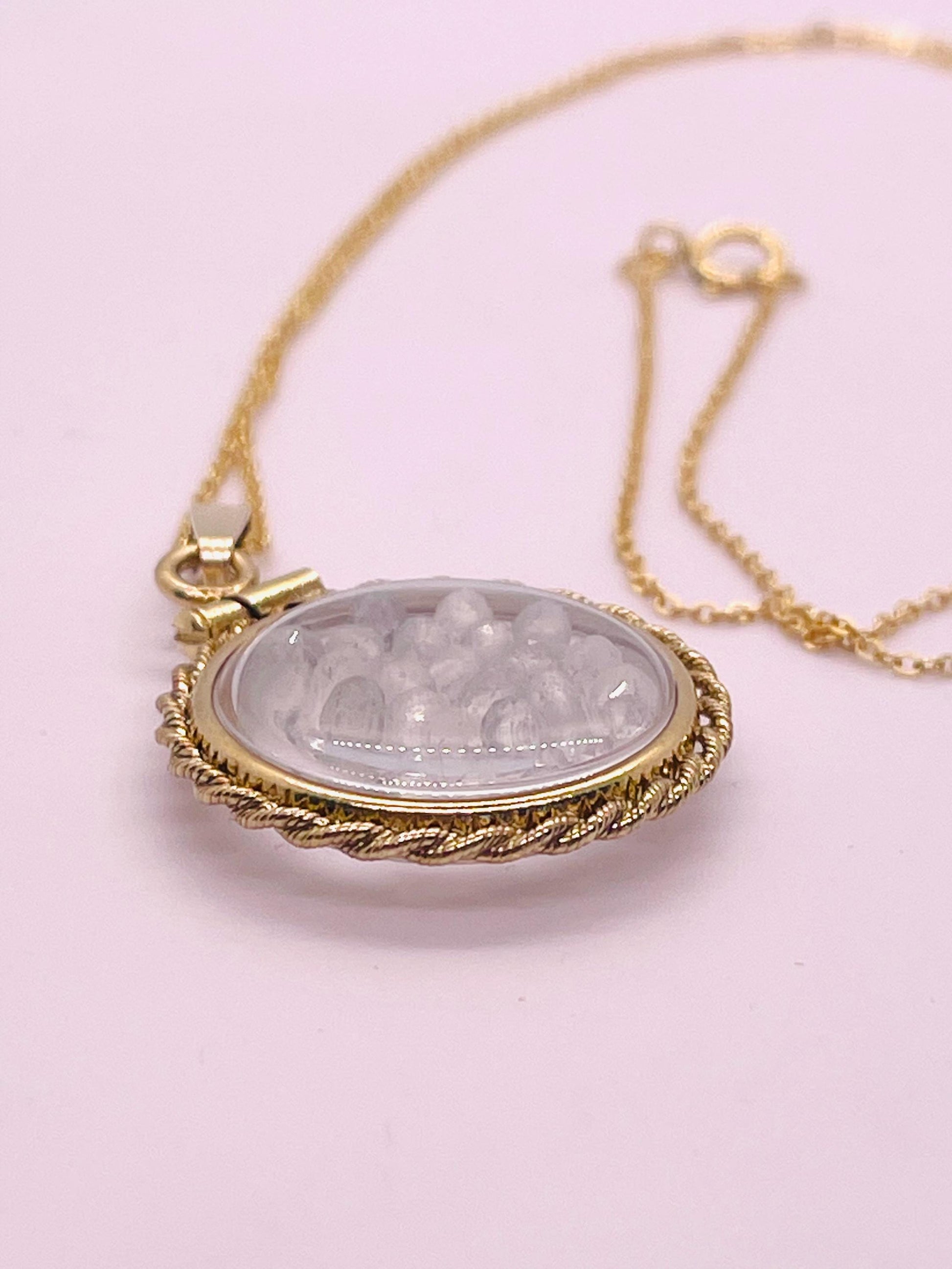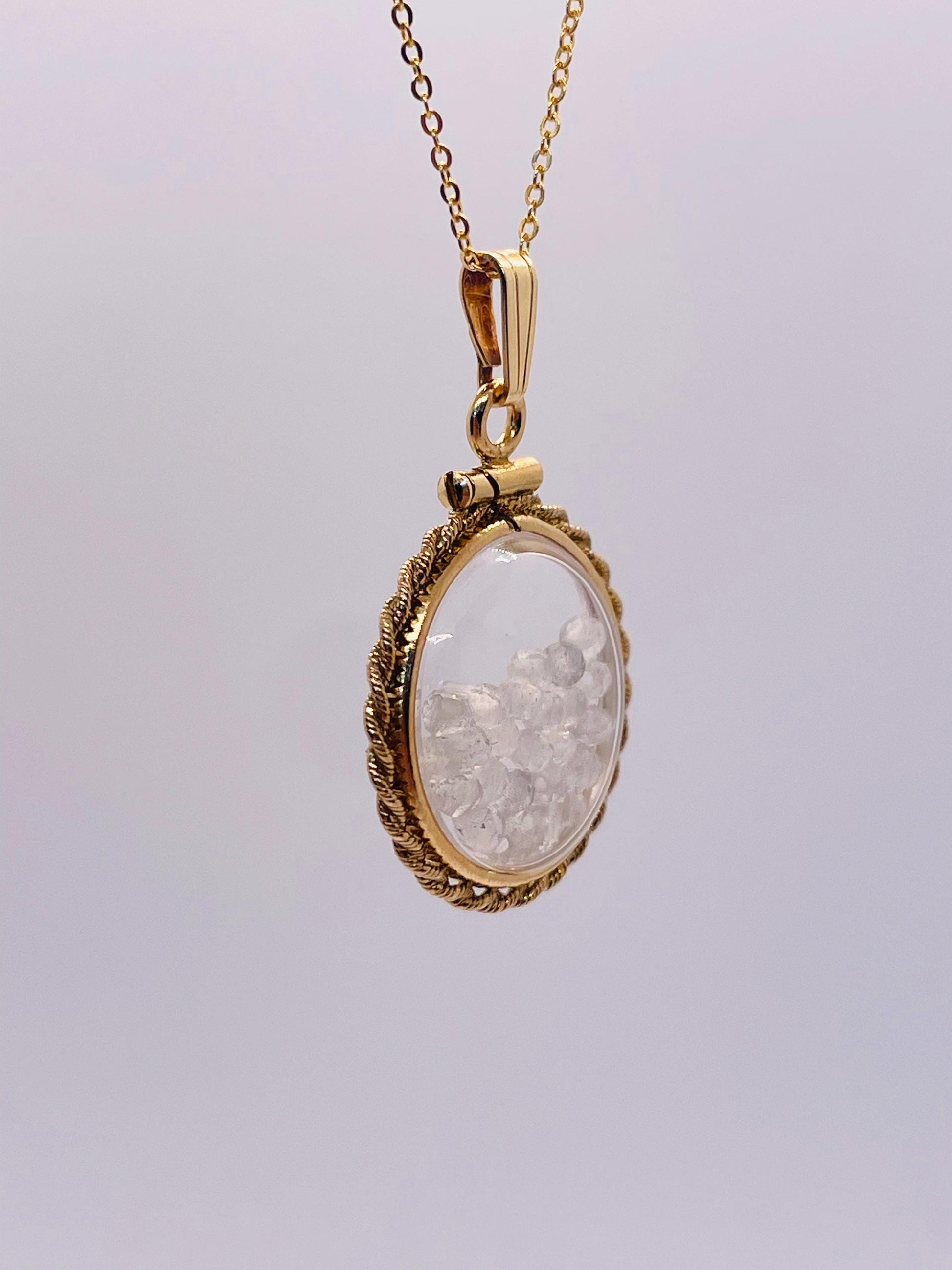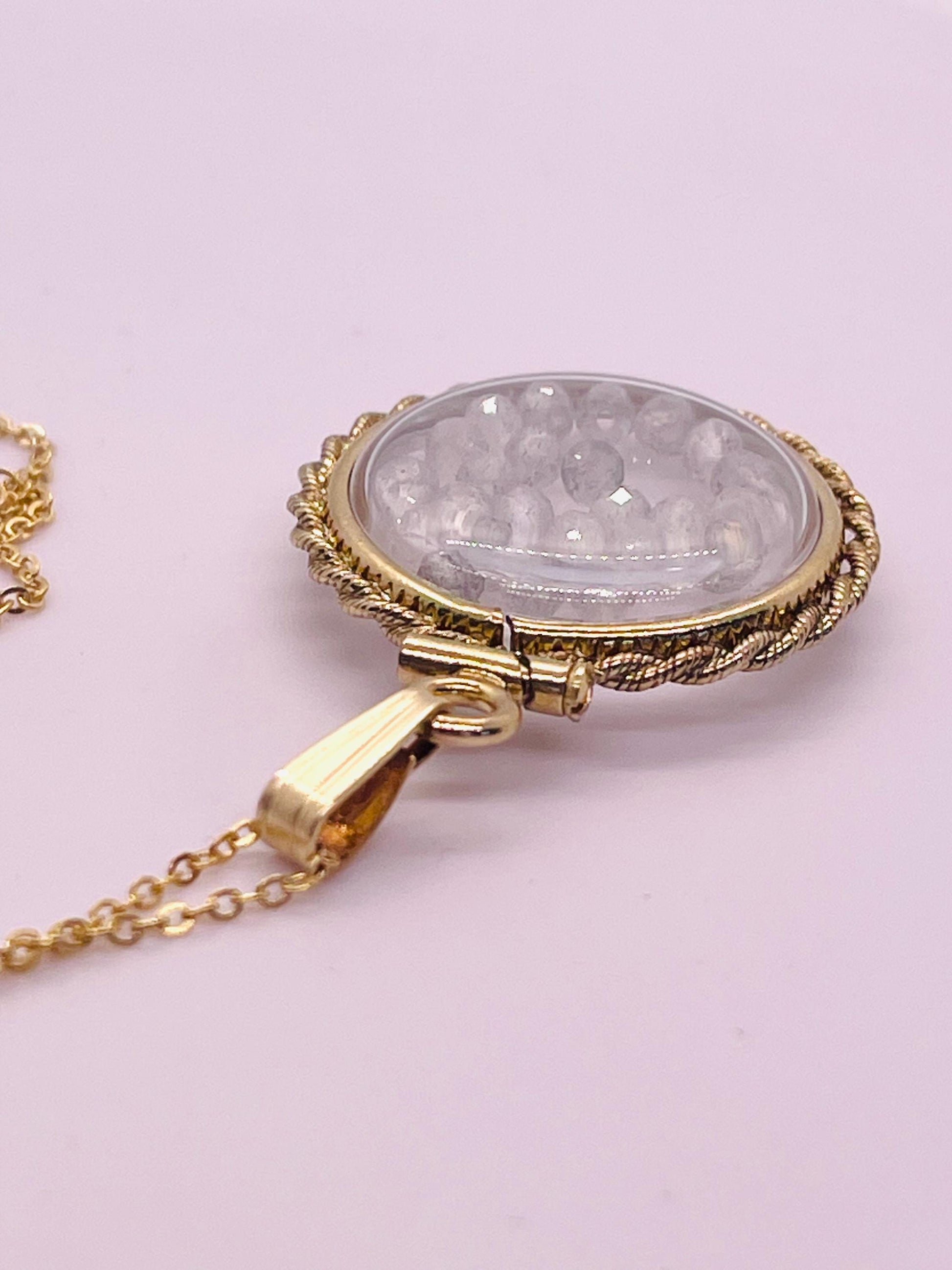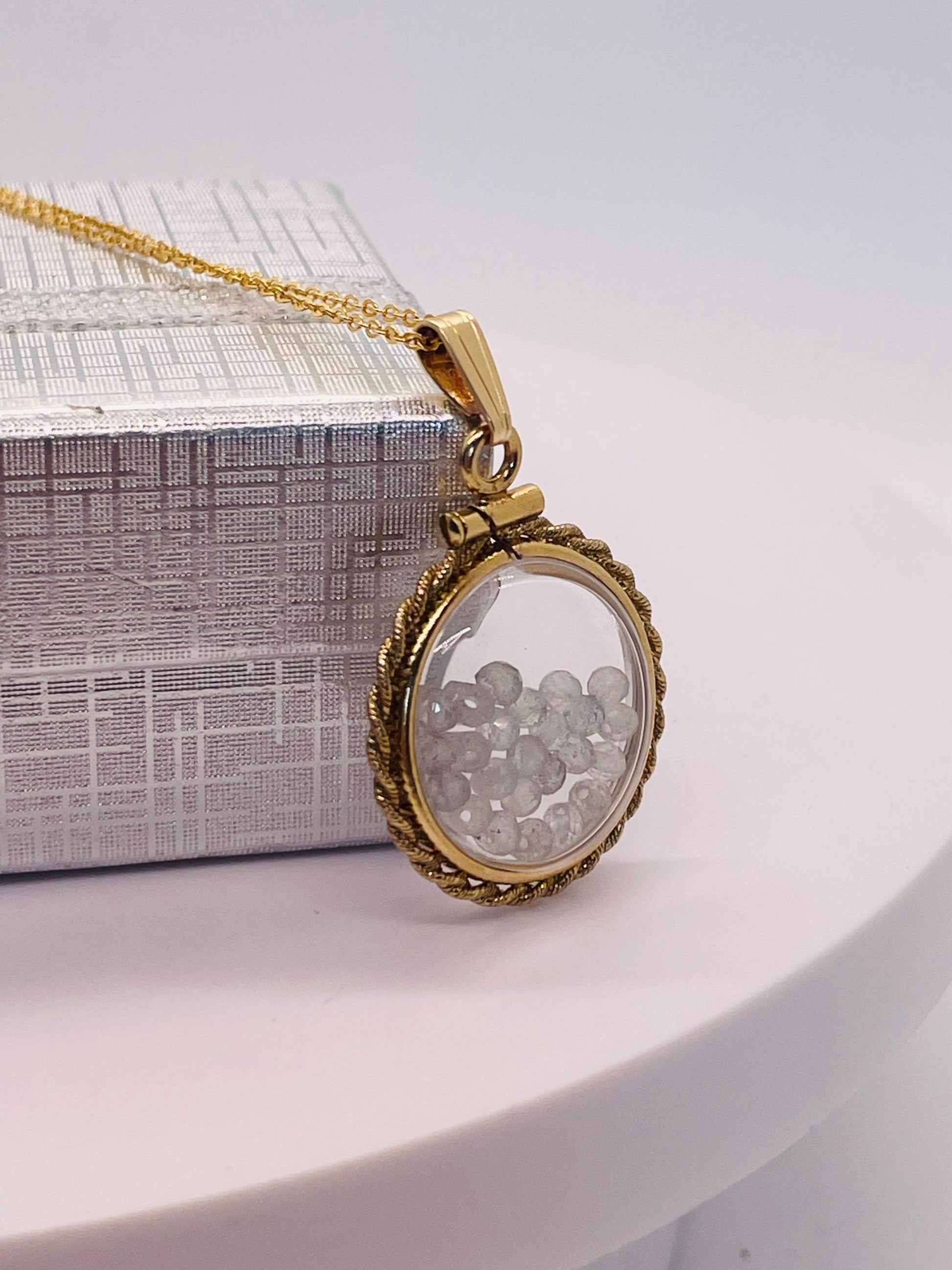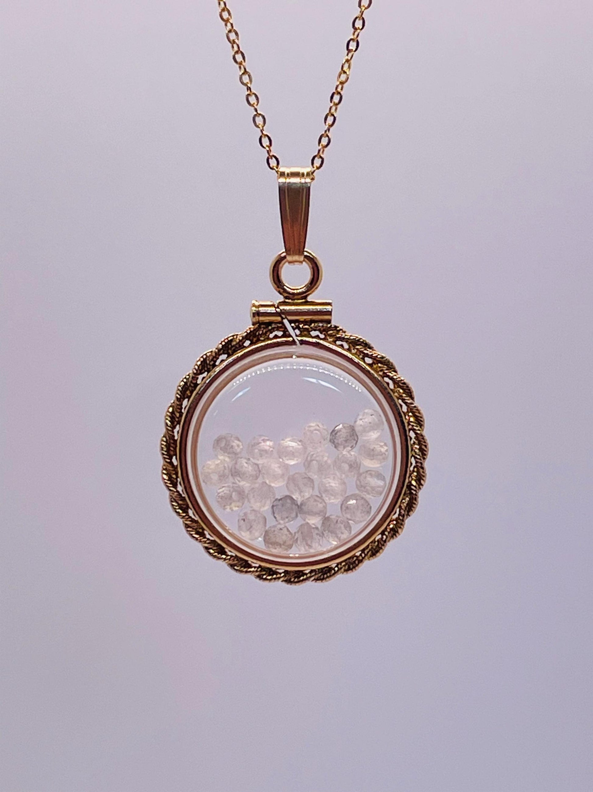 Hand Made 21 mm Nickel Size 14k Gold Filled Lucite Genuine Moonstone Shaker Locket with ROPE EDGE and Beautiful Bead Crystals.