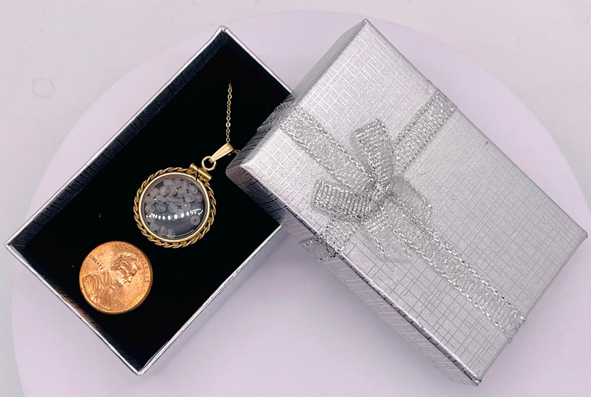 The picture with presentation box has a duplicate locket with a different gem to showcase size and details of presentation box.