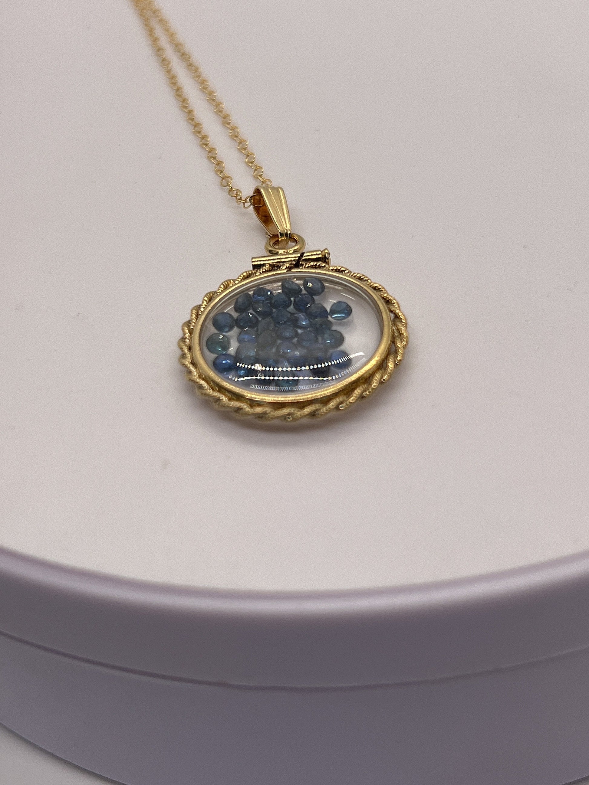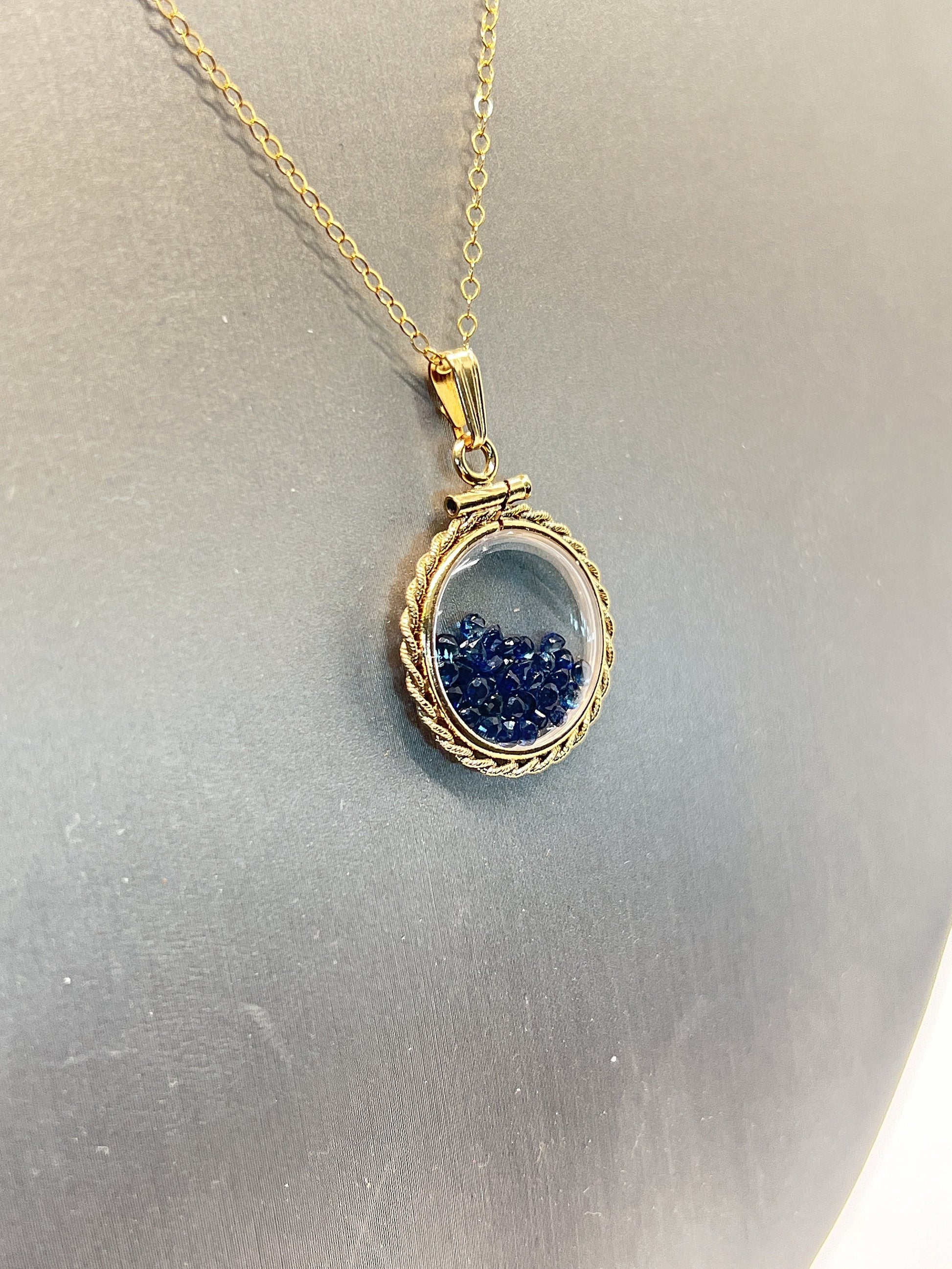 Up for sale: Up for sale: A ROPE EDGE 21mm nickel size 14k gold filled Shaker Locket glowing blue with September's birthstone gems inside. If your birthstone is Sapphire (birthstone for September) or you just like cool eye catching jewelry, then this locket is for you. Add a new 14k gold filled cable chain at check out. Please see my other auctions for additional creations with these lockets. This locket is made with a 14k gold filled bezel and two lucite covers. Also comes with a 14k gold filled 8 mm snap bail.