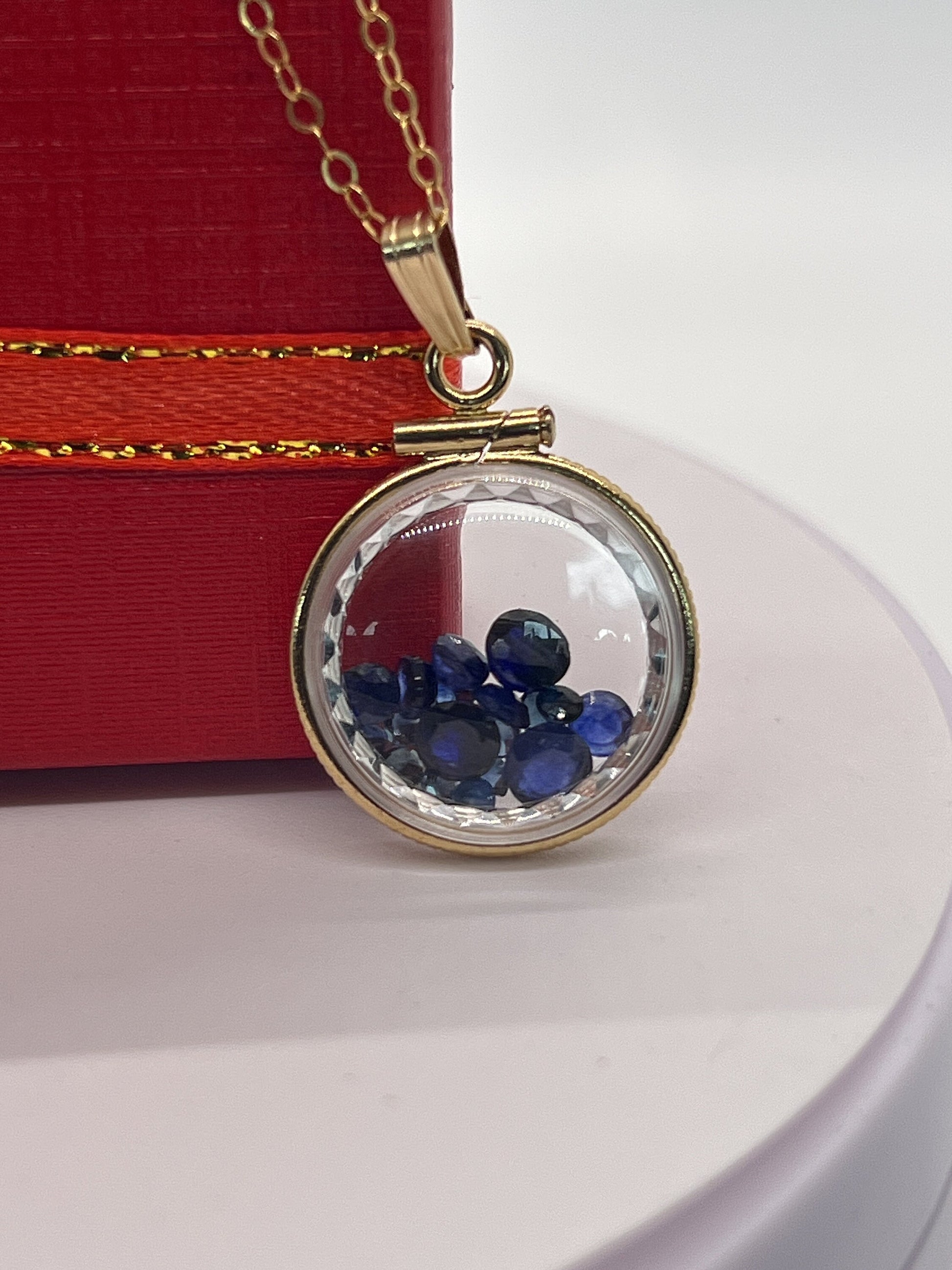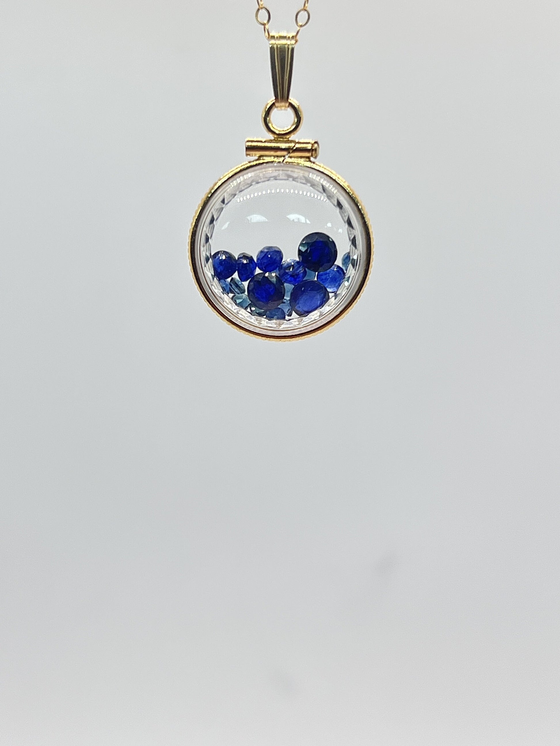 Hand Made Diamond edge dime Size 14k Gold Filled Lucite Shaker Locket with 2.75 tcw round cut genuine blue sapphires ,September Birthstone.