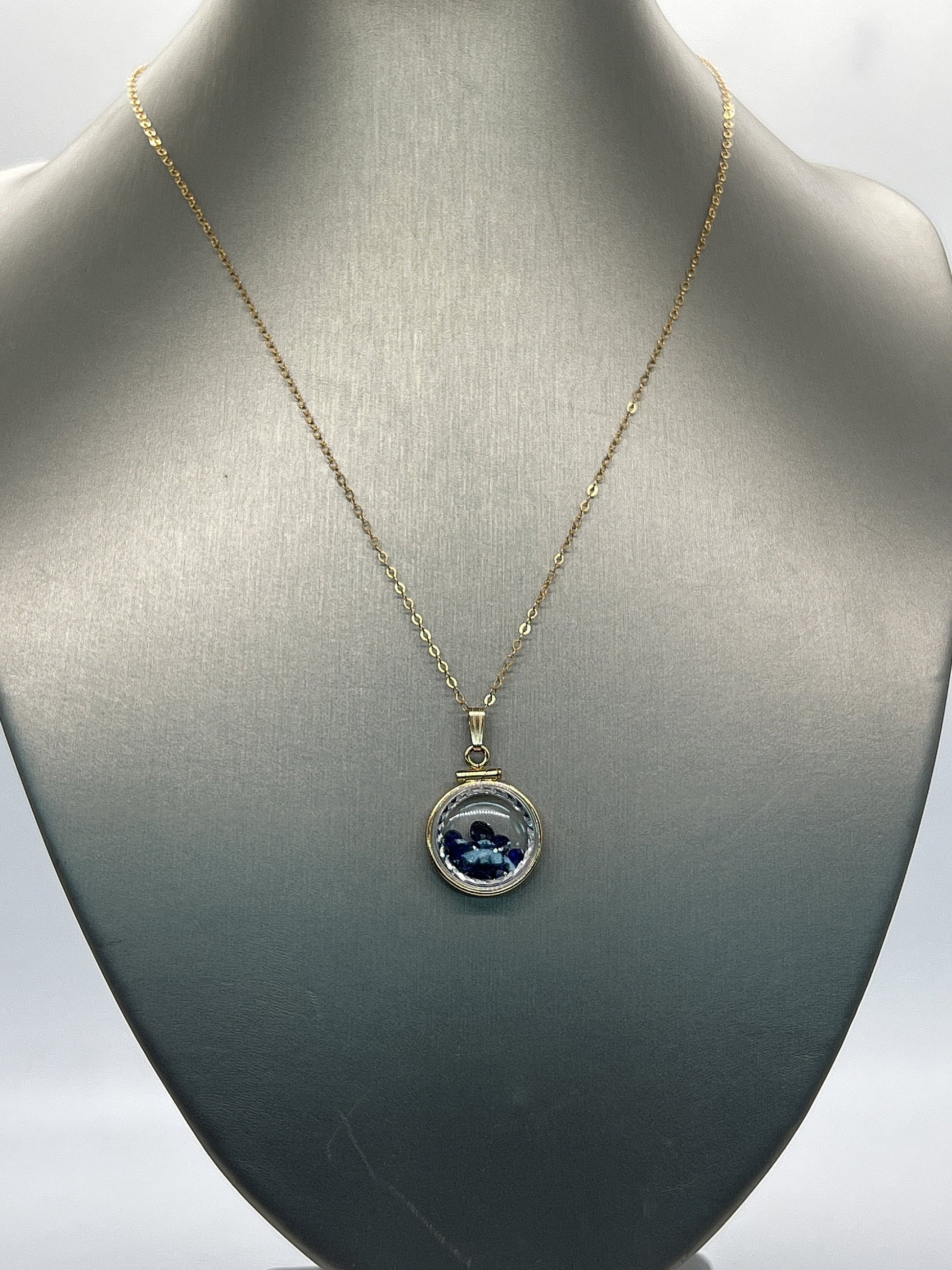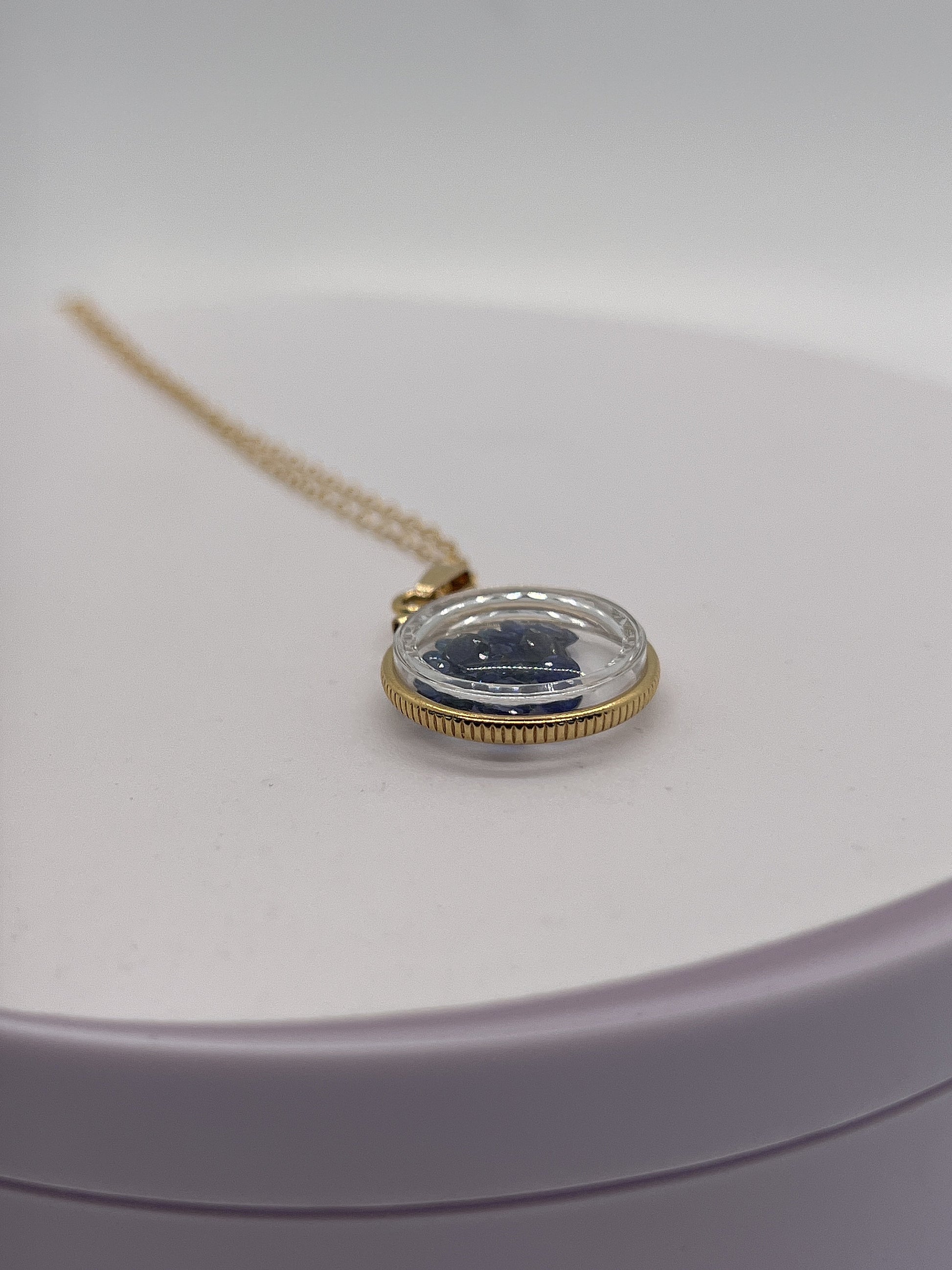 Up for sale: Up for sale: An 18mm Diamond EDGE dime size 14k gold filled Shaker Locket glowing blue with September's birthstone gems inside. If your birthstone is Sapphire (birthstone for September) or you just like cool eye-catching jewelry, then this locket is for you. Add a new 14k gold filled cable chain at check out. Please see my other auctions for additional creations with these lockets. This locket is made with a 14k gold filled bezel and two Lucite covers. Also comes with a 14k gold filled 8 mm snap bail.