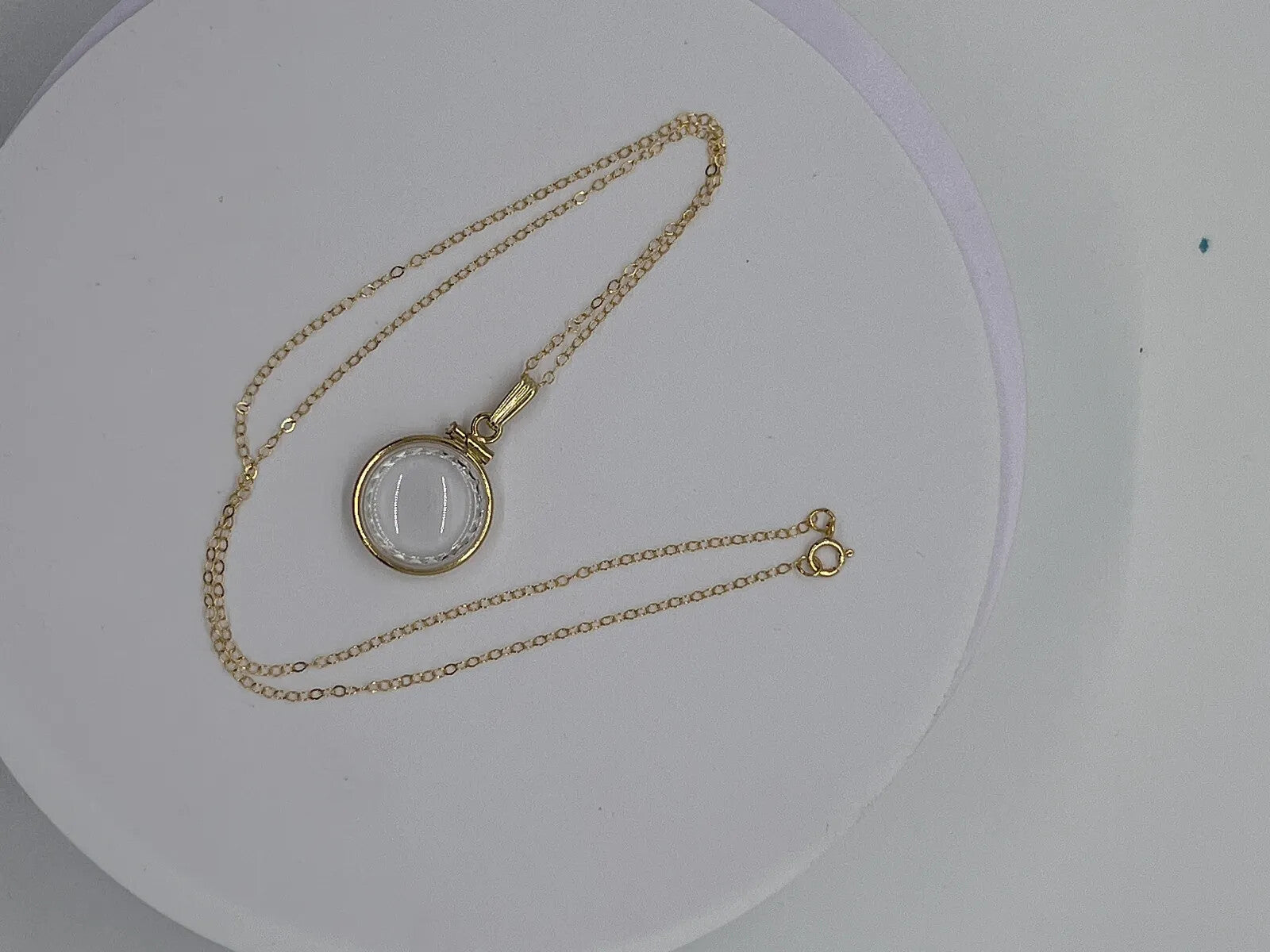 Up for sale: NEW 16 mm Handmade 14k solid gold shaker locket. These locket looks fabulous from both sides and is reversible. These are smaller than a dime. This one comes with a diamond edge feature. I love that it looks outstanding from both sides. These lockets can be opened with a small screwdriver. They are new and comprised of a solid 14 gold bezel and two Lucite covers and a solid 14k gold snap bail. Locket hallmarked 14k. You can choose your size of 14k gold filled cable chain at checkout. This shaker locket can be viewed from both sides and will store and display your little treasures. You can put gems, gold, hair, anything you can imagine. Shown with 2 CTW of 3 mm round cut tanzanite. Will accommodate 4mm gems as well. See all of my listing for examples and ideas. What will you put in yours? Empty lockets come with free Screwdriver (same one that I use to build these).