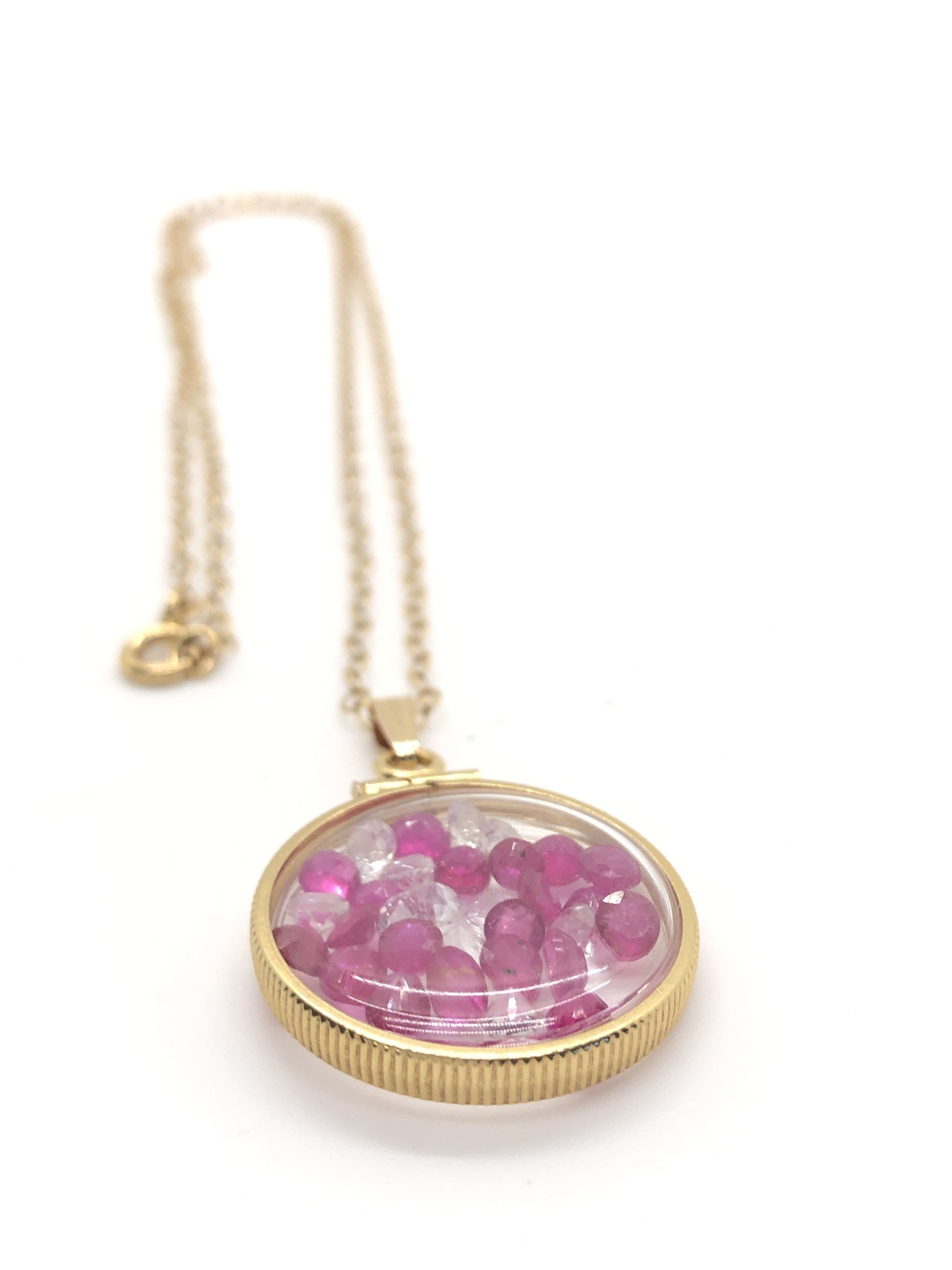 This wonderful locket comes apart easily with a small eyeglass screwdriver so you can add or subtract tiny keepsakes.The picture with the pretty model is the same locket with different stones just to show beauty and size as worn.This Locket contains:Over 3.85 TCW Natural round cut Red Ruby Gem Stones. 1.75 TCW White Topaz round cut gemsI can make a second locket like this made to order Shipped free with USPS First Class Package and comes with a nice gift box, colors vary.To see other wonderful items click the links below: Click this link to see Vintage Shaker Locketshttps://www.etsy.com/shop/TimeTalentNTreasures?ref=seller-platform-mcnav§ion_id=28856113Click this link to see Handmade Crafted Shaker Locketshttps://www.etsy.com/shop/TimeTalentNTreasures?ref=seller-platform-mcnav§ion_id=32189637Click this link to see Handmade Bullet Shaker Locketshttps://www.etsy.com/shop/TimeTalentNTreasures?ref=seller-platform-mcnav§ion_id=29685070Click this link to see Handmade Vintage Bullet Shaker Locketshttps://www.etsy.com/shop/TimeTalentNTreasures?ref=seller-platform-mcnav§ion_id=32738269Click this link to see Vintage Silver Earringshttps://www.etsy.com/shop/TimeTalentNTreasures?ref=seller-platform-mcnav§ion_id=29685074