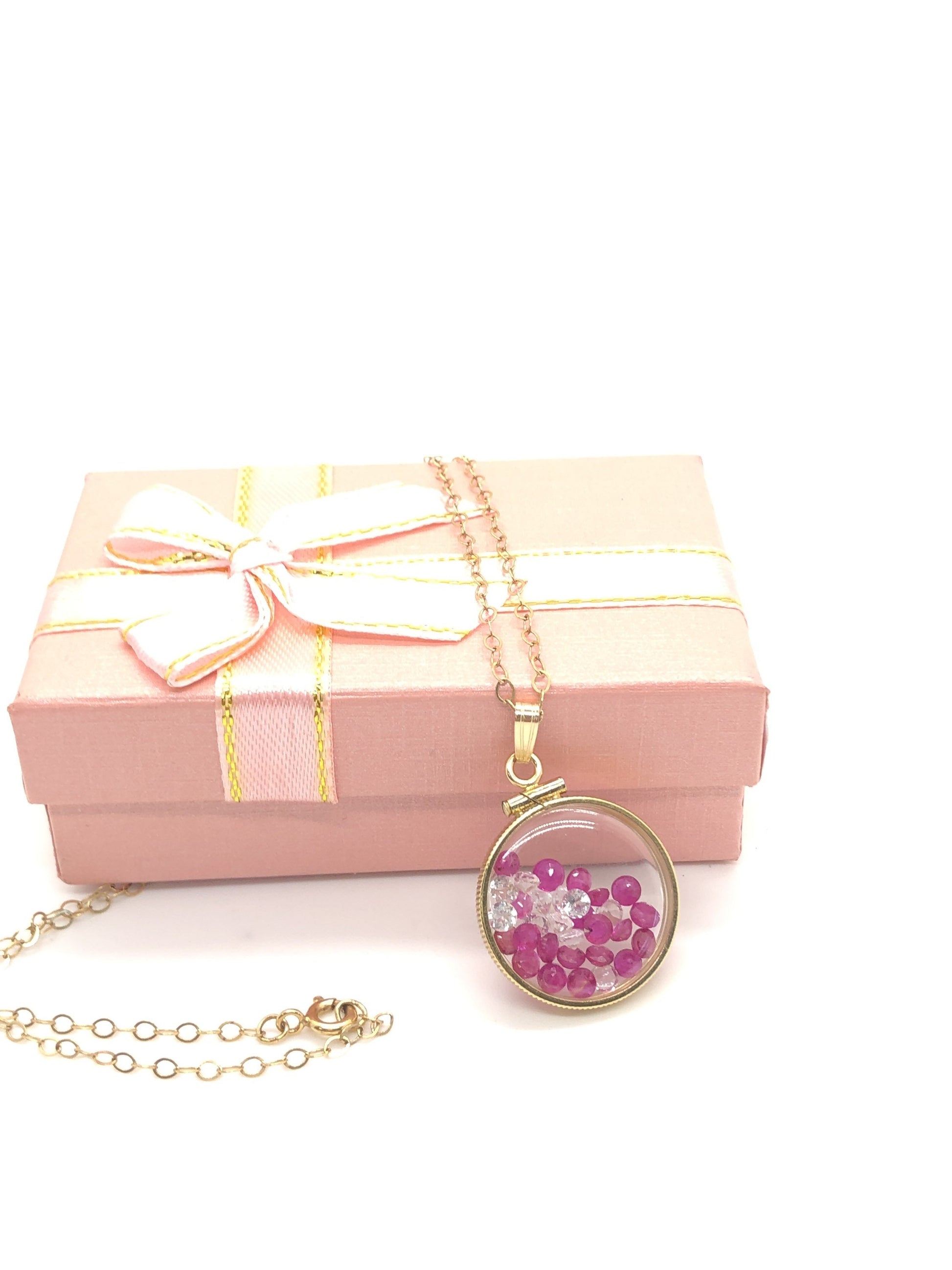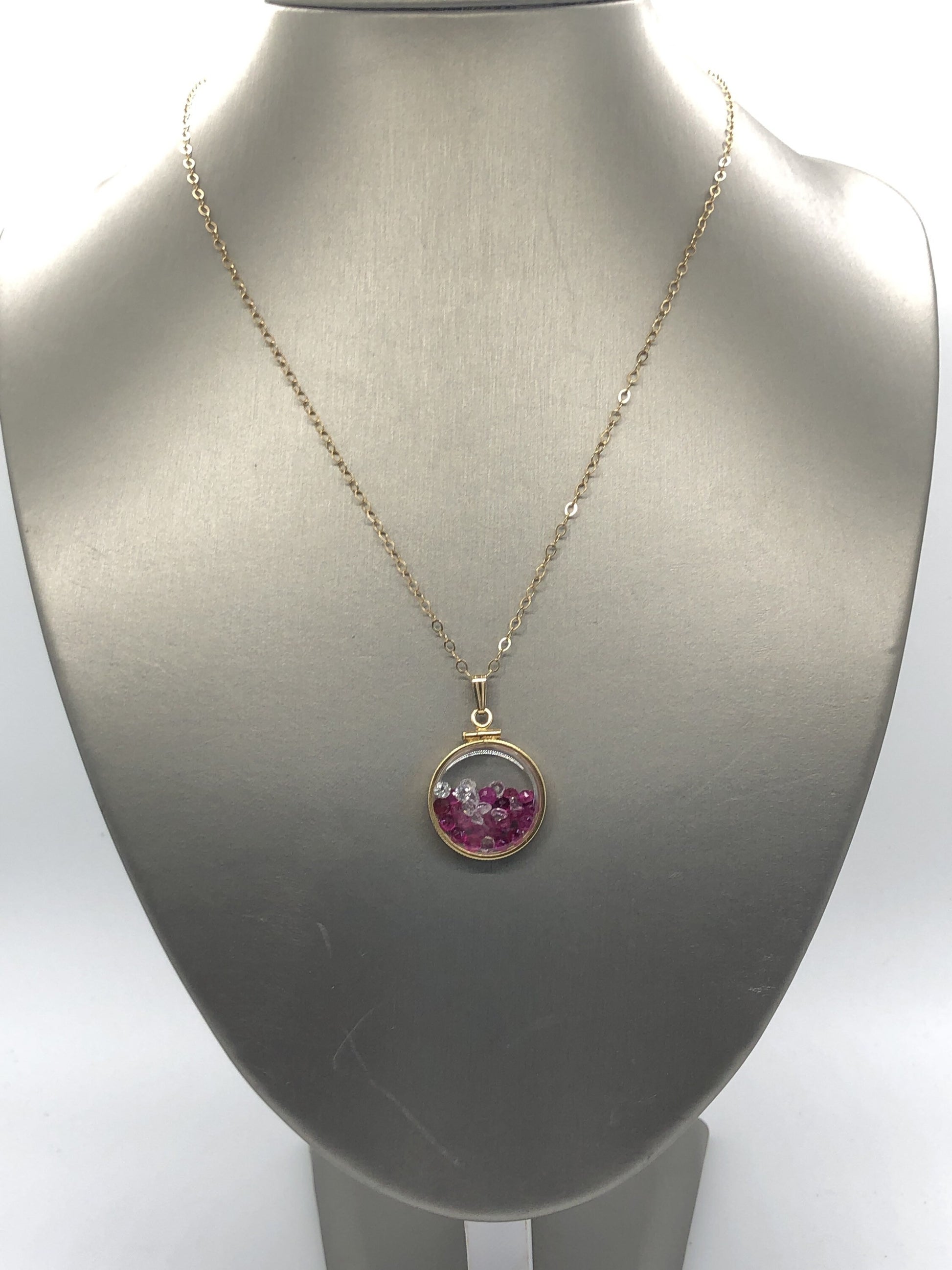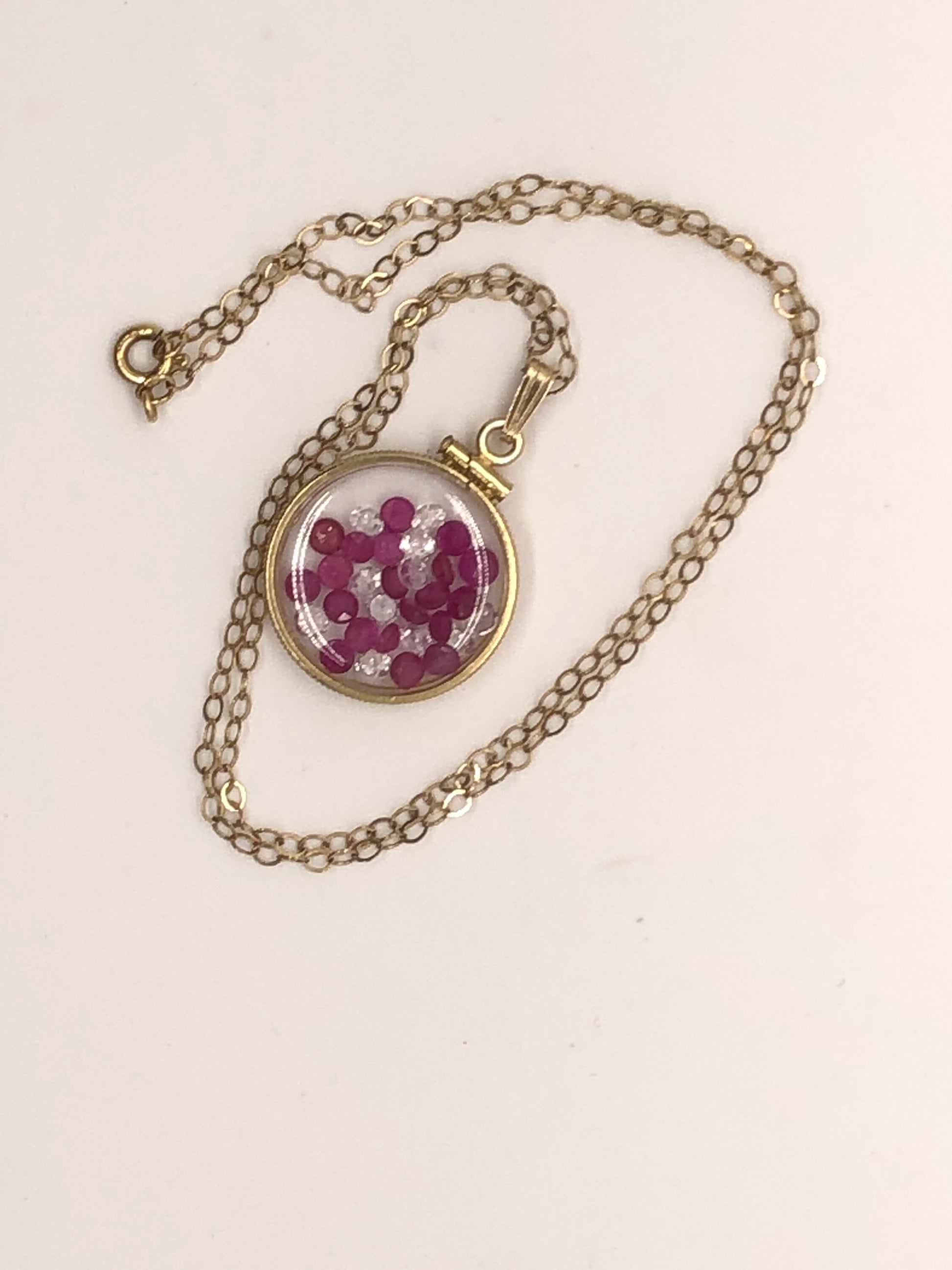 Up for sale: A 20 mm 14k gold filled shaker locket ( or sterling silver) glowing red with July's birthstone and White topaz gems inside. If your birthstone is Ruby (birthstone for July) or you just like cool eye catching jewelry, then this locket is for you. I've added a new 18 inch 14k gold filled cable chain and a few new gemstones to create an eye catching creation. Please see my other auctions for additional creations with these lockets. Choose 14k gold filled or Sterling Silver at checkout. The last image in this listing shows the Sterling Silver option, with an 18 inch Sterling Chain and round jump ring. These are hand made so some small difference may be seen in any duplicate lockets