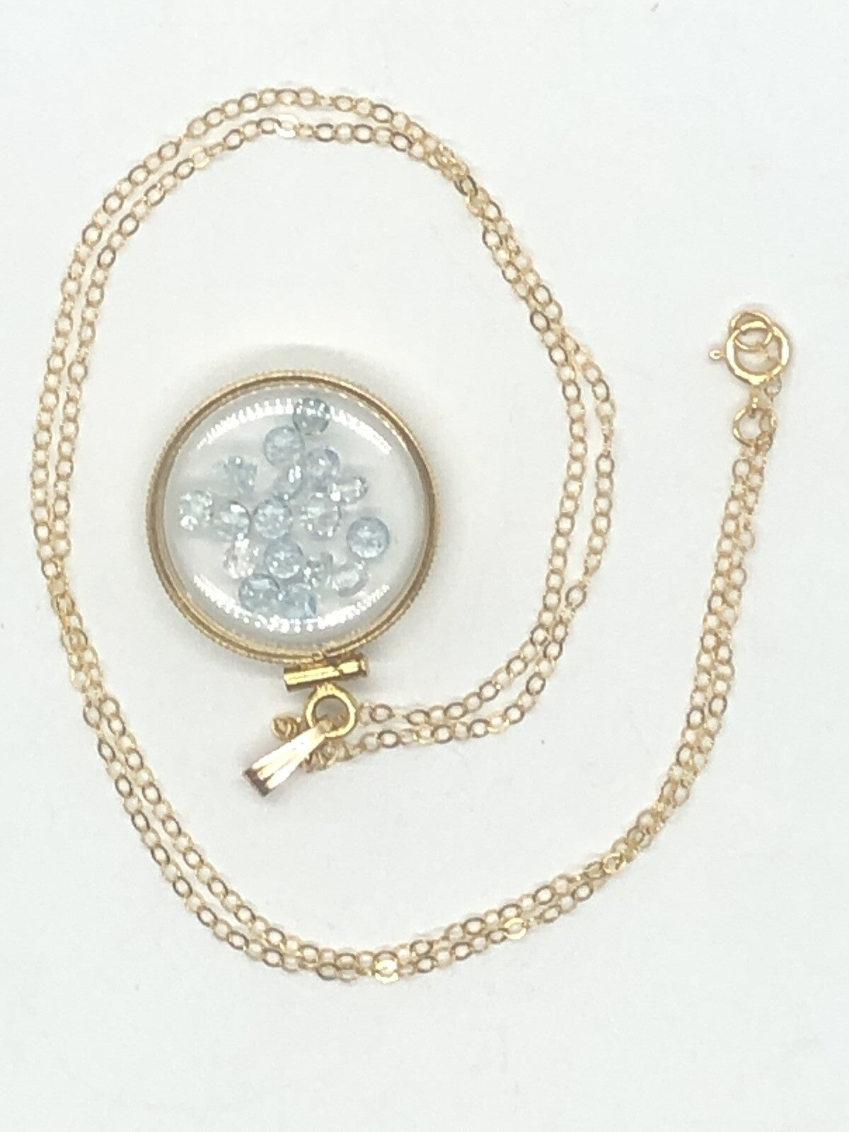 Up for sale: A 20 mm 14k gold filled ( or sterling silver) Shaker locket glowing purple with March's birthstone gems inside. If your birthstone is Aquamarine (birthstone for March) or you just like cool eye catching jewelry, then this locket is for you. I've added a new 18 inch 14k gold filled cable chain and a few new gemstones to create an eye catching creation. Please see my other auctions for additional creations with these lockets.