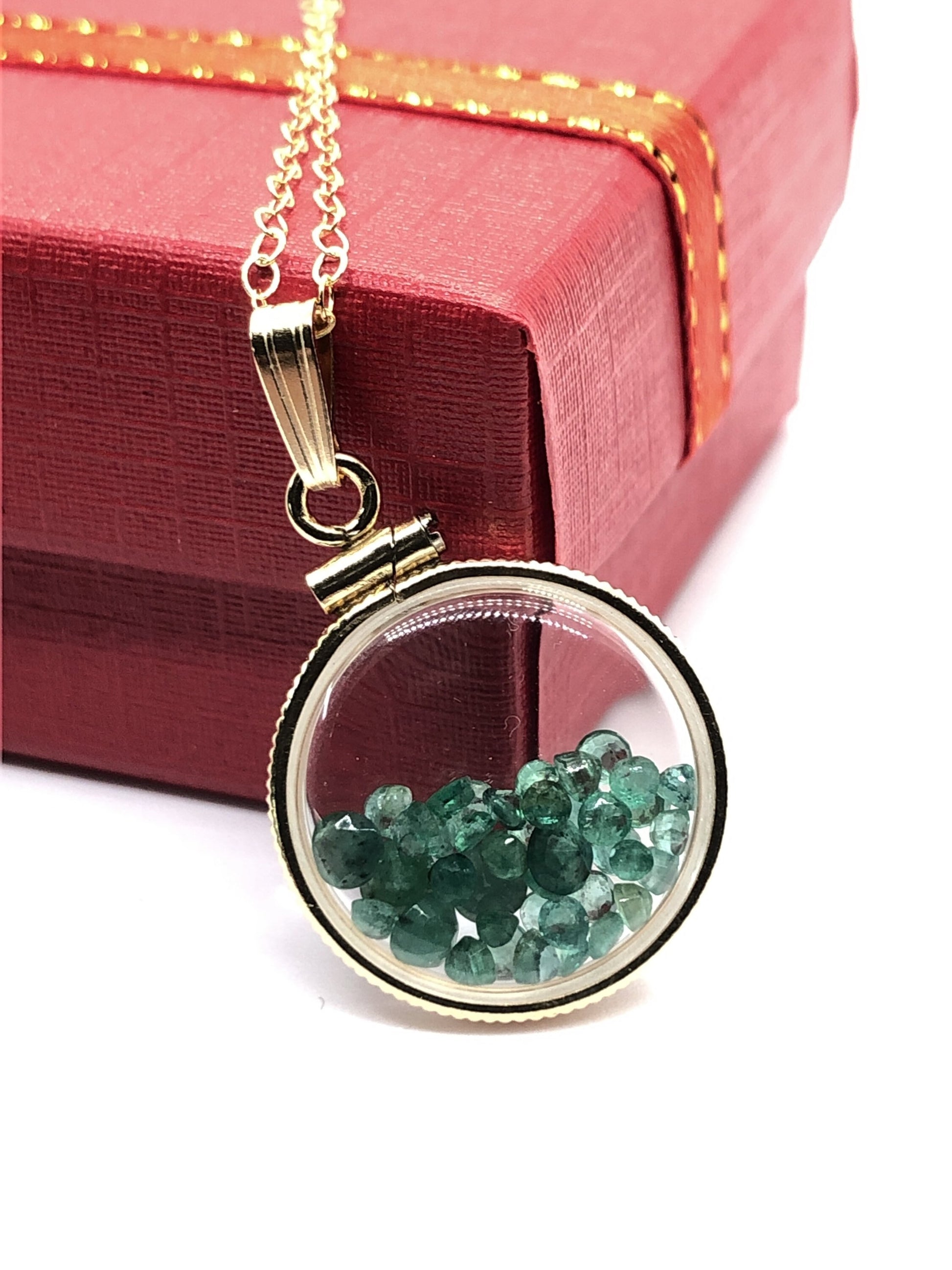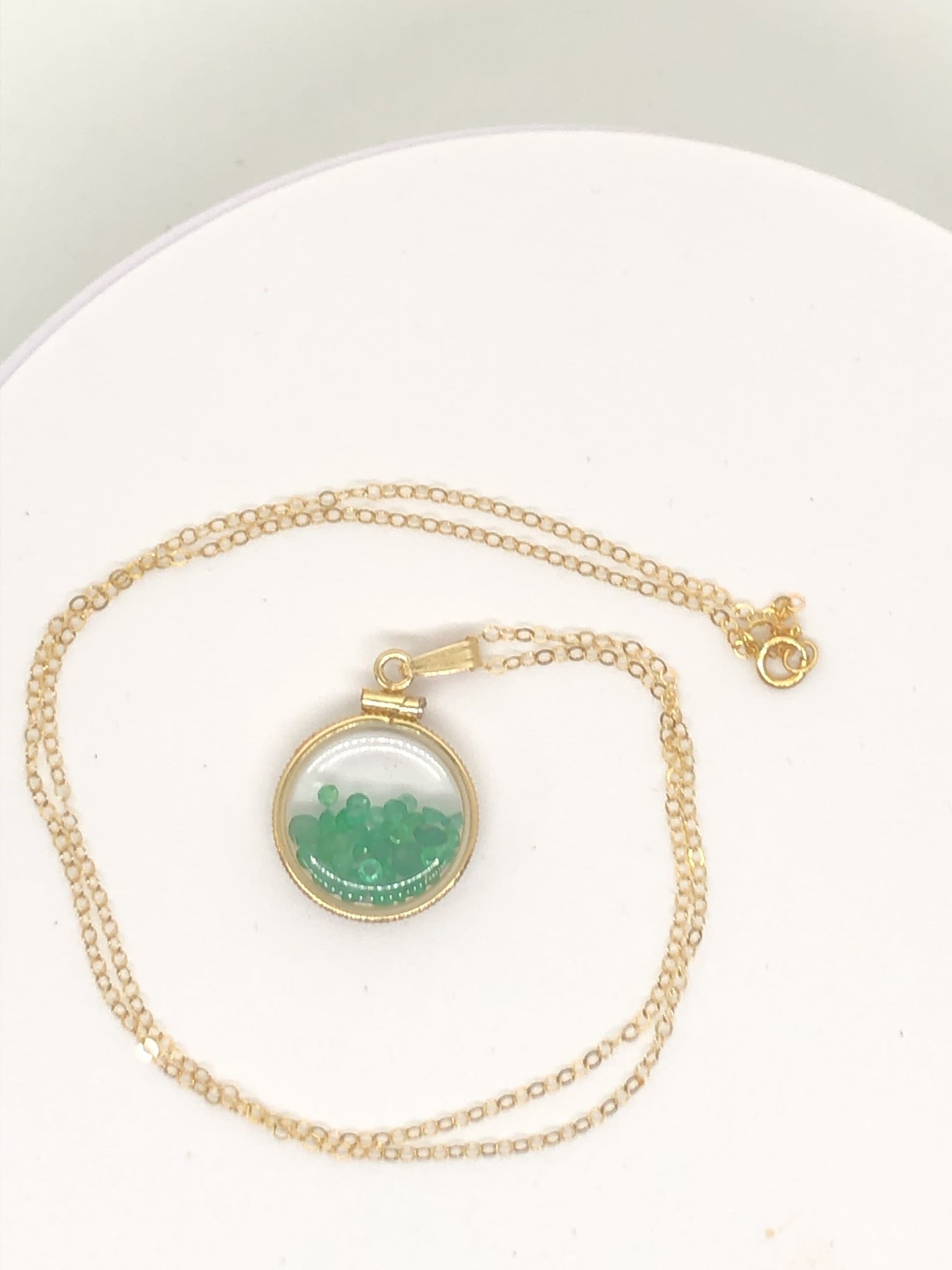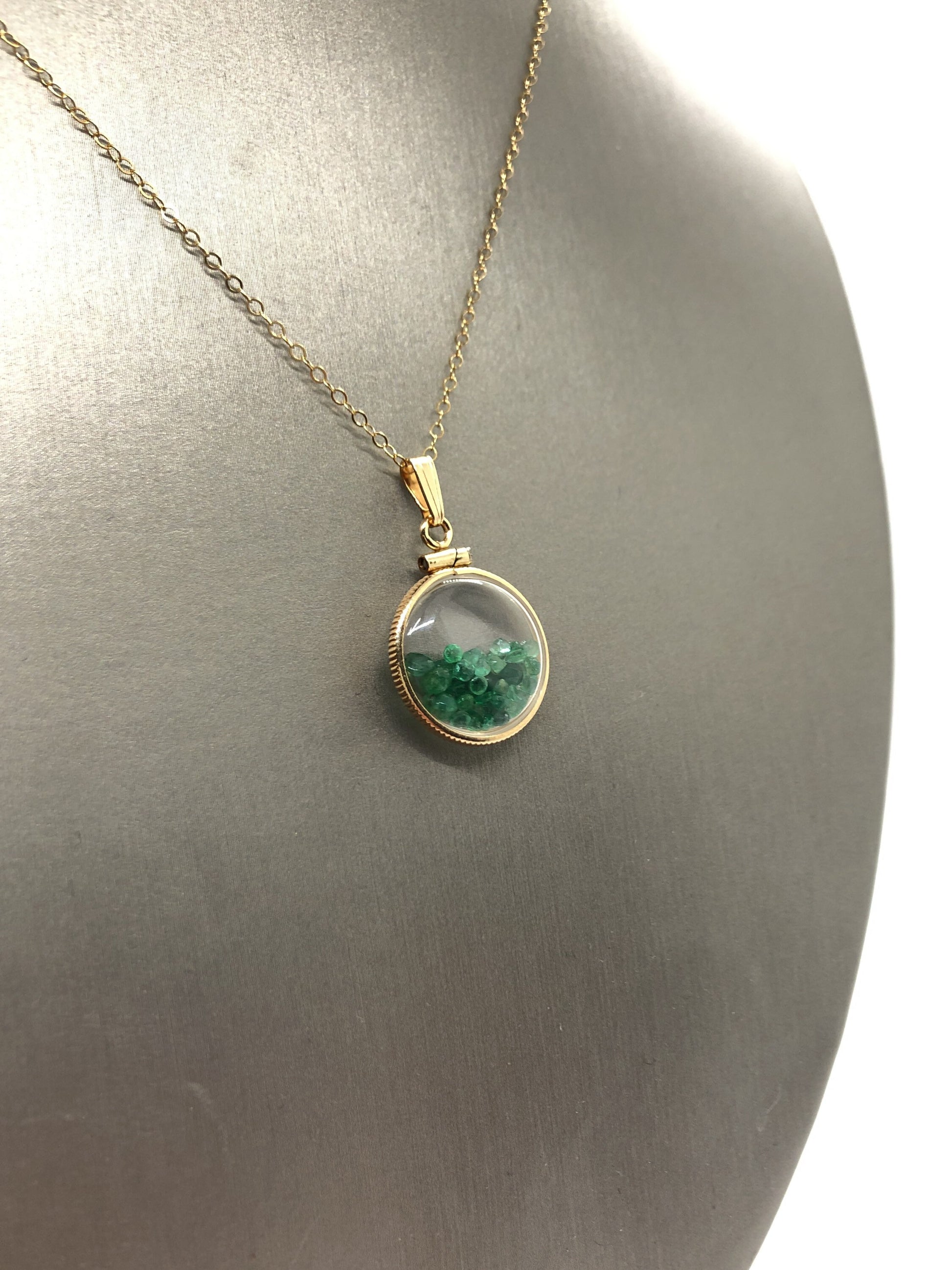 Handmade Dime-size Emerald Shaker Locket 14k Gold-Filled Lucite View Locket, Necklace, Beautiful May Birthstone.