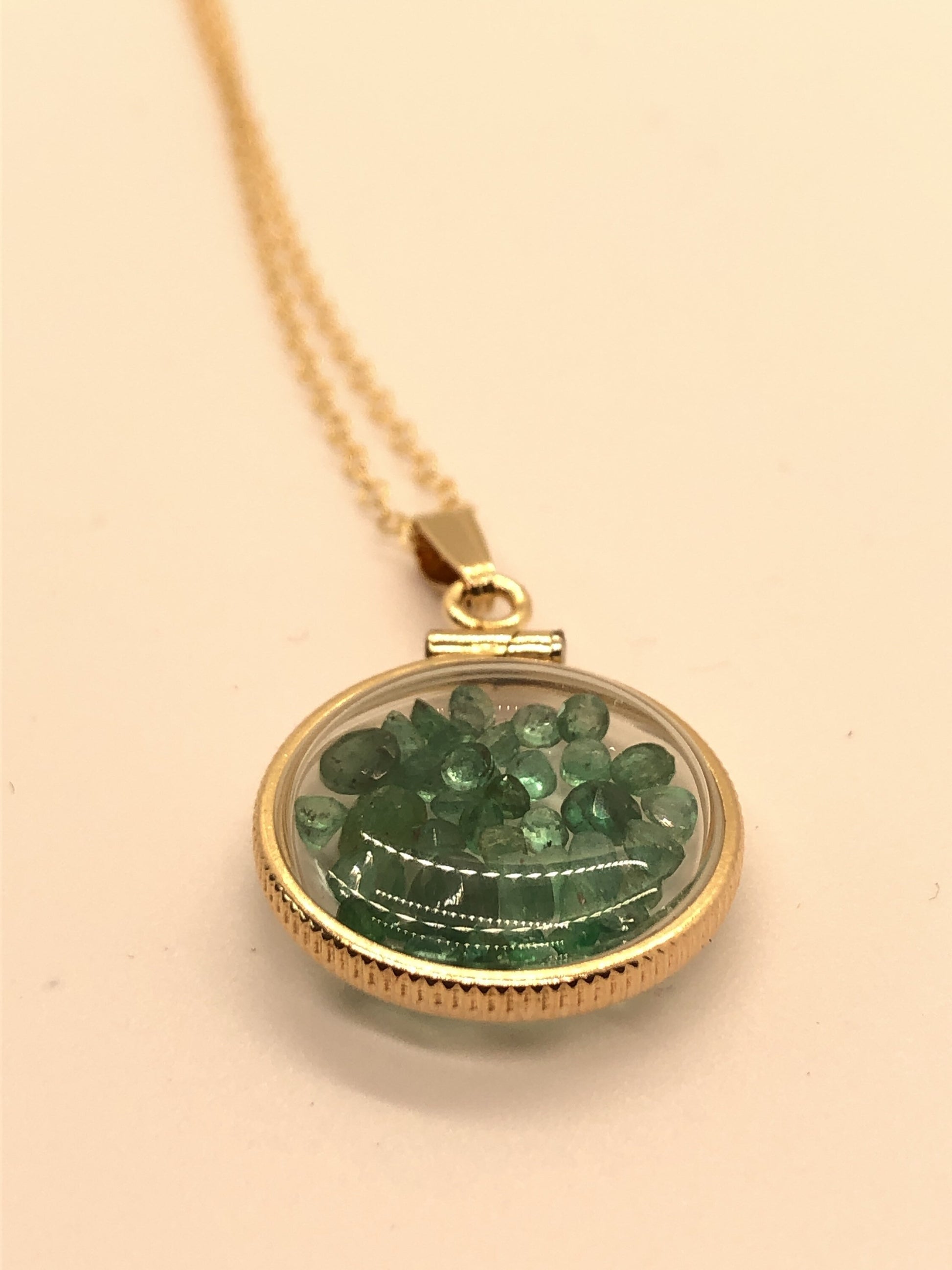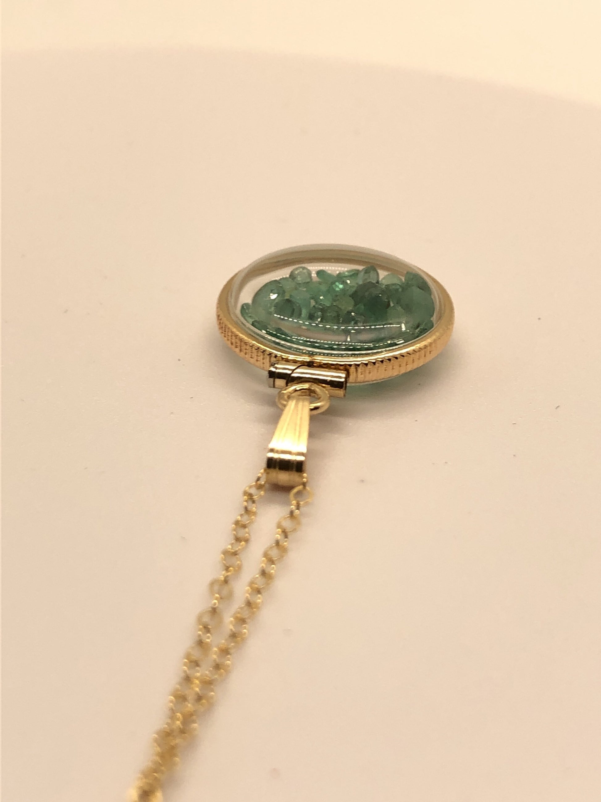 Up for sale: An 18mm 14k gold filled shaker locket glowing green with May’s birthstone gems inside. If your birthstone is Emerald (birthstone for May) or you just like cool eye catching jewelry, then this locket is for you. Choose your size of 16–24-inch chain to complement this locket at checkout. Comes filled with 2.0 TCW of genuine round cut emerald. Please see my other auctions for additional creations with these lockets.