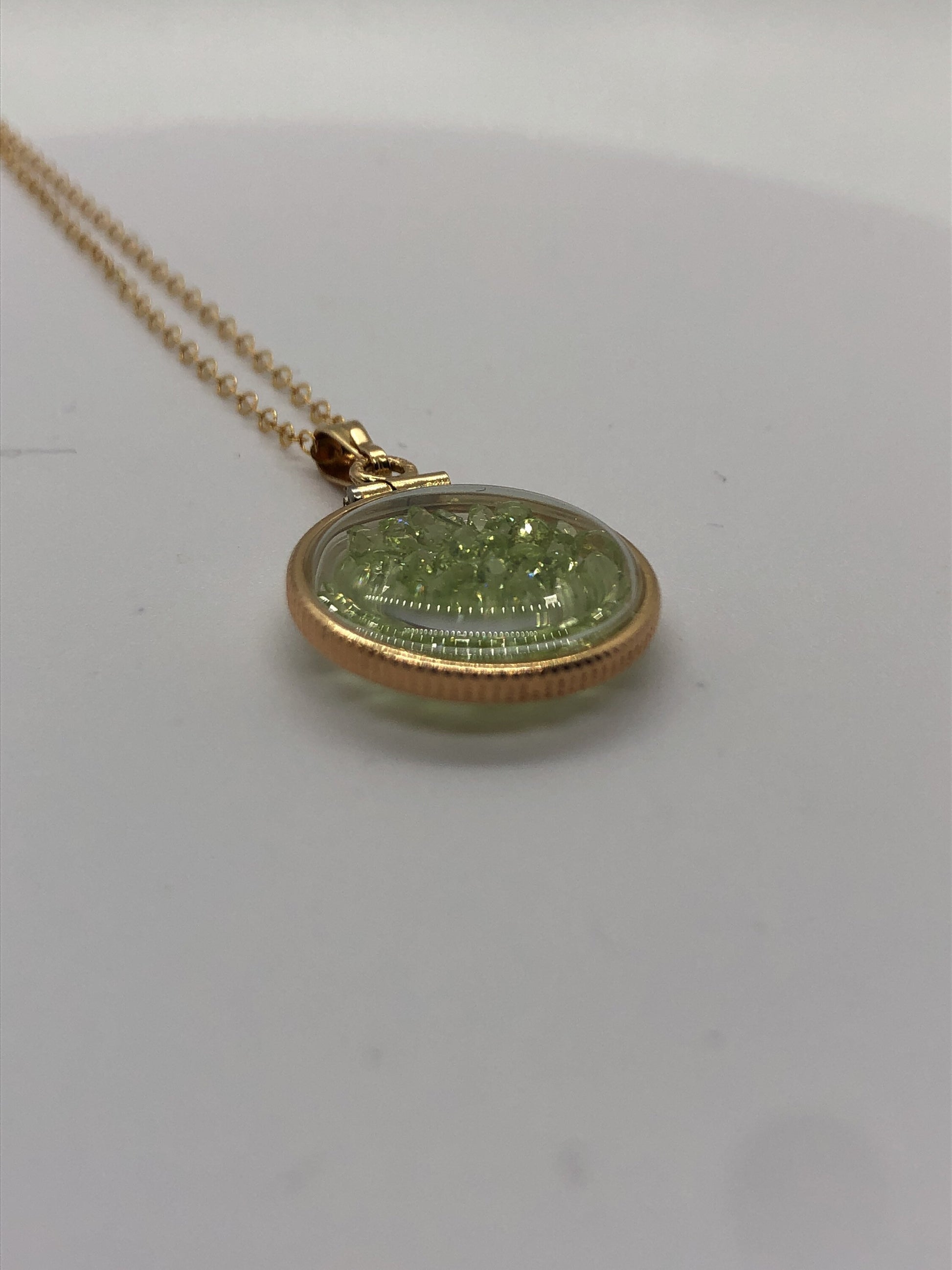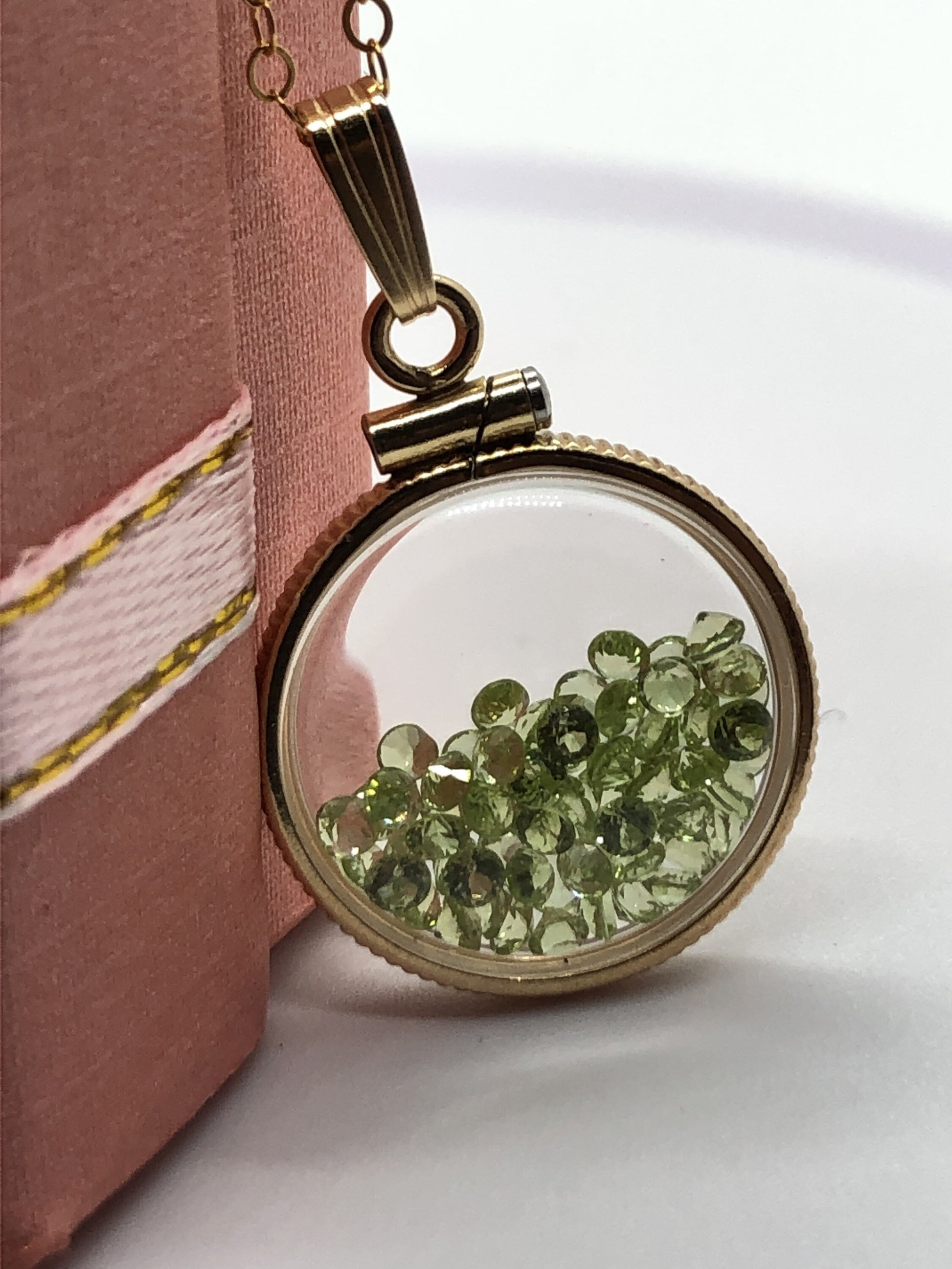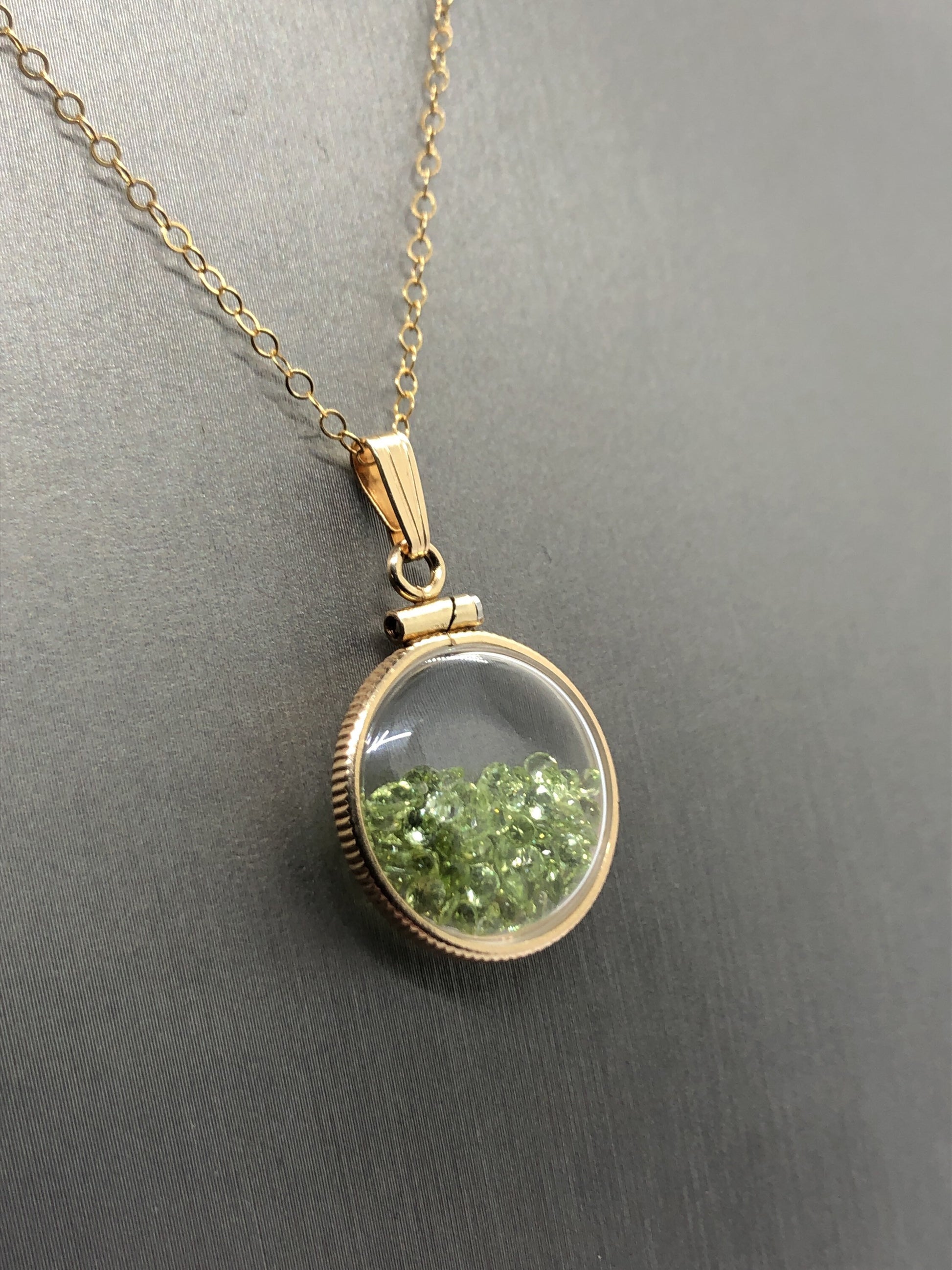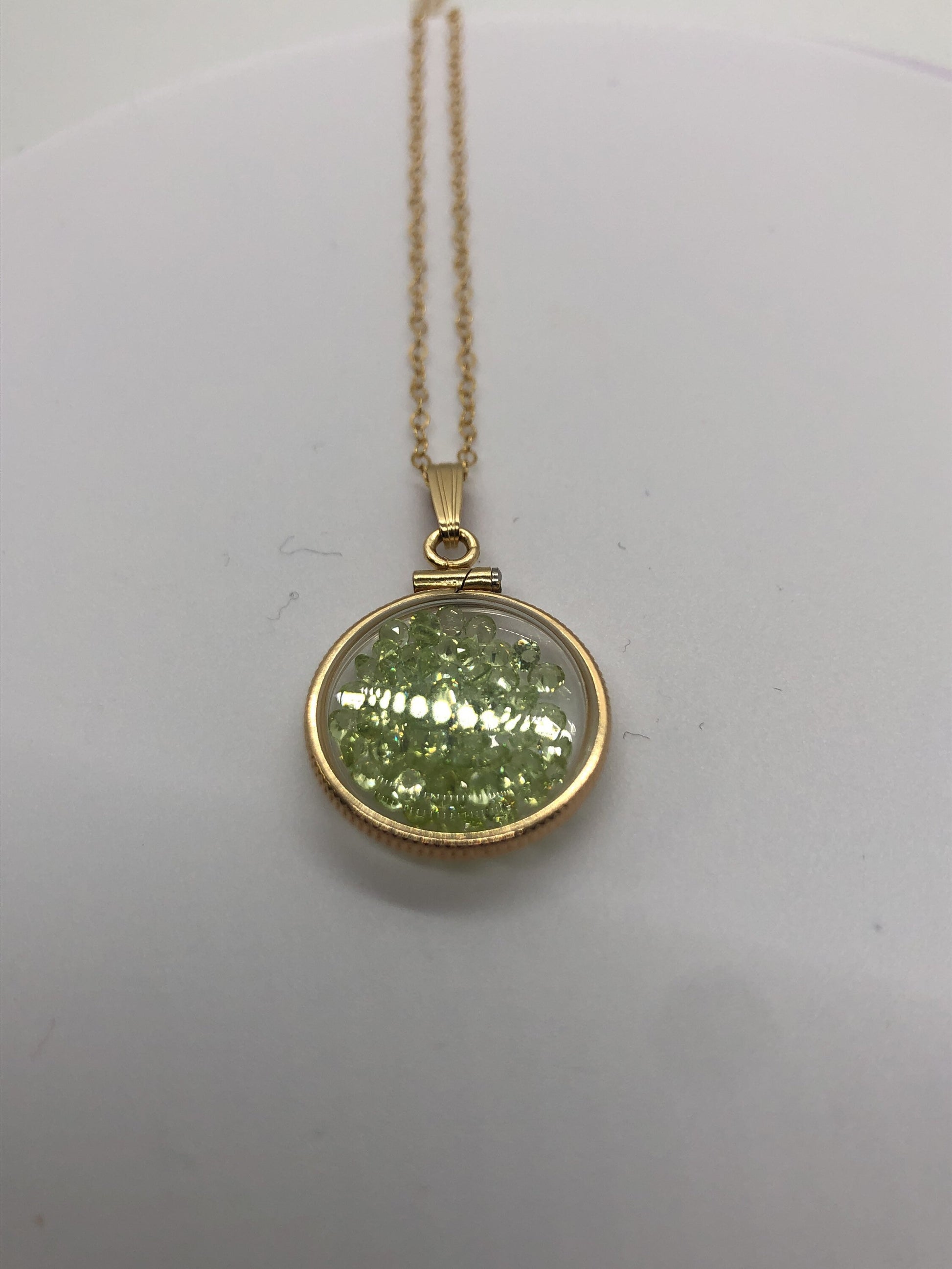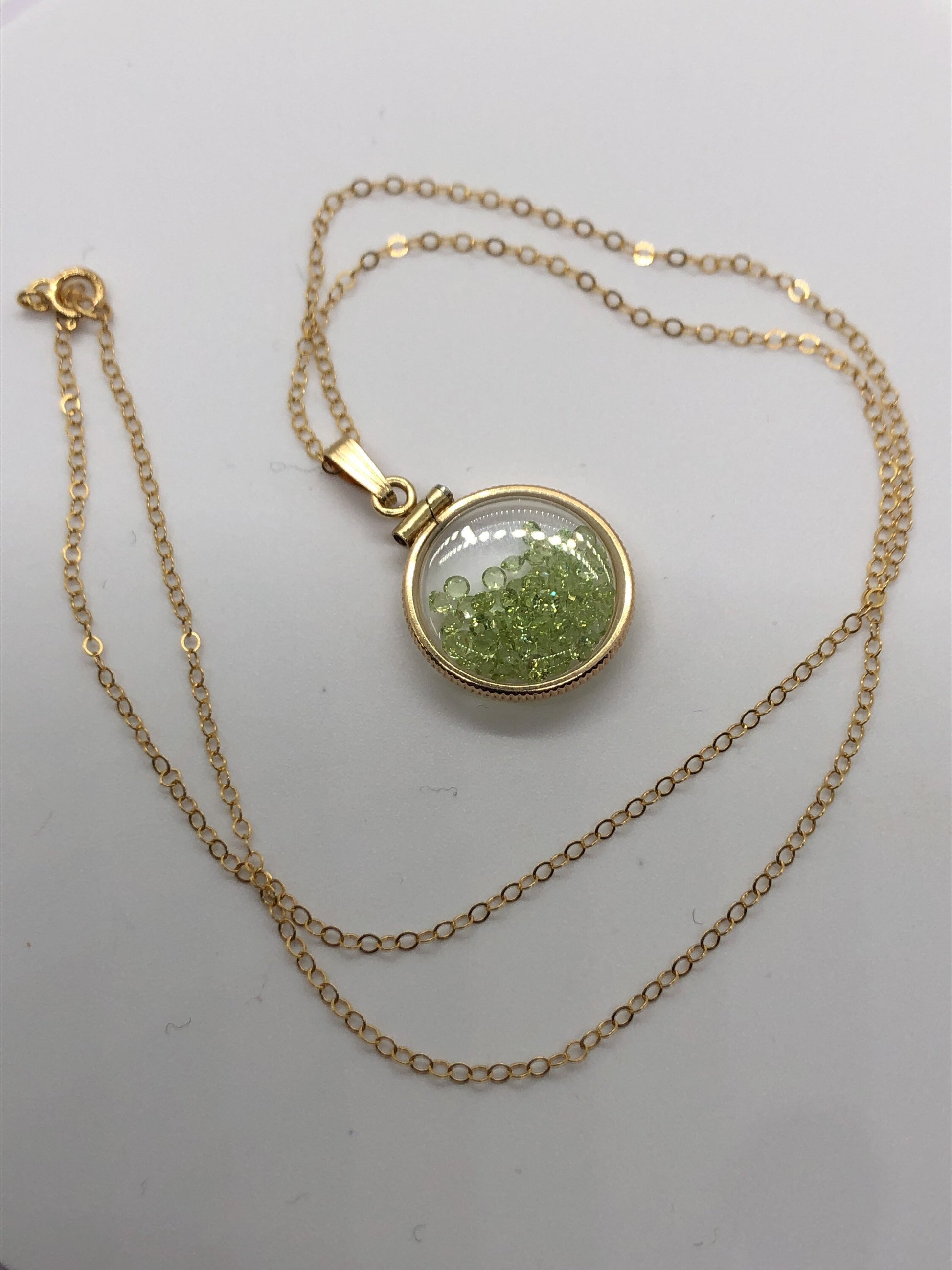 Up for sale: A 18 mm 14k gold filled locket glowing green with August's birthstone gems inside. If your birthstone is Peridot (birthstone for August) or you just like cool eye catching jewelry, then this locket is for you. Add a 14k gold filled cable chain or choose the locket and bail only option. Please see my other auctions for additional creations with these lockets.