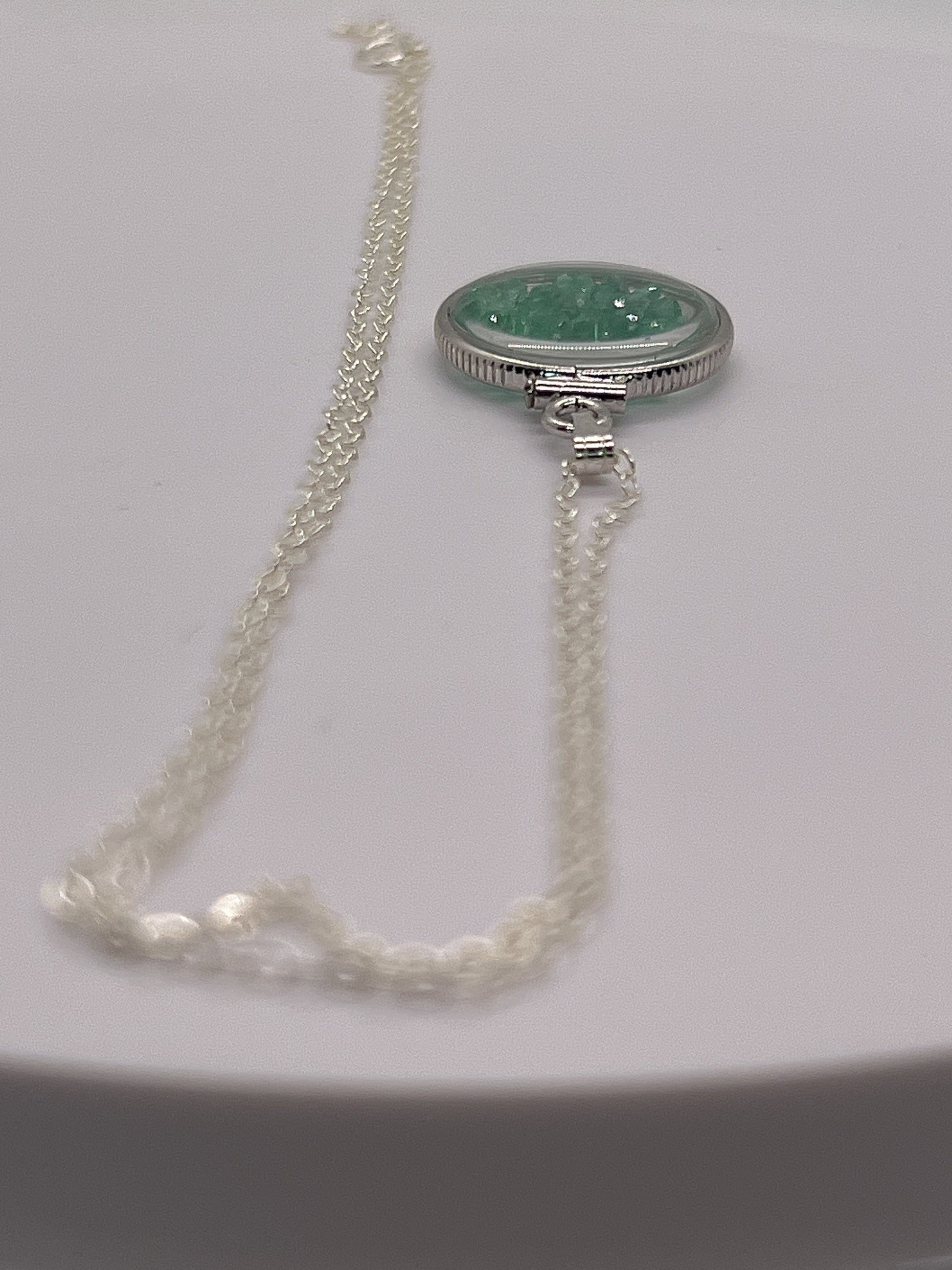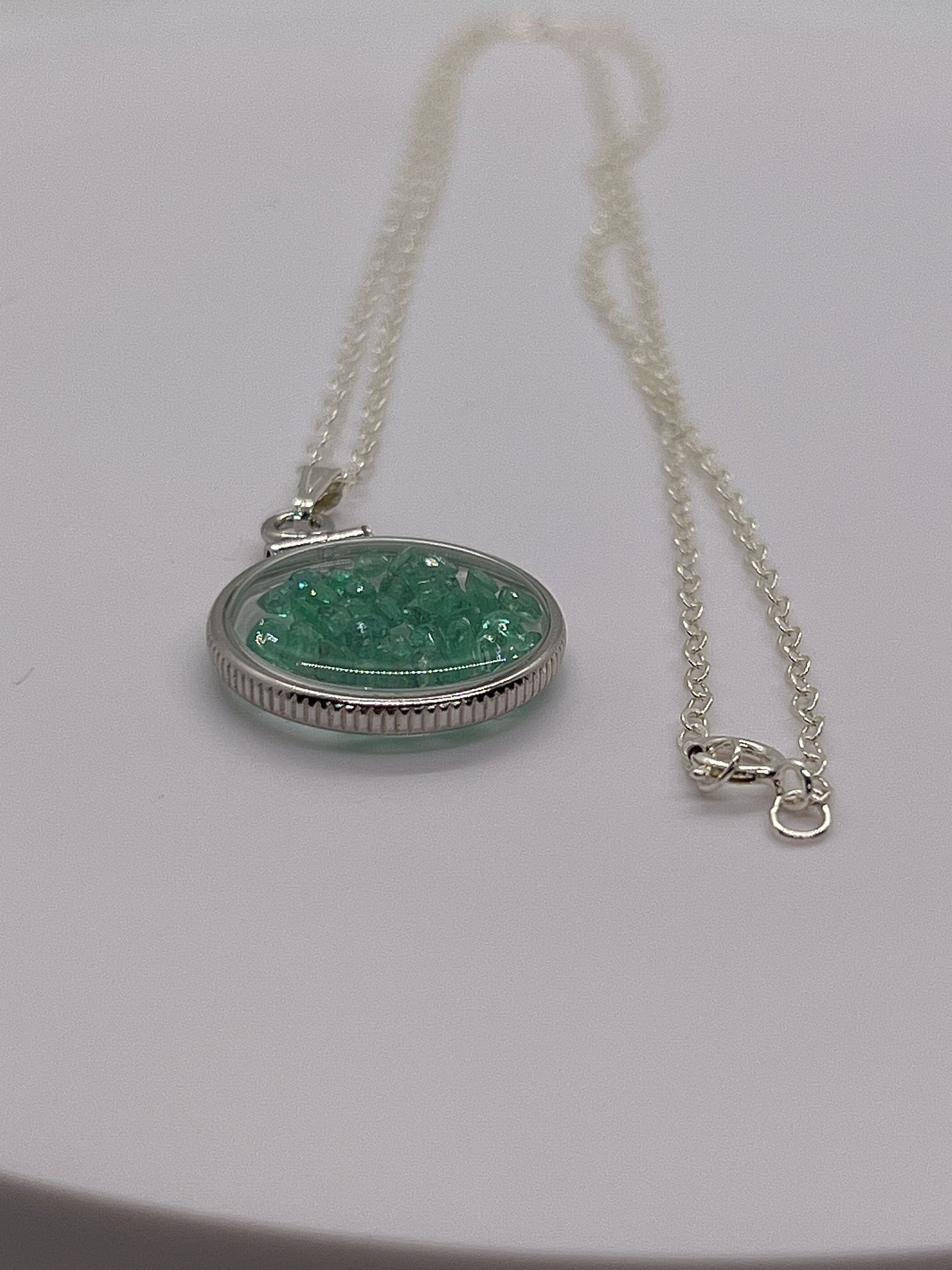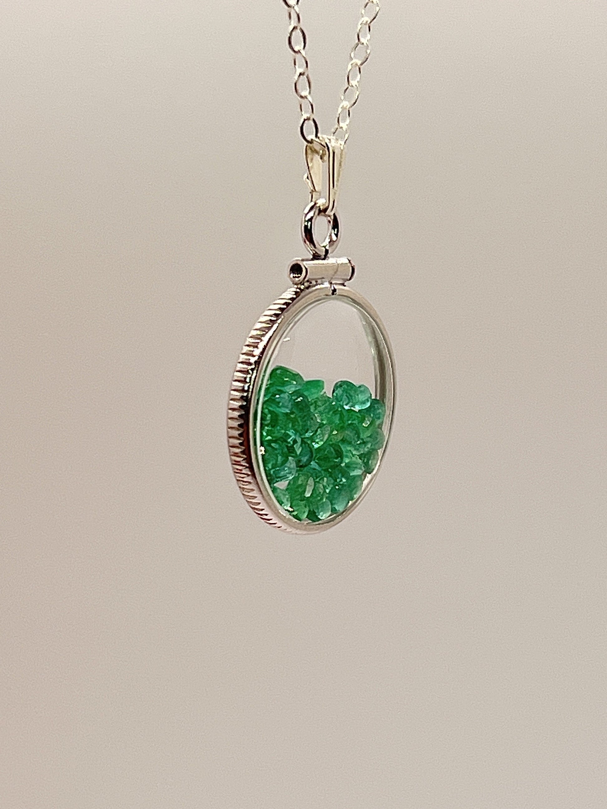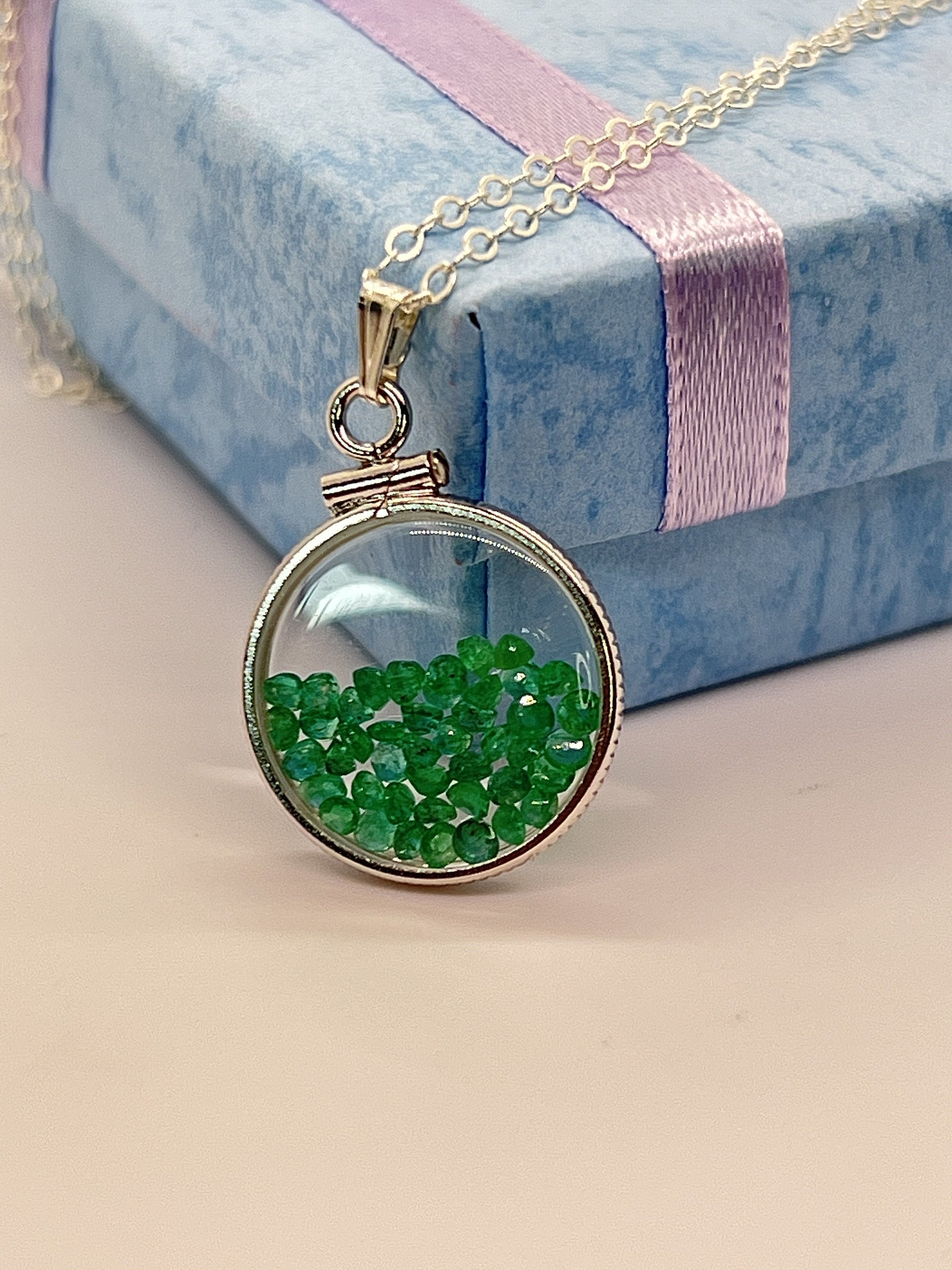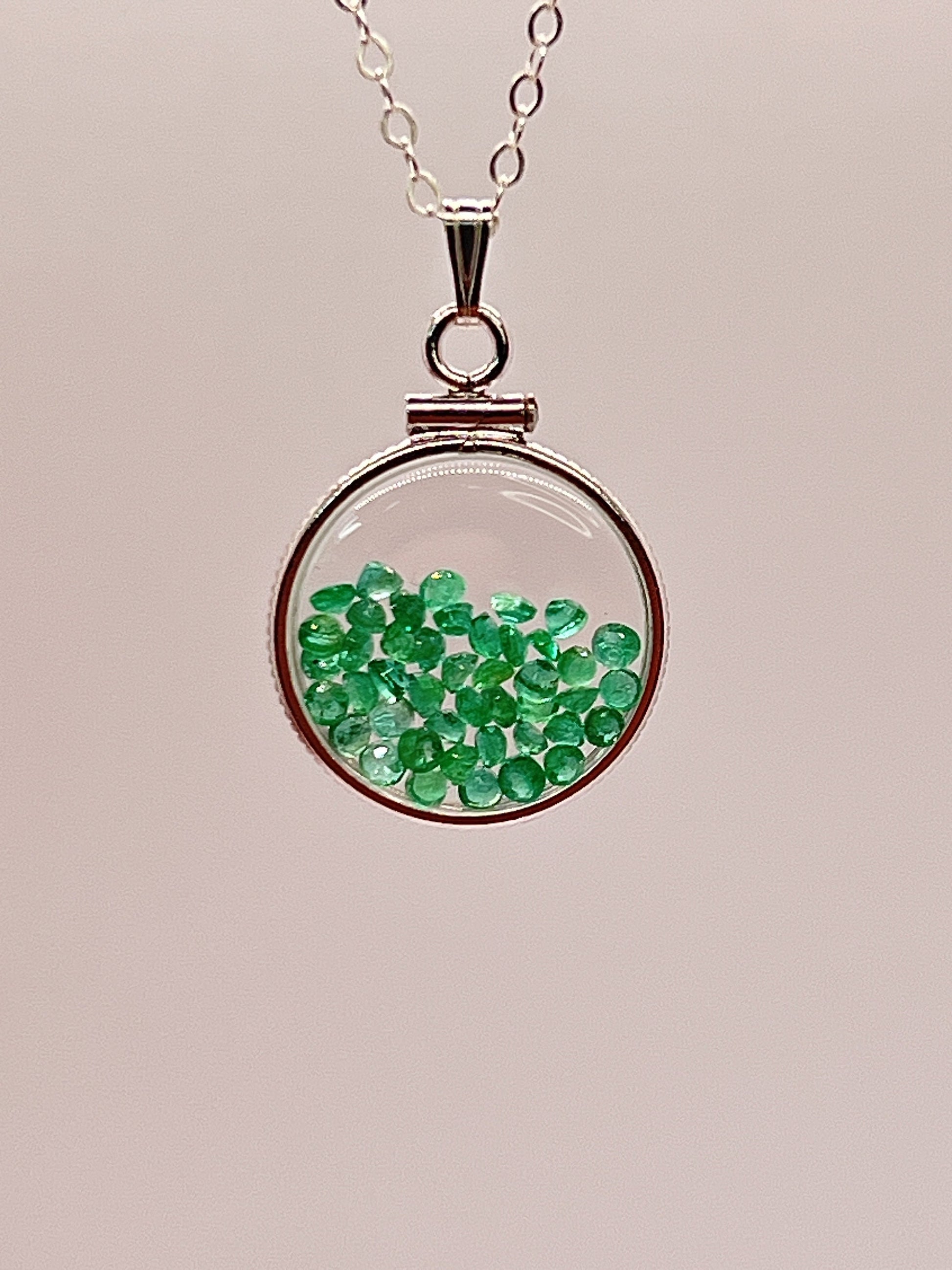 Handmade Dime Size Sterling Silver Emerald Shaker Locket Lucite View Locket, Necklace, Beautiful May Birthstone. 2.0 TCW