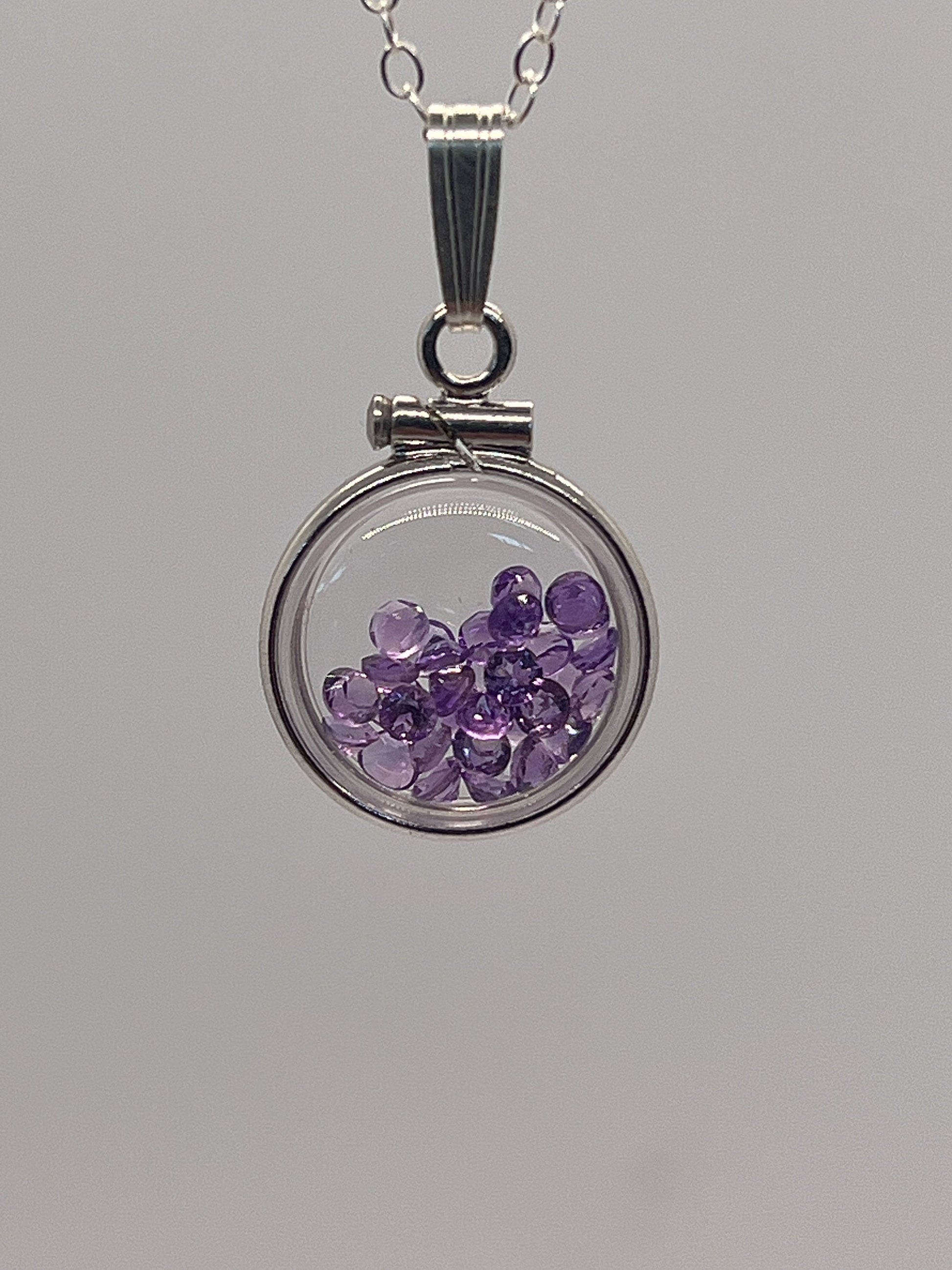 Up for sale: A 12.5mm sterling silver shaker locket glowing purple with February's birthstone gems inside. If your birthstone is Amethyst (birthstone for February) or you just like cool eye-catching jewelry, then this locket is for you. Choose to complement this locket at checkout with an 18–24-inch Sterling Silver chain. You can order with just locket only-no chain. It will come with a sterling silver snap bail shown.  Model in picture is wearing a 18-inch chain. Comes filled with 1.20 TCW of genuine round cut amethyst. Please see my other auctions for additional creations with these lockets.