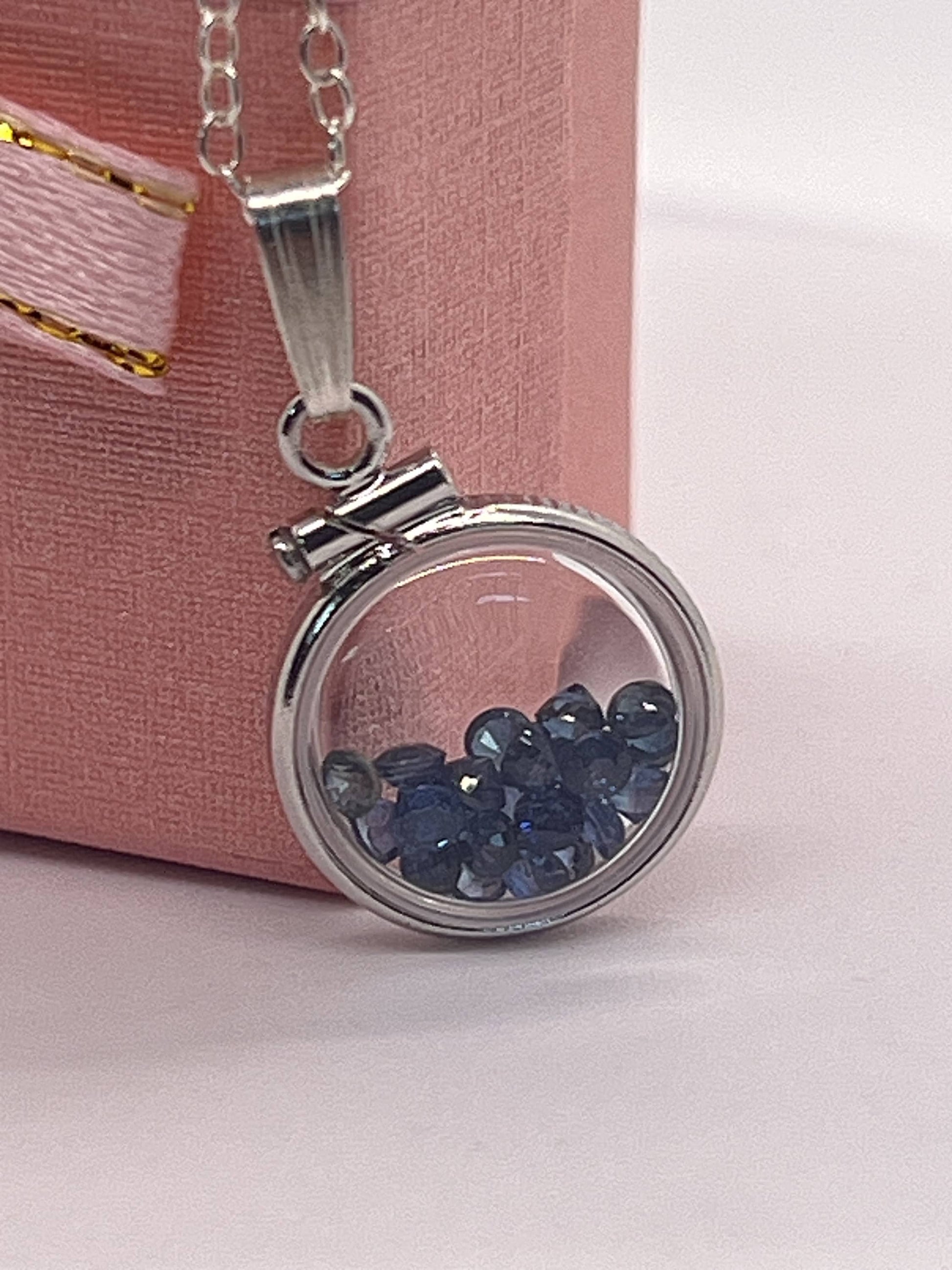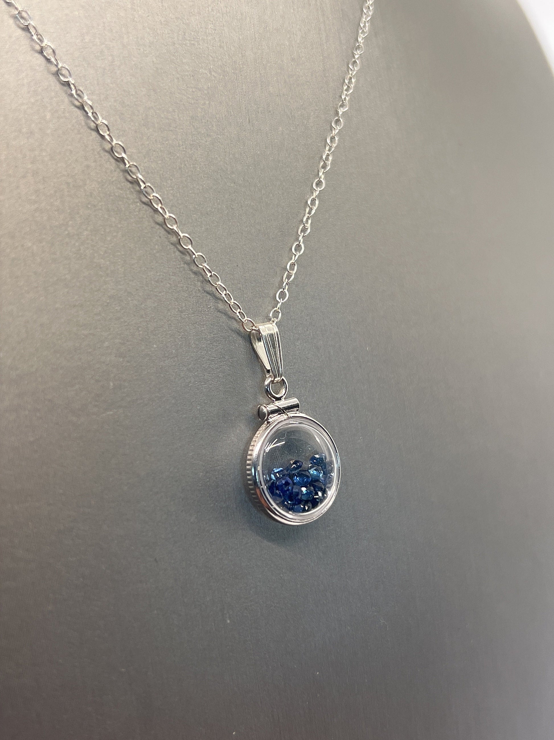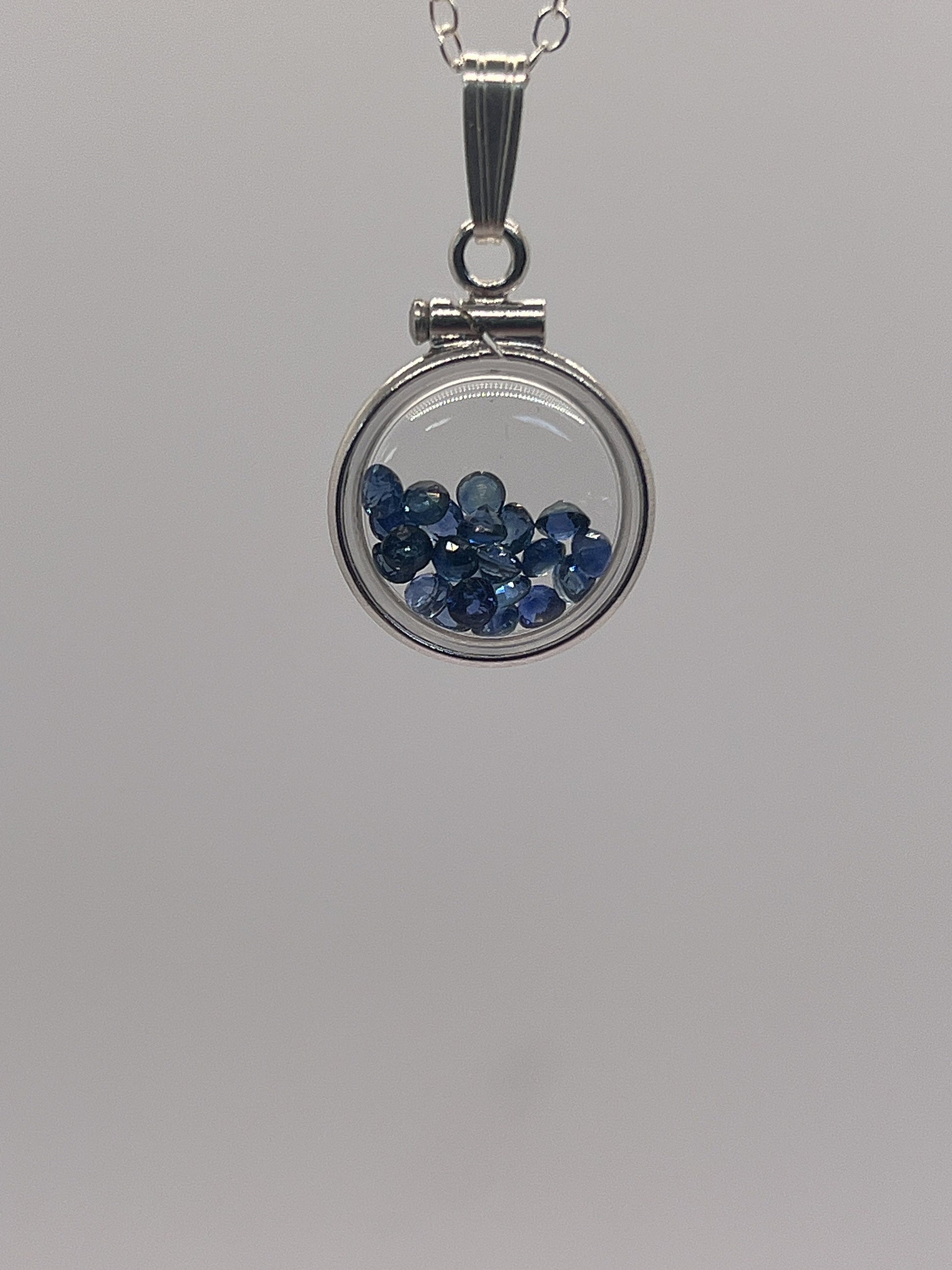 Handmade Diminutive Sterling Silver Sapphire Shaker Locket Lucite View Locket, Necklace, Beautiful September Birthstone. 1.4 TCW