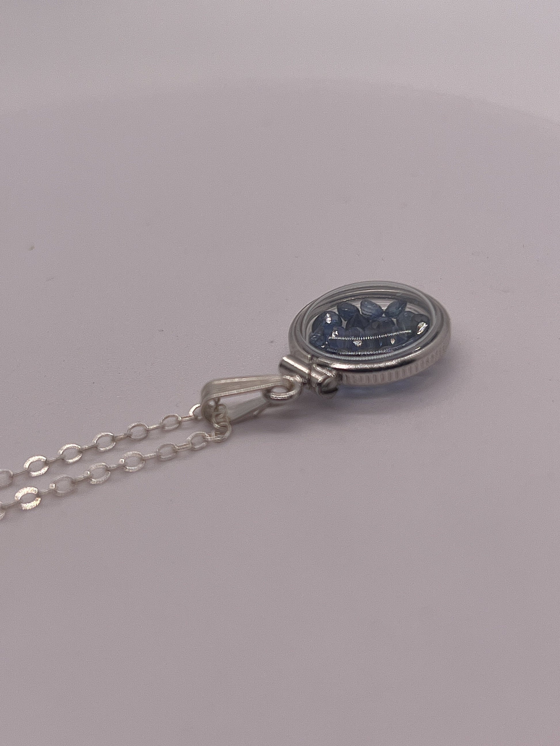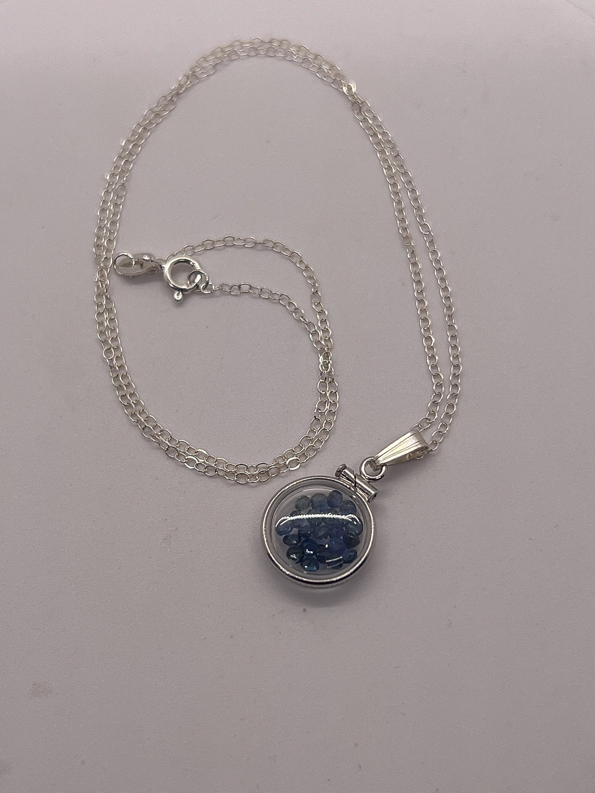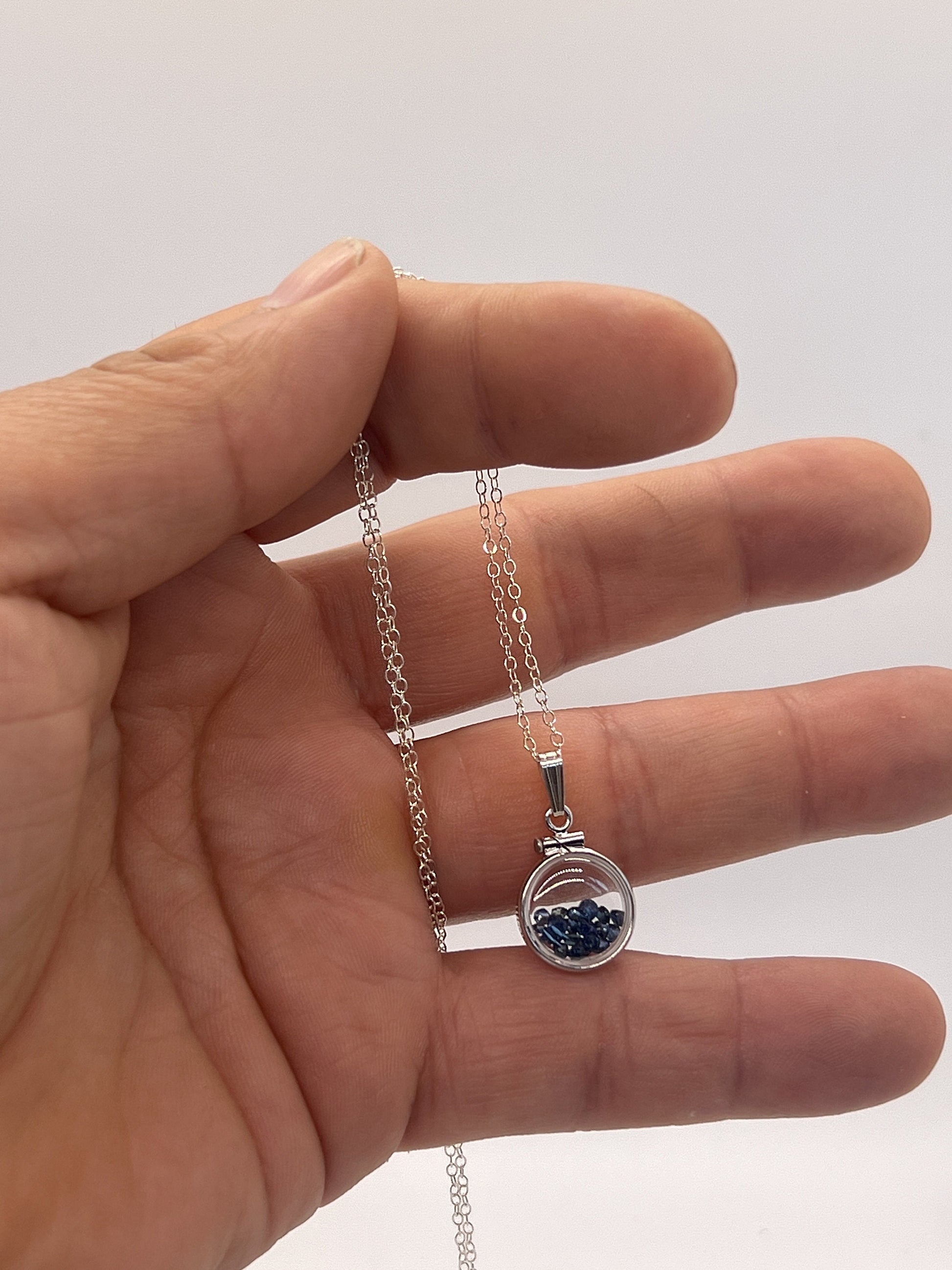 Handmade Diminutive Sterling Silver Sapphire Shaker Locket Lucite View Locket, Necklace, Beautiful September Birthstone. 1.4 TCW