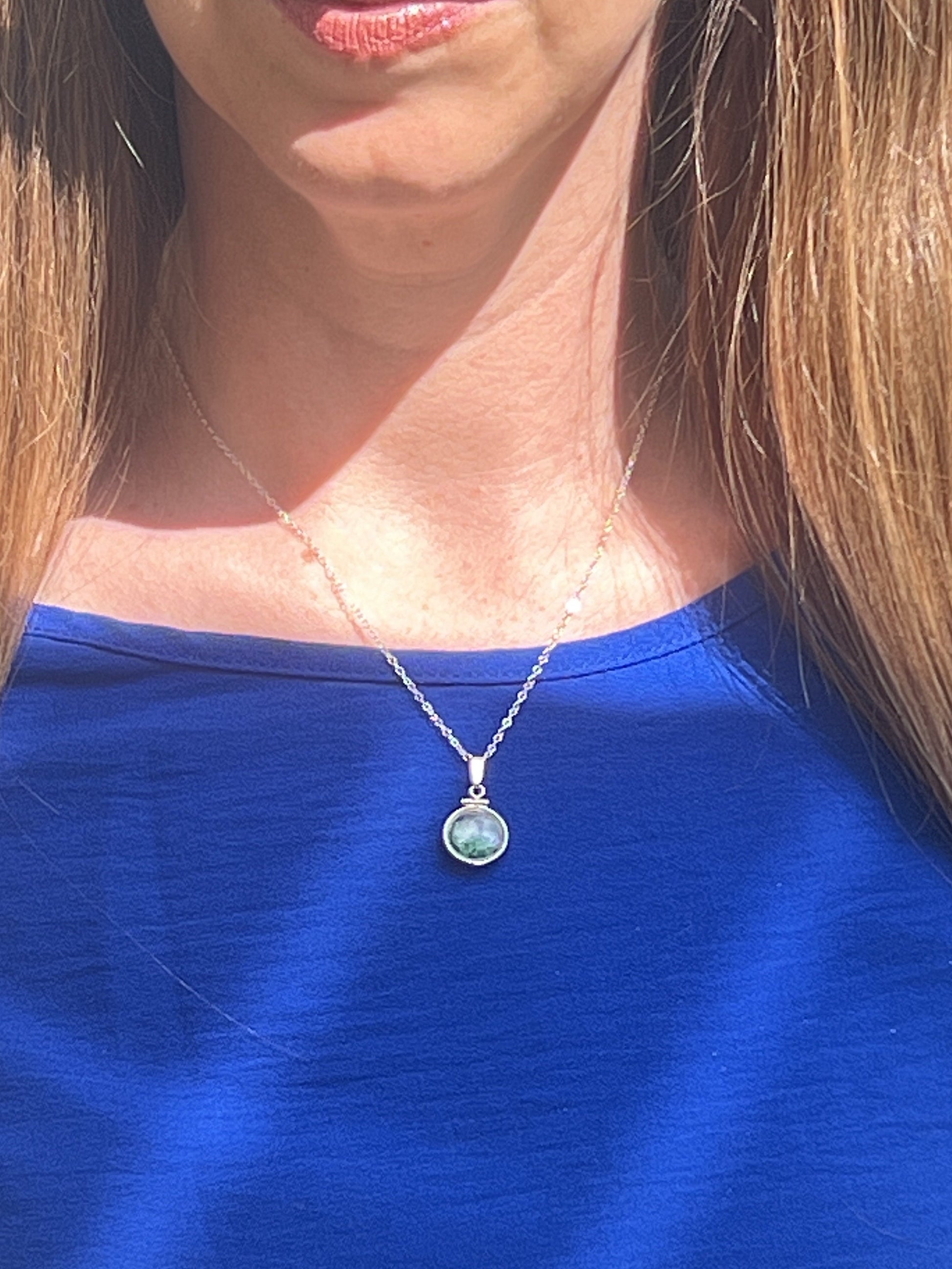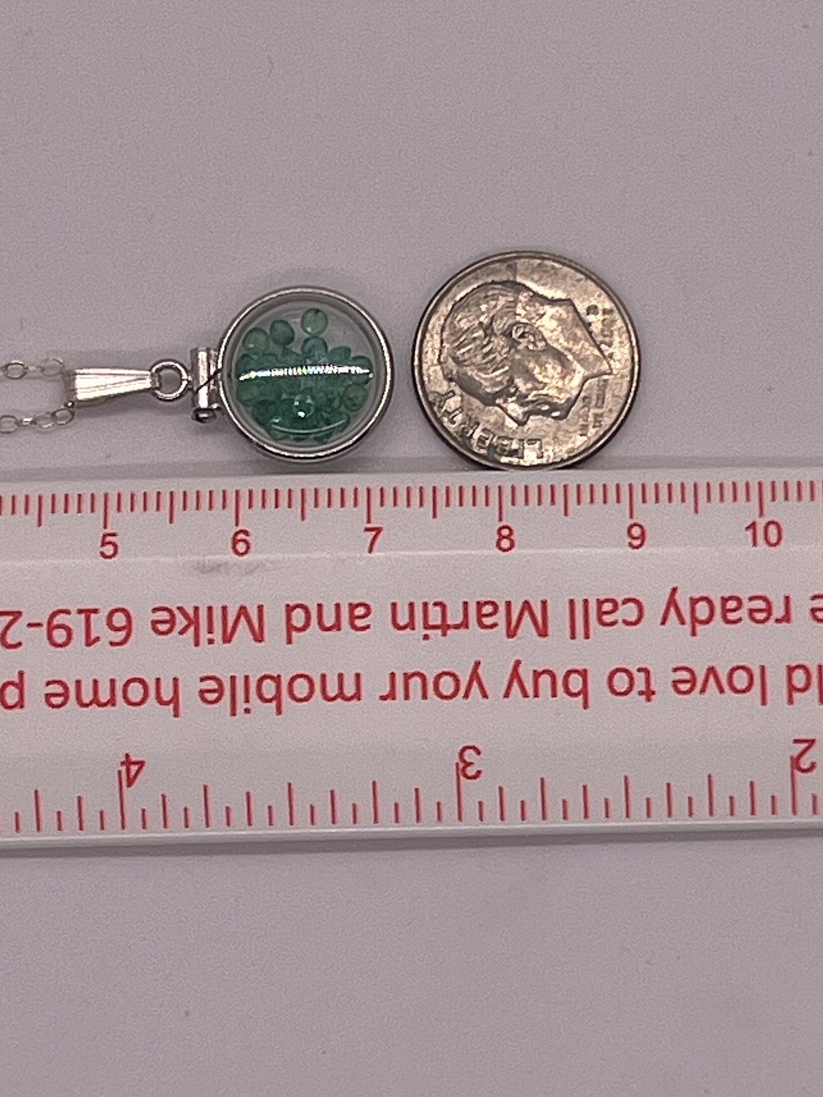 Up for sale: A 12.5mm sterling silver shaker locket glowing blue with September's birthstone gems inside. If your birthstone is Sapphire (birthstone for September) or you just like cool eye catching jewelry, then this locket is for you. Choose to complement this locket at checkout with an 18–24-inch Sterling Silver chain. You can order with just locket only-no chain. It will come with a sterling silver snap bail shown. Model in picture is wearing a 18-inch chain. Comes filled with 1.65 TCW of genuine round cut peridot. Please see my other auctions for additional creations with these lockets.