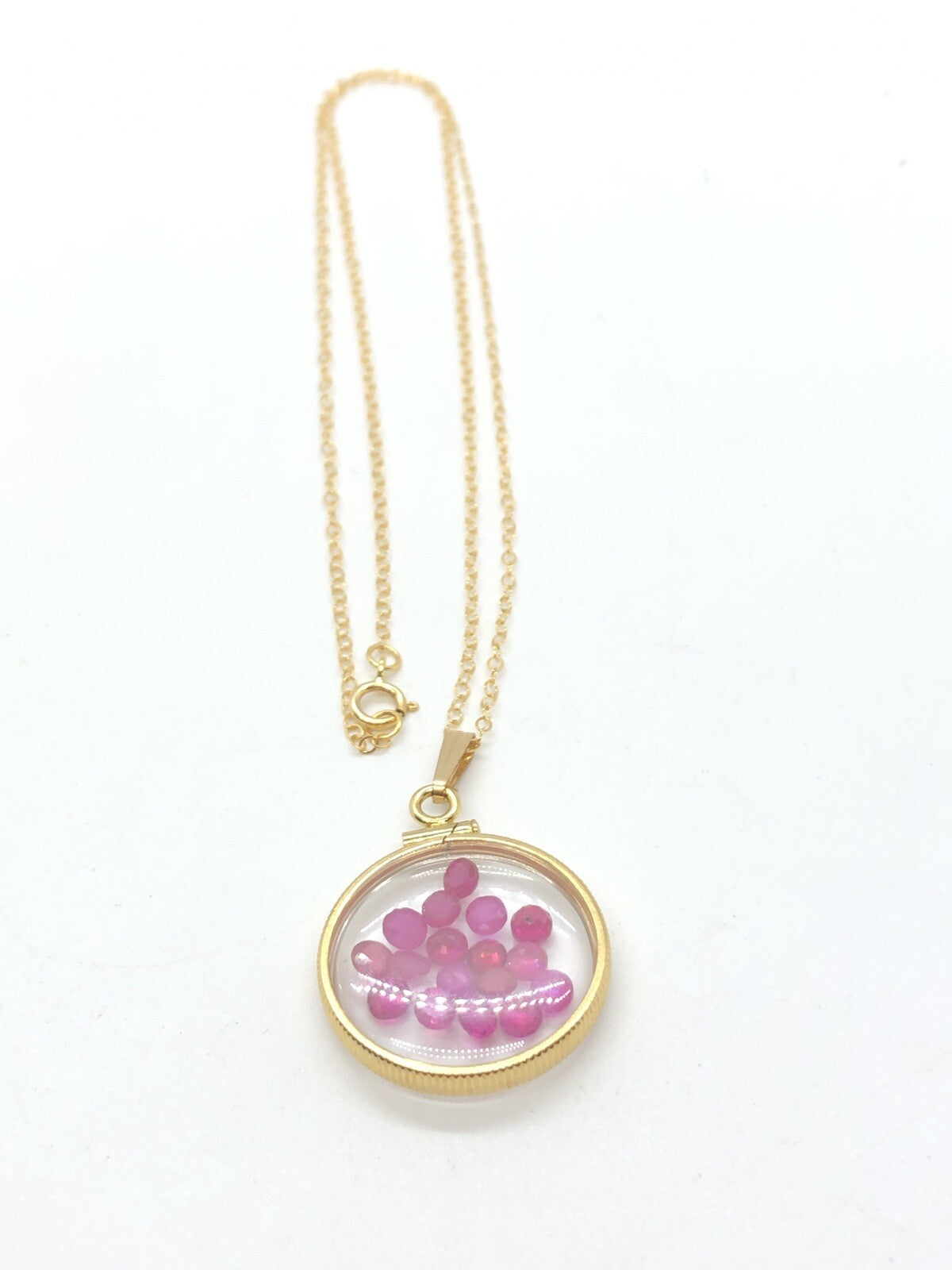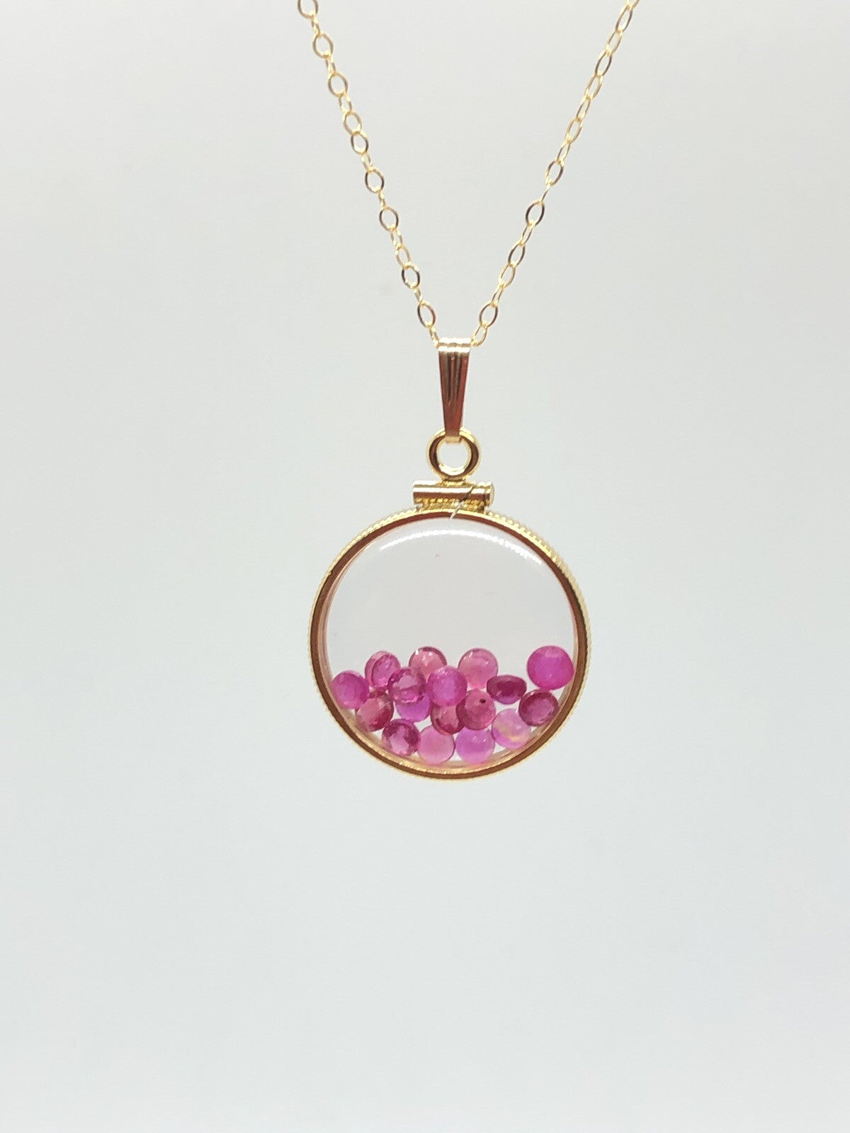Up for sale: A 20 mm 14k gold filled shaker locket ( or sterling silver) glowing red with July's birthstone gems inside. If your birthstone is Ruby (birthstone for July) or you just like cool eye catching jewelry, then this locket is for you. I've added a new 18 inch 14k gold filled cable chain and a few new gemstones to create an eye catching creation. Please see my other auctions for additional creations with these lockets.