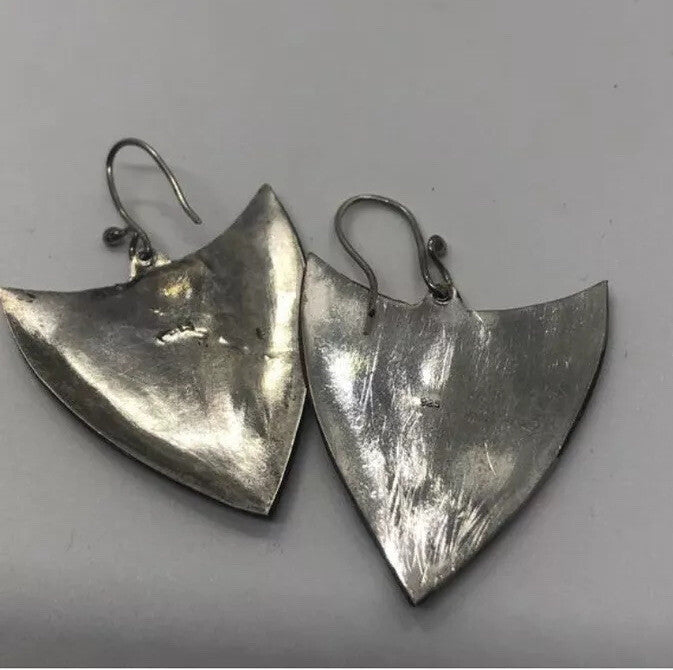 Handmade Sterling Silver Dangle Earrings Indonesia, Vintage new old stock. These were bought by me in the late 90's at an estate sale. They have been in my attic since then. They were new unworn items. These are made of sterling silver with a gold wash. They are French hook earrings and are finely crafted in Indonesia. Very large substantial earrings with a wonderful design. They look like shields. There are only 8 pairs total and when they are gone, they are gone:)