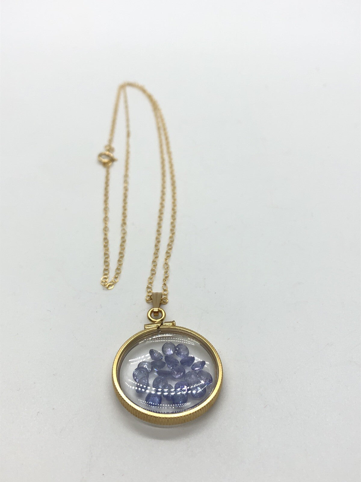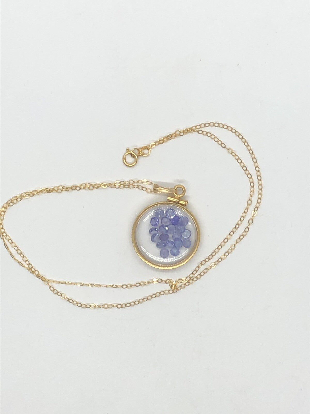 Up for sale: A 20 mm 14k gold filled ( or sterling silver) Shaker locket glowing purple with December's birthstone gems inside. If your birthstone is Tanzanite (birthstone for December) or you just like cool eye catching jewelry, then this locket is for you. I've added a new 18 inch 14k gold filled cable chain and a few new gemstones to create an eye catching creation. Please see my other auctions for additional creations with these lockets.