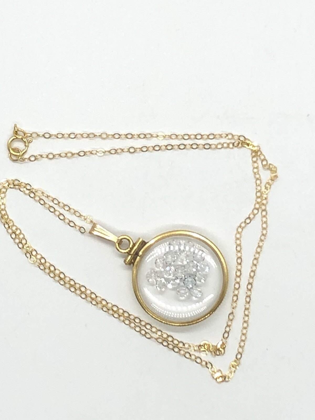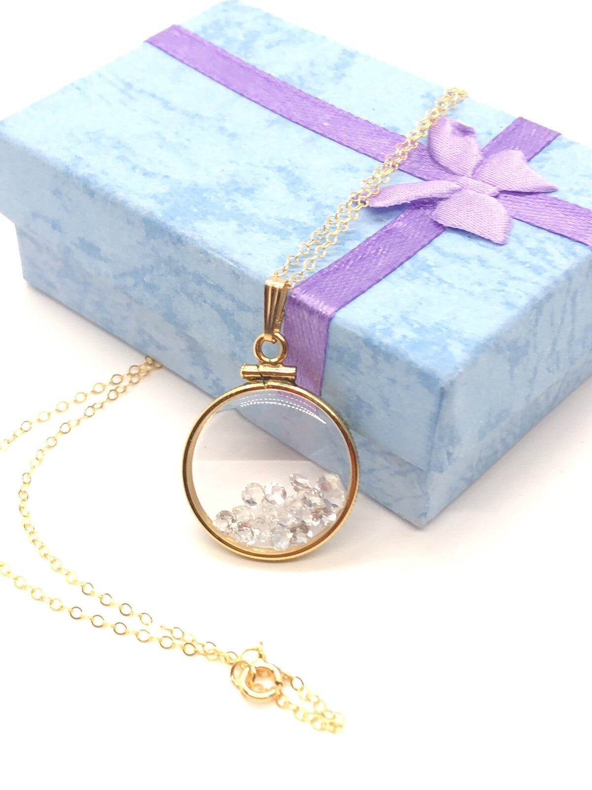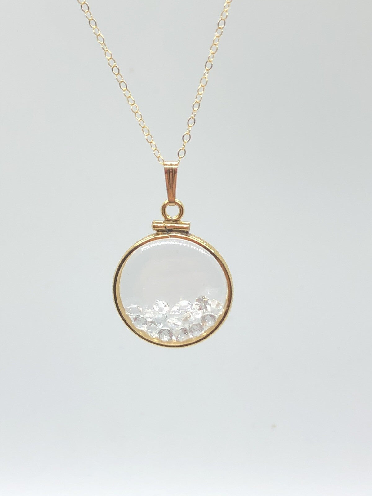 Up for sale: A 20 mm Handmade 14k gold filled shaker locket sparkling with a good choice for an April birthstone gem inside. If your birthstone is Diamond/ White Topaz (birthstone for April) or you just like cool eye catching jewelry, then this locket is for you.