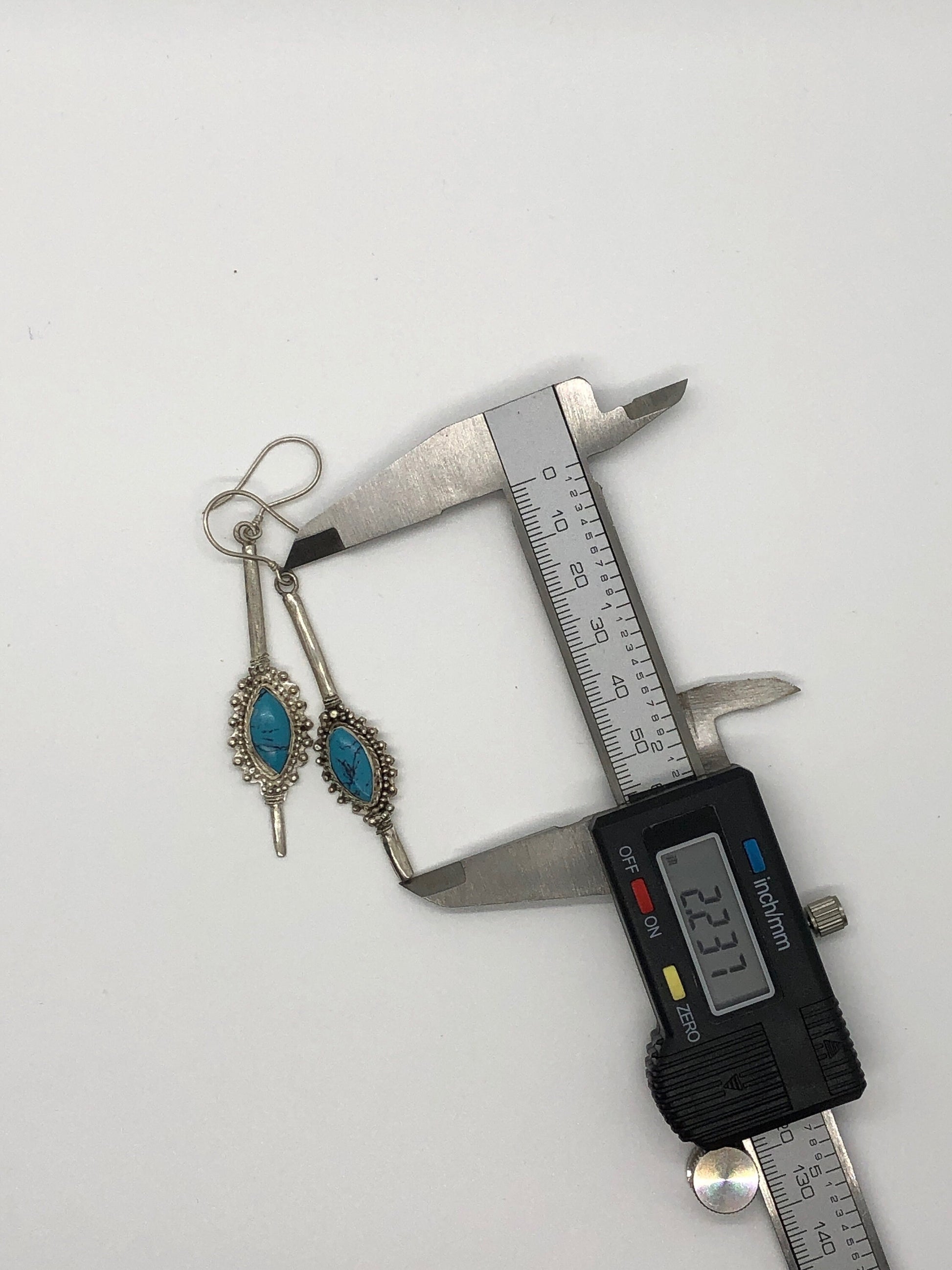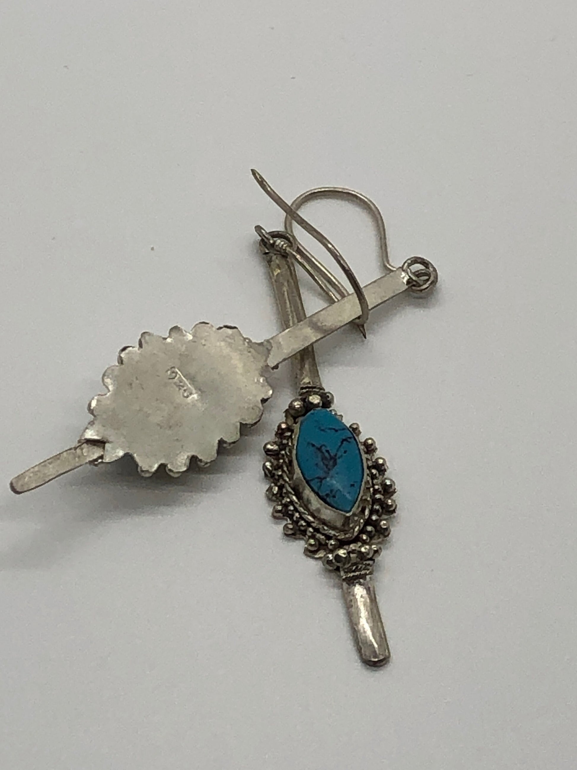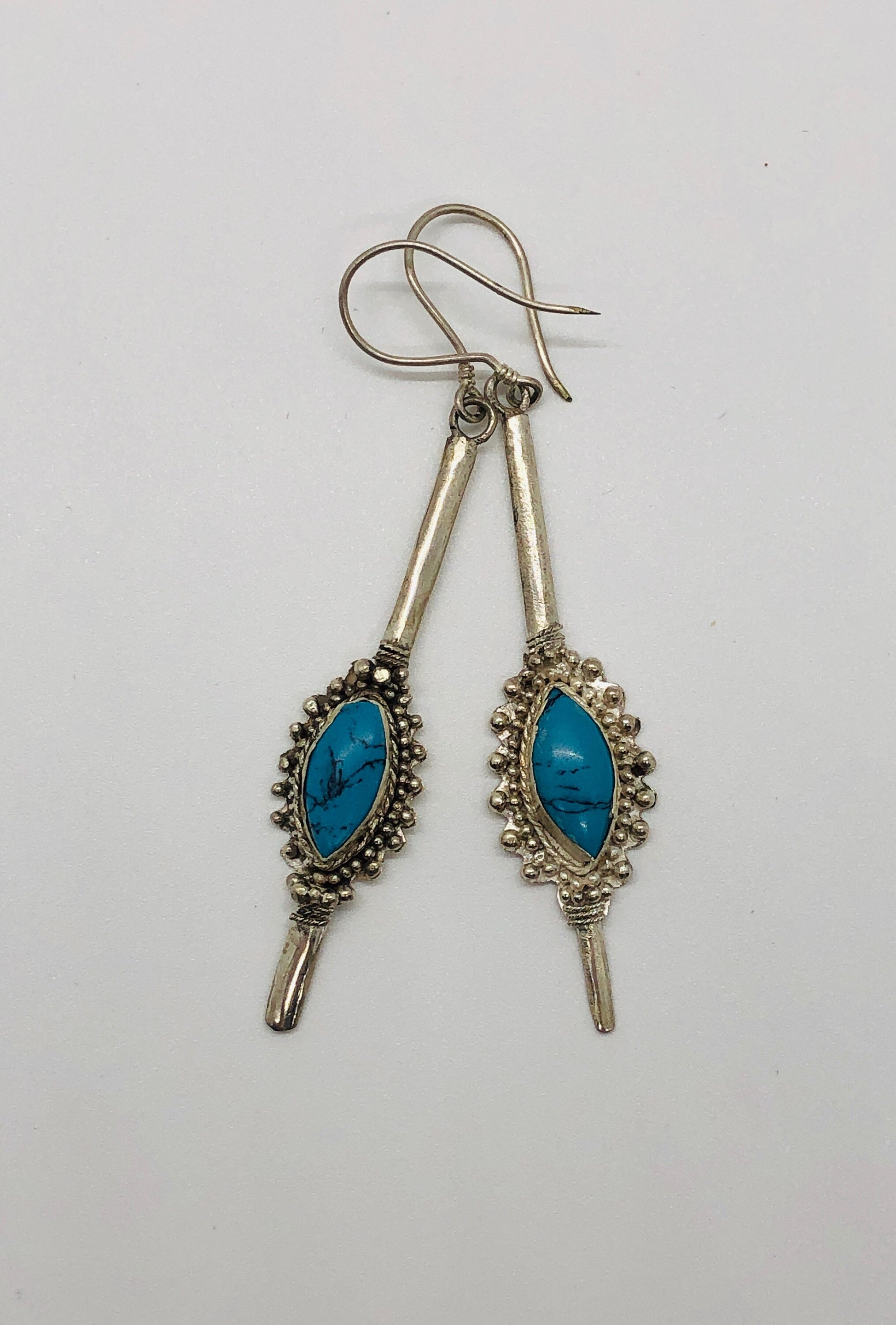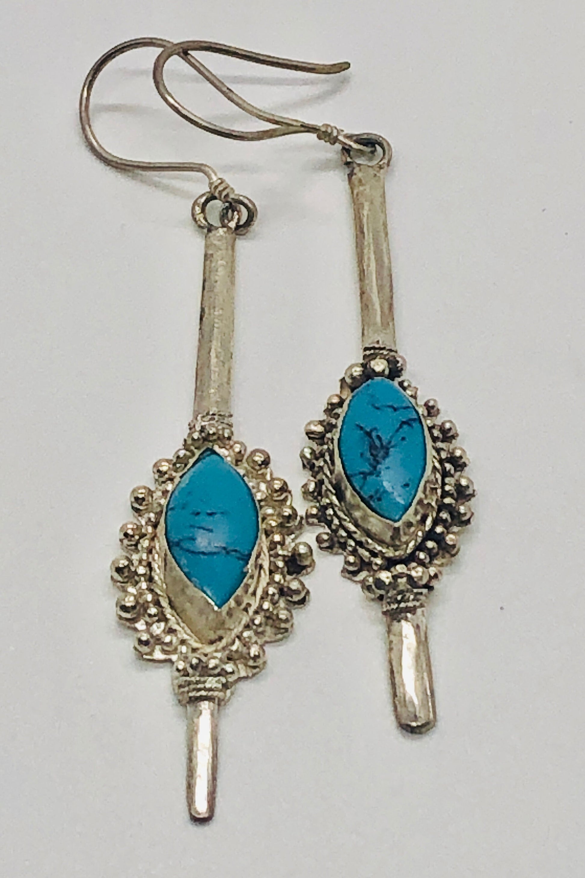 Handmade Sterling Silver and Turquoise Dangle Earrings Indonesia, Vintage new old stock. These were bought by me in the late 90's at an estate sale. They were new unworn items. These are hallmarked .925 and are made of sterling silver and what I believe to be Turquoise. They are French hook earrings and are finely crafted in Indonesia. They are very large substantial earrings. Unfortunately, I only have 4 pair of these.