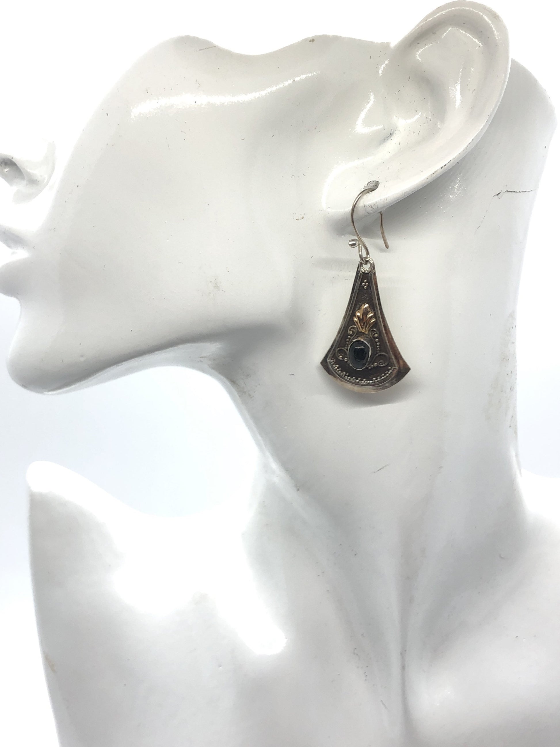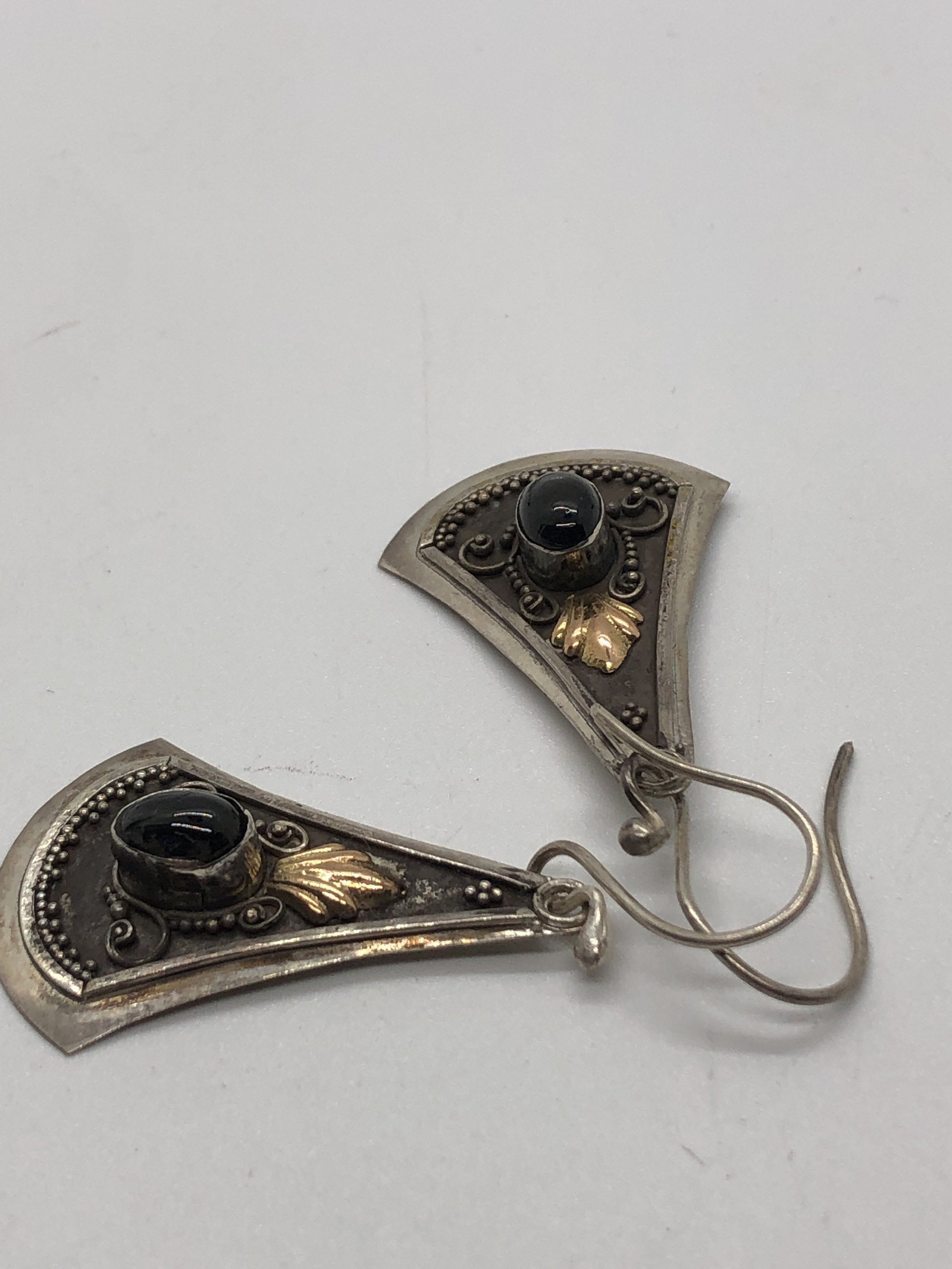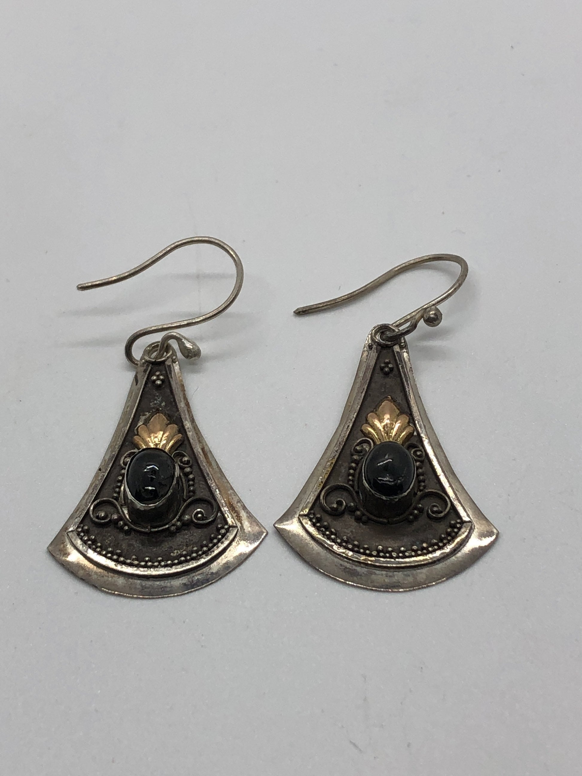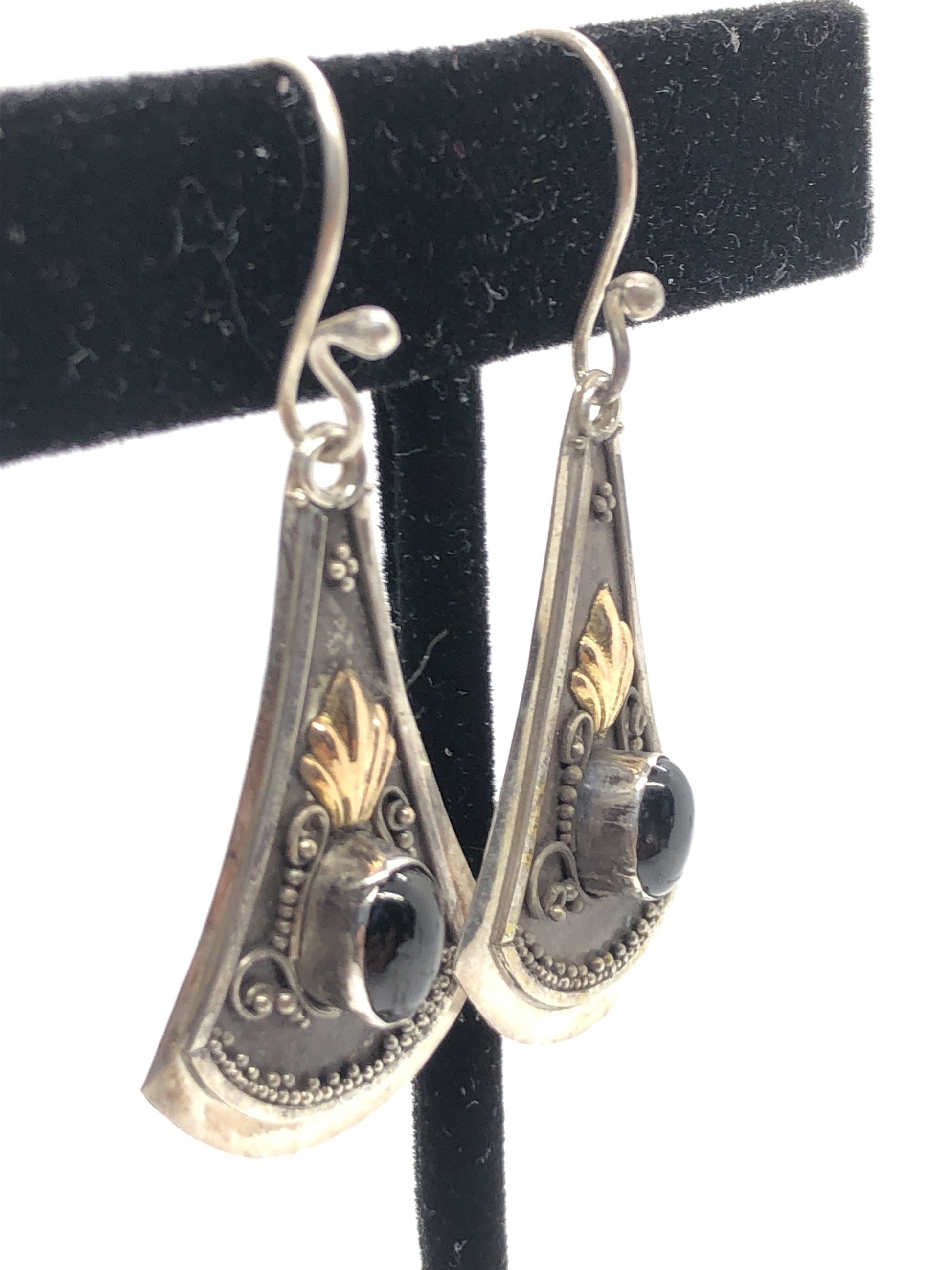 Large Handmade Sterling, Onyx and gold wash french hook Earrings Indonesia, Vintage new old stock, Beautiful