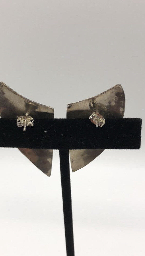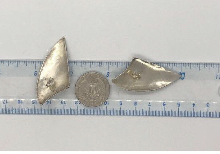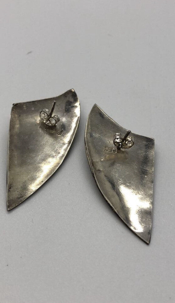 Handmade Sterling and turquoise Earrings, Indonesia, Vintage new old stock. These were bought by me in the late 90's at an estate sale. They were new unworn items. These are hallmarked are 925 and are made of sterling silver. They are post back earrings and are finely crafted in Indonesia. I have only 7 pairs of these and when they are gone, that's it. There is a wonderful turquoise cabochon Large Mother of pearl & onyx Vintage Handmade Sterling Silver Earrings Indonesia, set in sterling as shown in pick. As these are vintage there is a nice patina. I will leave that up to the buyer to decide to keep it or not. I think these look like a shield. Please see my other listings for similar earrings.