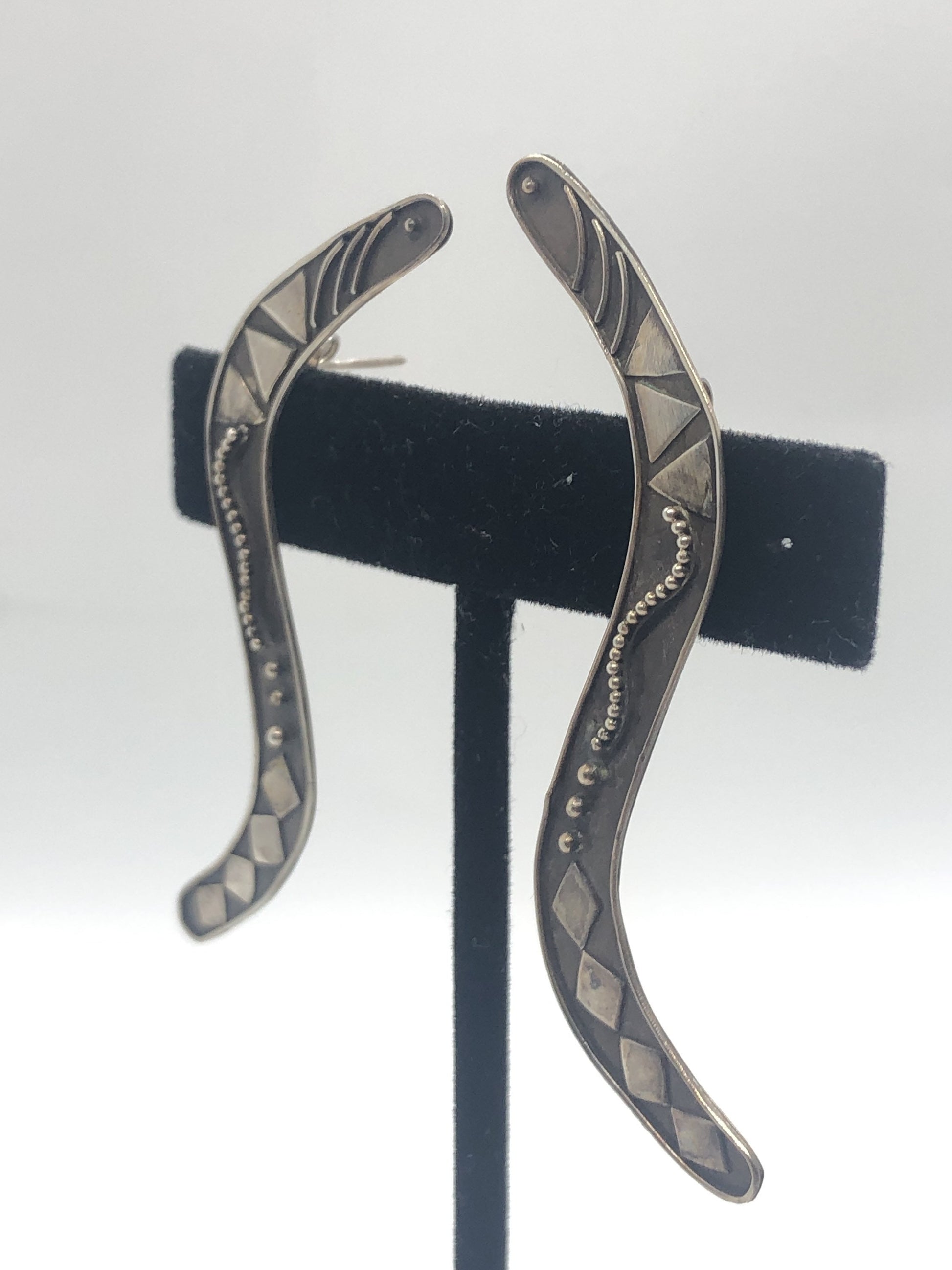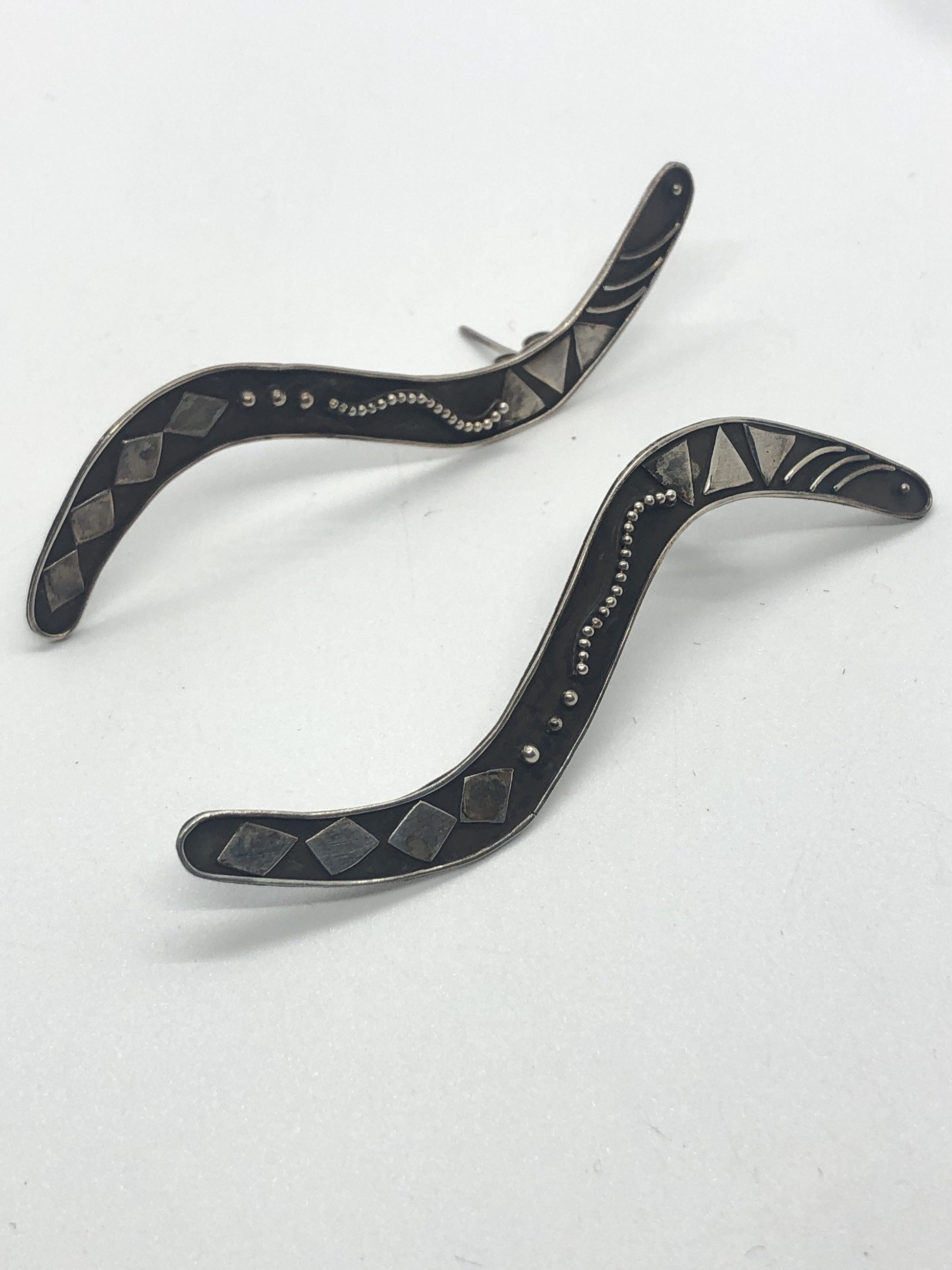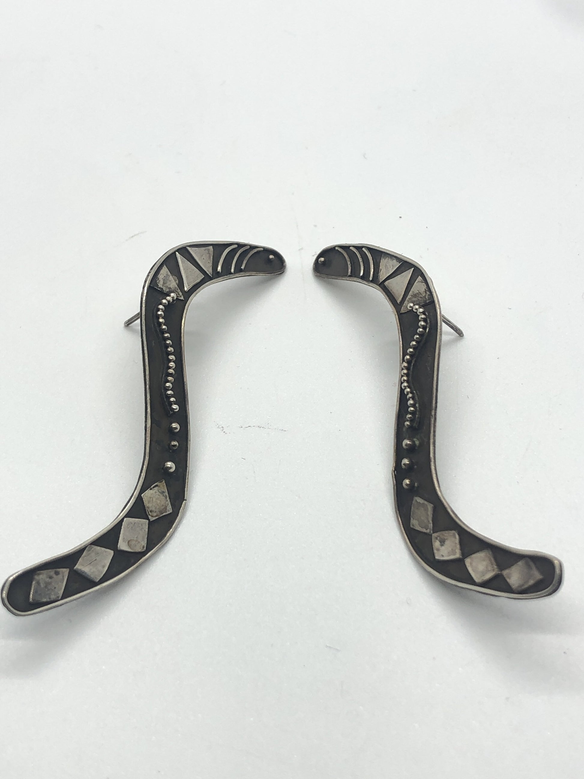 Sterling Silver boomerang shaped earrings Stud earrings Handmade Sterling Silver stud Earrings Indonesia, Vintage new old stock. These were bought by me in the late 90's at an estate sale. They were new unworn items. They are stud earrings for pierced ears and are finely crafted in Indonesia, hallmarked .925..Very large substantial earrings with a wonderful design. When gone I will have no more of this design. I am selling a bunch of these from my storage, different designs and sizes.3 inches long