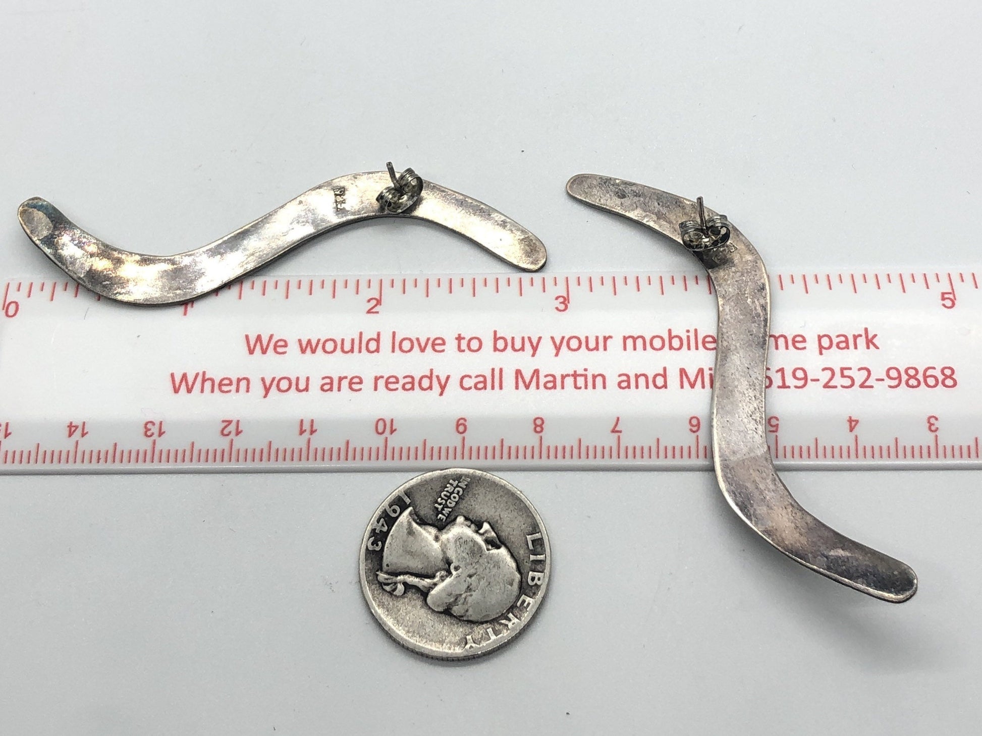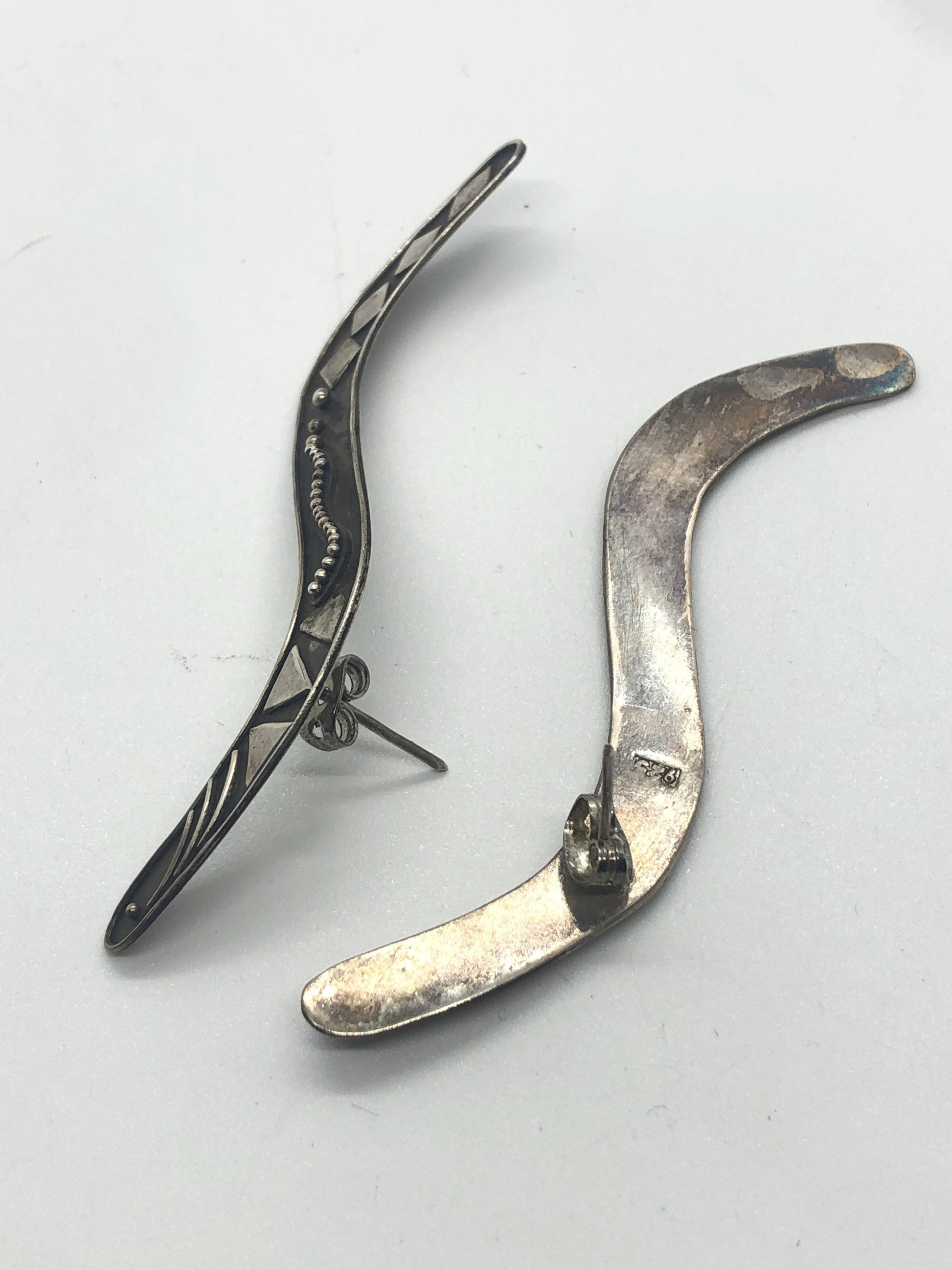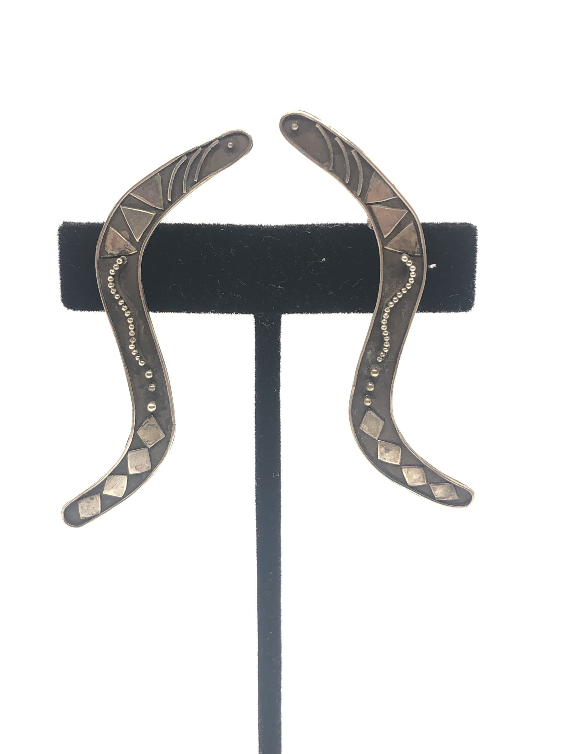 Sterling Silver boomerang shaped earrings Stud earrings Handmade Sterling Silver stud Earrings Indonesia, Vintage new old stock. These were bought by me in the late 90's at an estate sale. They were new unworn items. They are stud earrings for pierced ears and are finely crafted in Indonesia, hallmarked .925..Very large substantial earrings with a wonderful design. When gone I will have no more of this design. I am selling a bunch of these from my storage, different designs and sizes.3 inches long