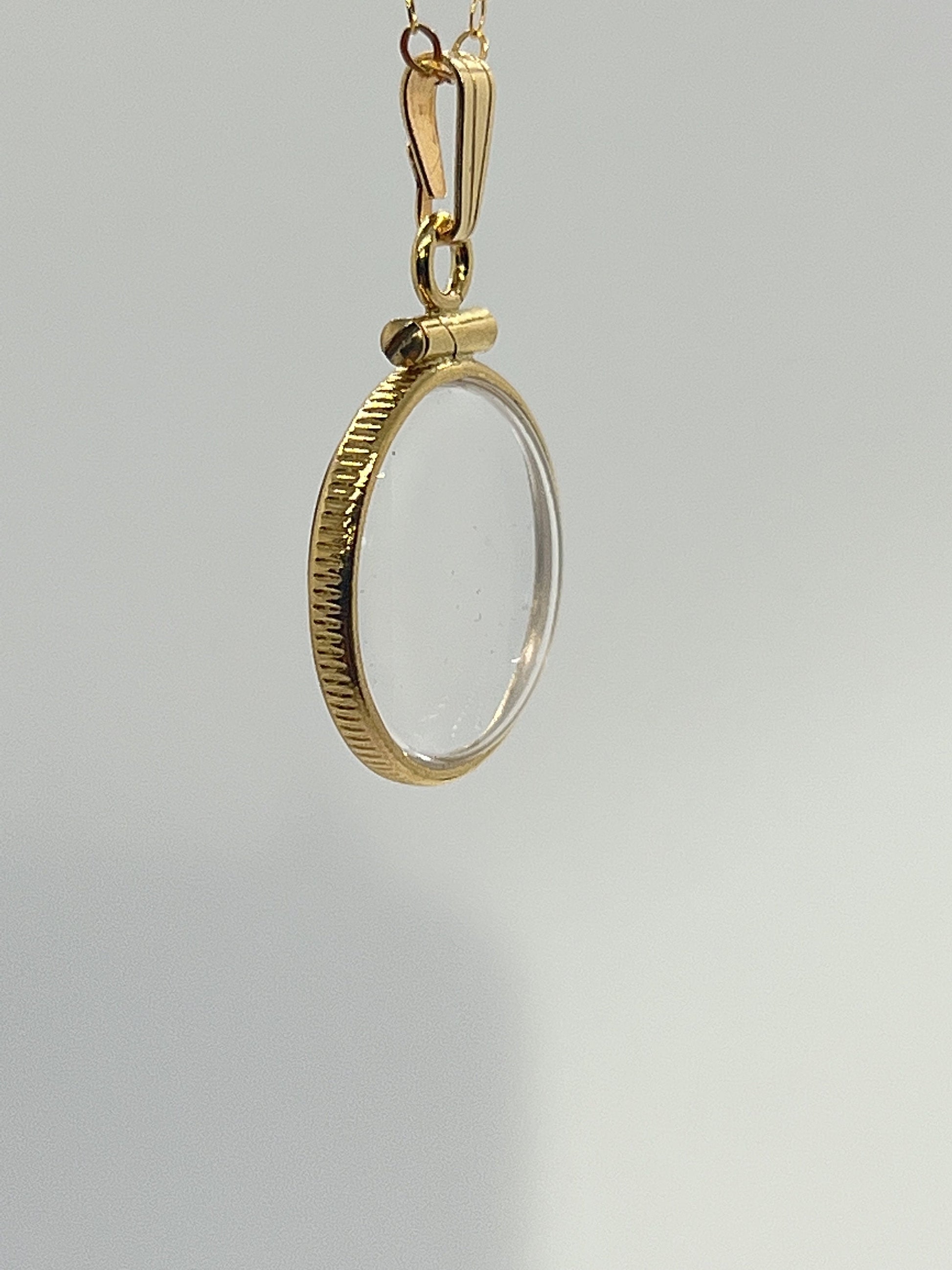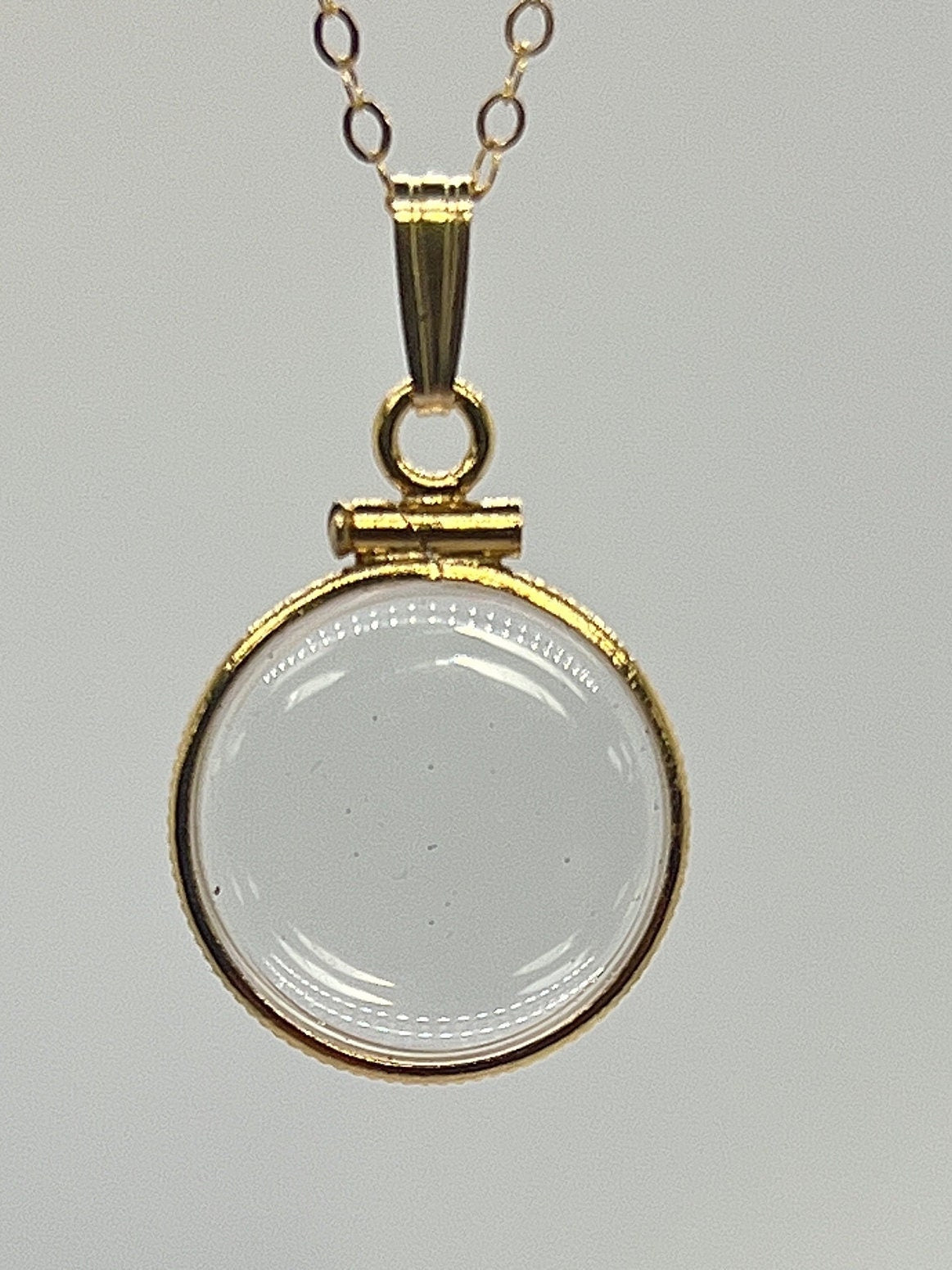 Up for sale: NEW 16.5 mm Handmade 14k solid gold shaker locket. These lockets can be opened with a small screwdriver. They are new and comprised of a solid gold bezel and two Lucite covers and a solid 14k gold filled snap bail. Locket hallmarked 14k. You can choose your size of 14k gold filled cable chain at checkout. This shaker locket can be viewed from both sides and will store and display your little treasures. You can put gems, gold, hair, anything you can imagine. Example shown contains roughly 1.55 CTW of peridot 2mm round cut gems (not included). See all of my listing for examples and ideas. What will you put in yours?
