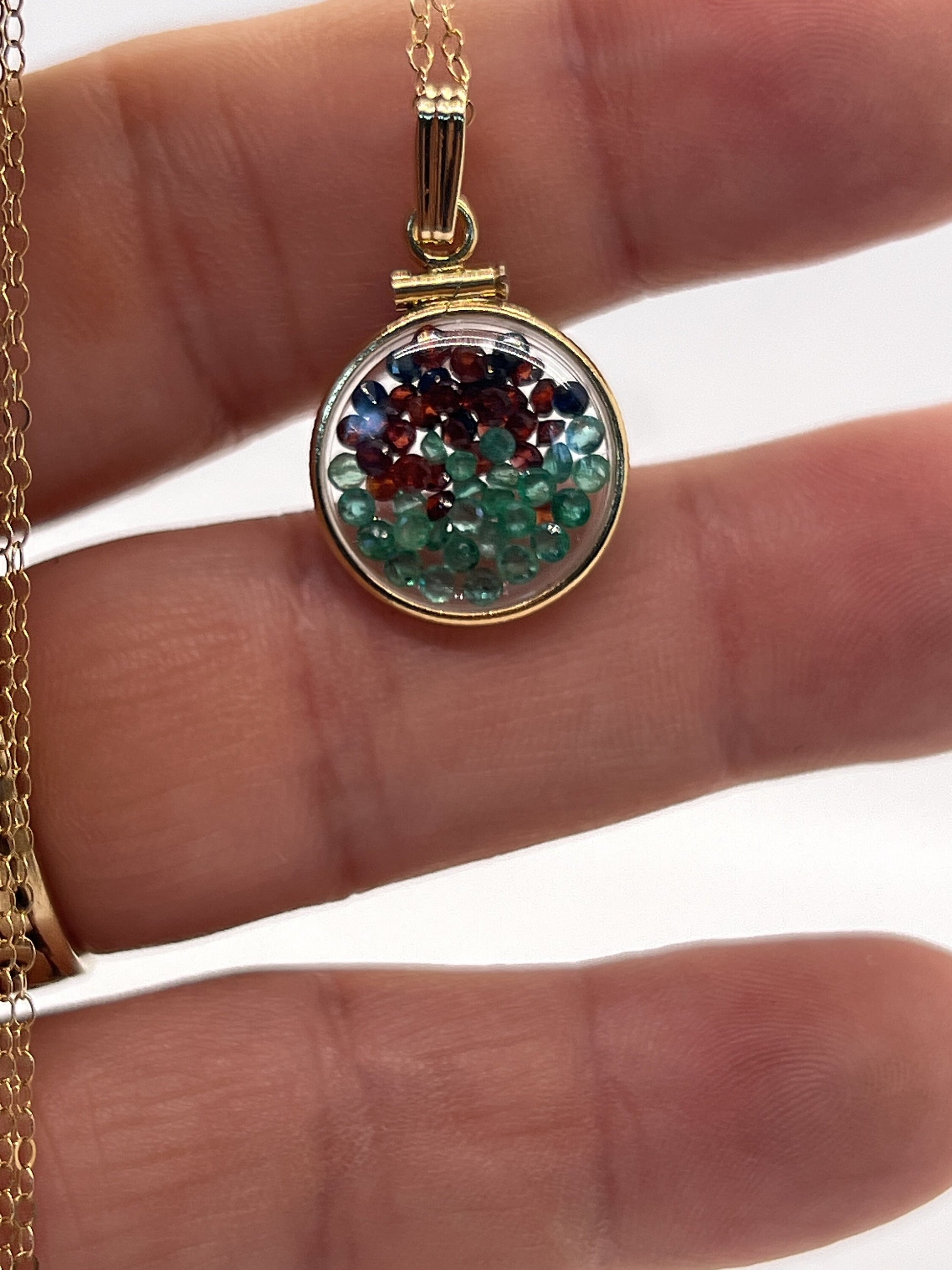 Solid 14k Gold Lucite Handmade 4.4 TCW mix of garnet, emerald, sapphire Shaker Locket. Round cut Colorful gems. Artistic Series- beautiful