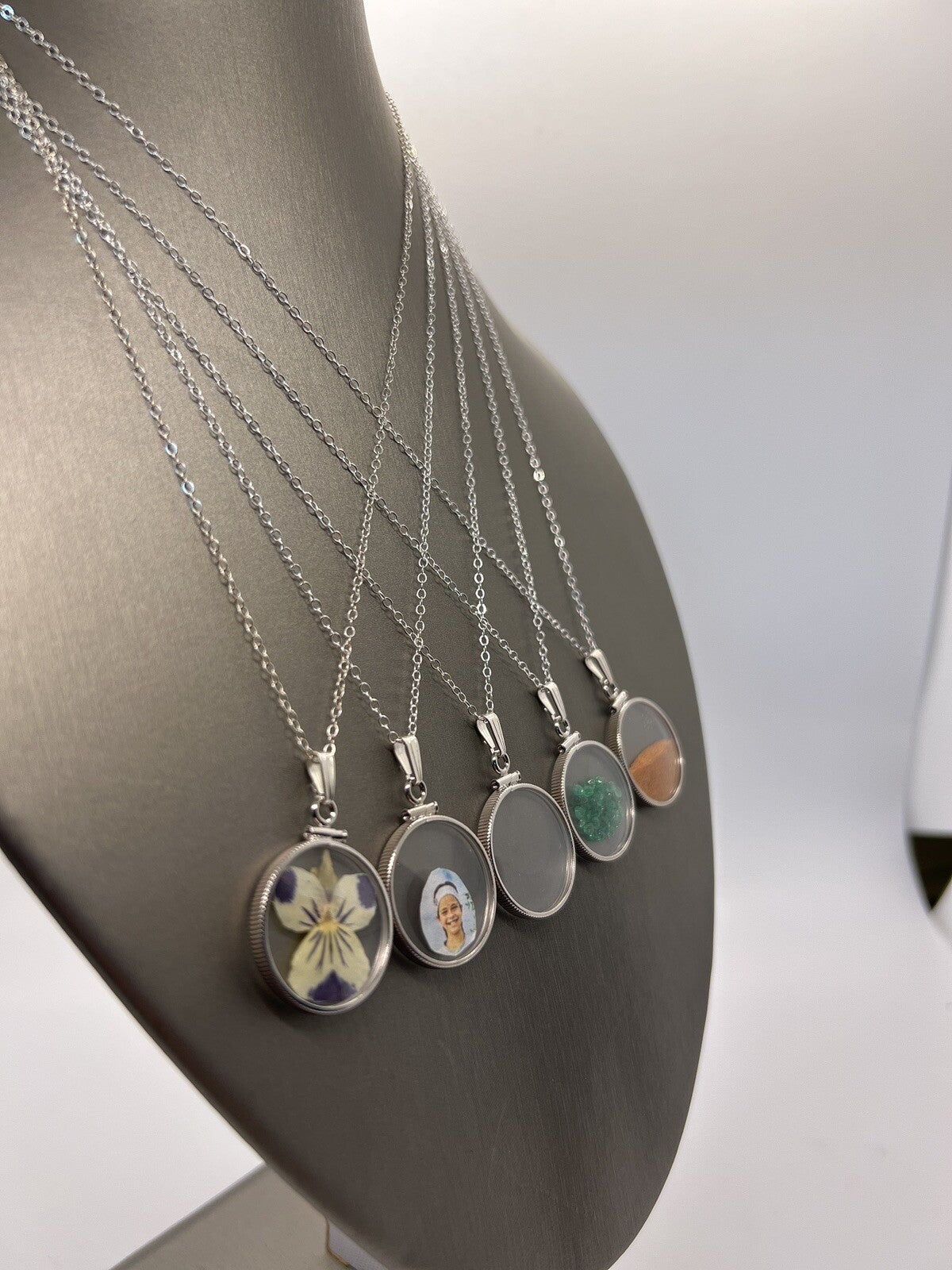 Up for sale: NEW 20 mm Handmade empty sterling silver shaker locket. These lockets can be opened with a small screwdriver. They are new and comprised of a sterling silver bezel and two mineral glass covers and a sterling silver ribbed snap bail. Choose to add a 16-24 inch sterling silver cable chain at checkout or purchase with locket only-no chain. This shaker locket can be viewed from both sides and and will store and display your little treasures. You can put gems, ashes, gold, hair, anything you can imagine. The pocket of space is small but works nicely for tiny items. Featured as examples are: an empty locket, sand, a small pressed flower, and 1.5 tcw of 2mm round cut emerald gems and a small photo.